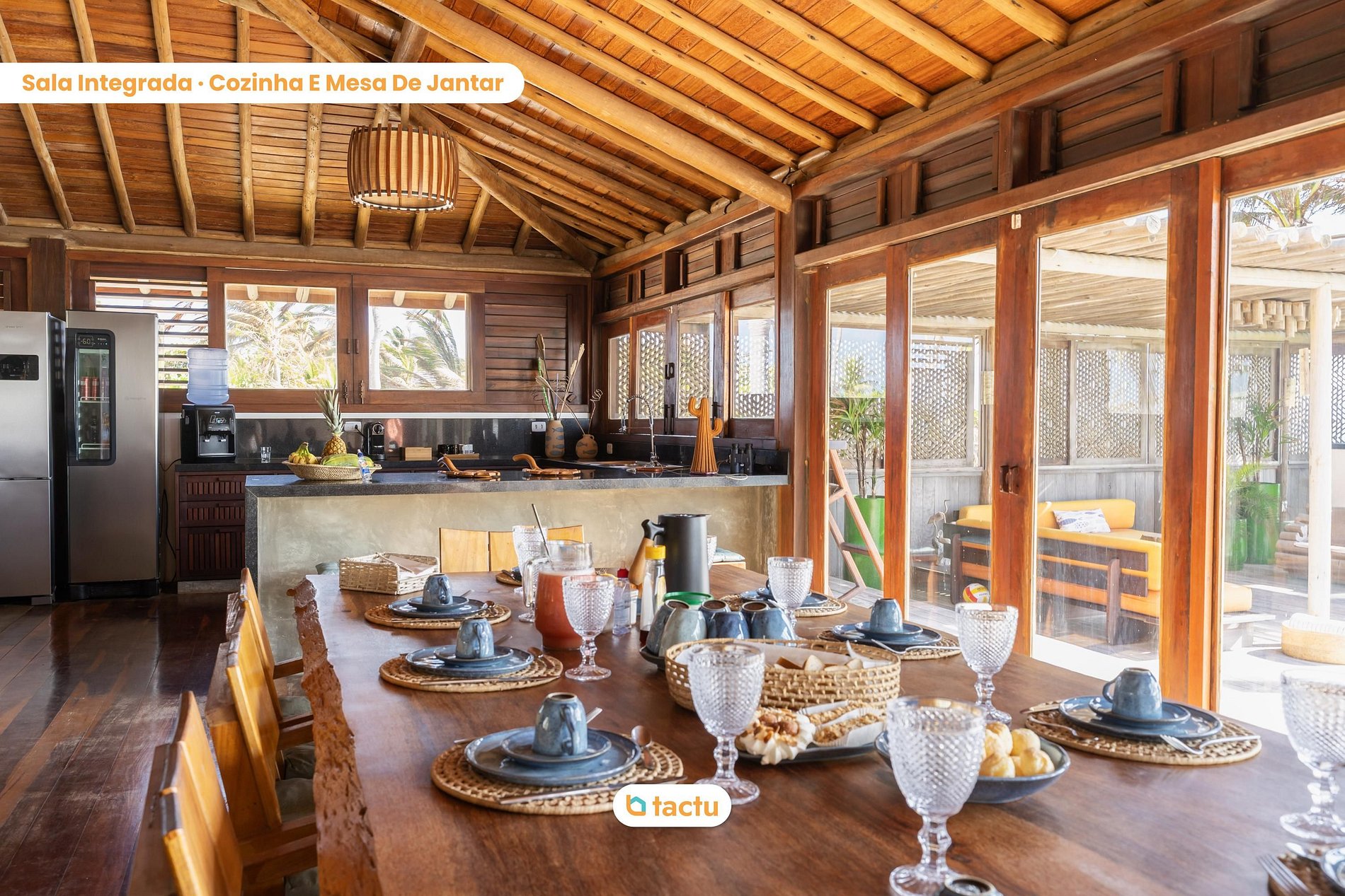 In the social area, guests will find a spacious open-plan living room with a fully equipped kitchen, ideal for gathering around the table. The environment preserves a rustic yet sophisticated charm, with wooden structures, high ceilings, and warm lighting. The kitchen is equipped with modern appliances, two refrigerators, coffee makers, an oven, a cooktop, and all utensils needed to prepare meals with style and ease.