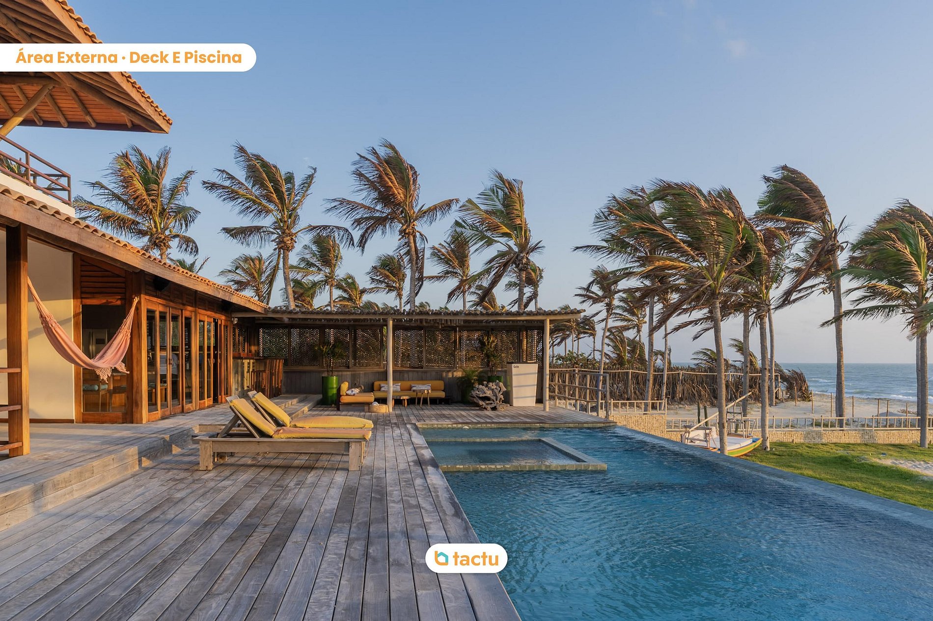 The outdoor area is truly special. The wooden deck with an infinity pool and jacuzzi opens directly to the beach, creating a seamless connection between comfort and nature. The gourmet area includes a barbecue, bar, and lounge space, perfect for long lunches or dinners at sunset. There is also an outdoor game room with a foosball table, bean bags, and wooden furniture that invites relaxation and fun.