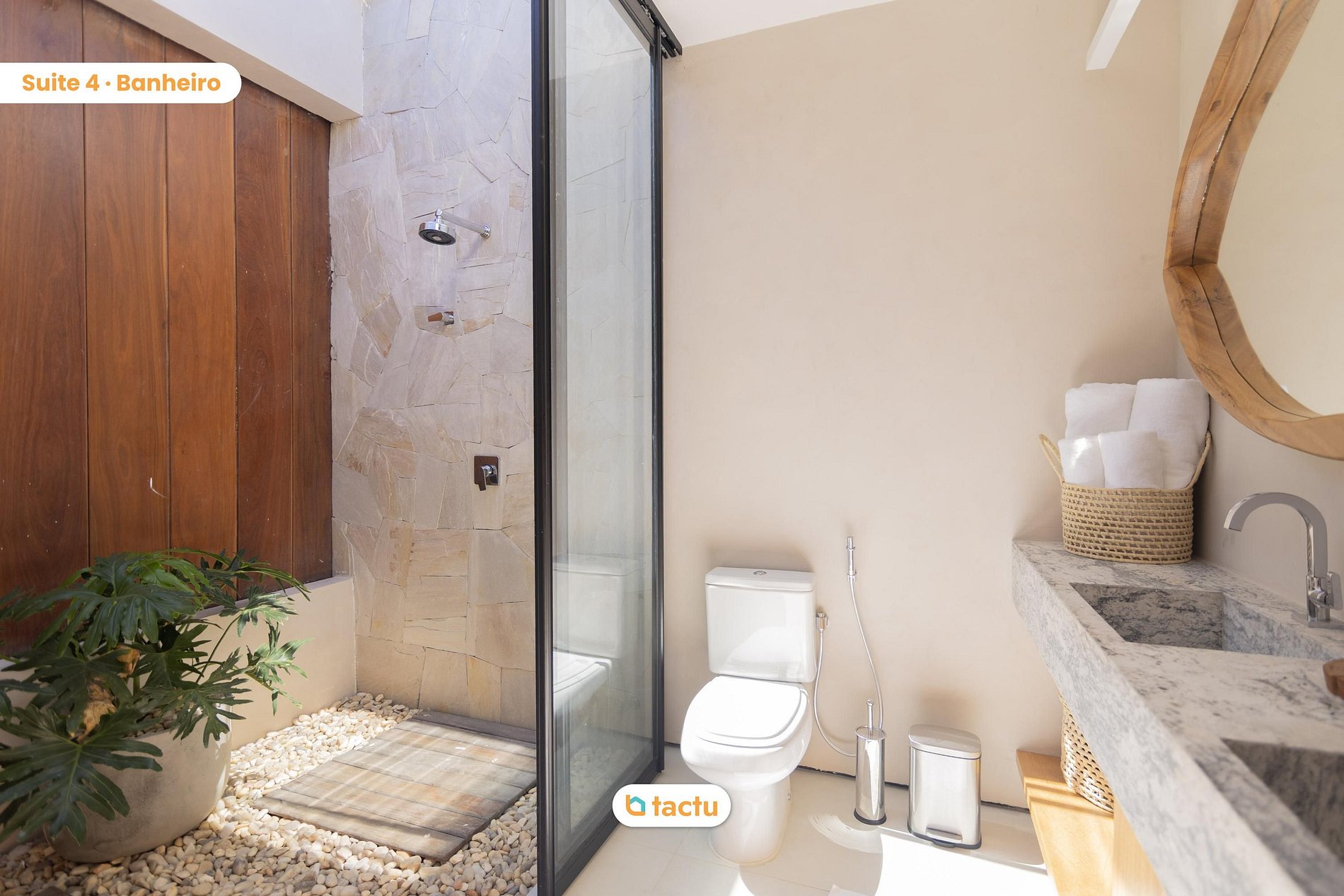 The house accommodates up to 8 adults and was designed with full integration between indoor and outdoor areas, combining wood, stone, and tropical vegetation. The outdoor area invites relaxation, featuring a private pool, loungers, hammock area, garden with palm trees, and an outdoor dining table under a charming pergola.