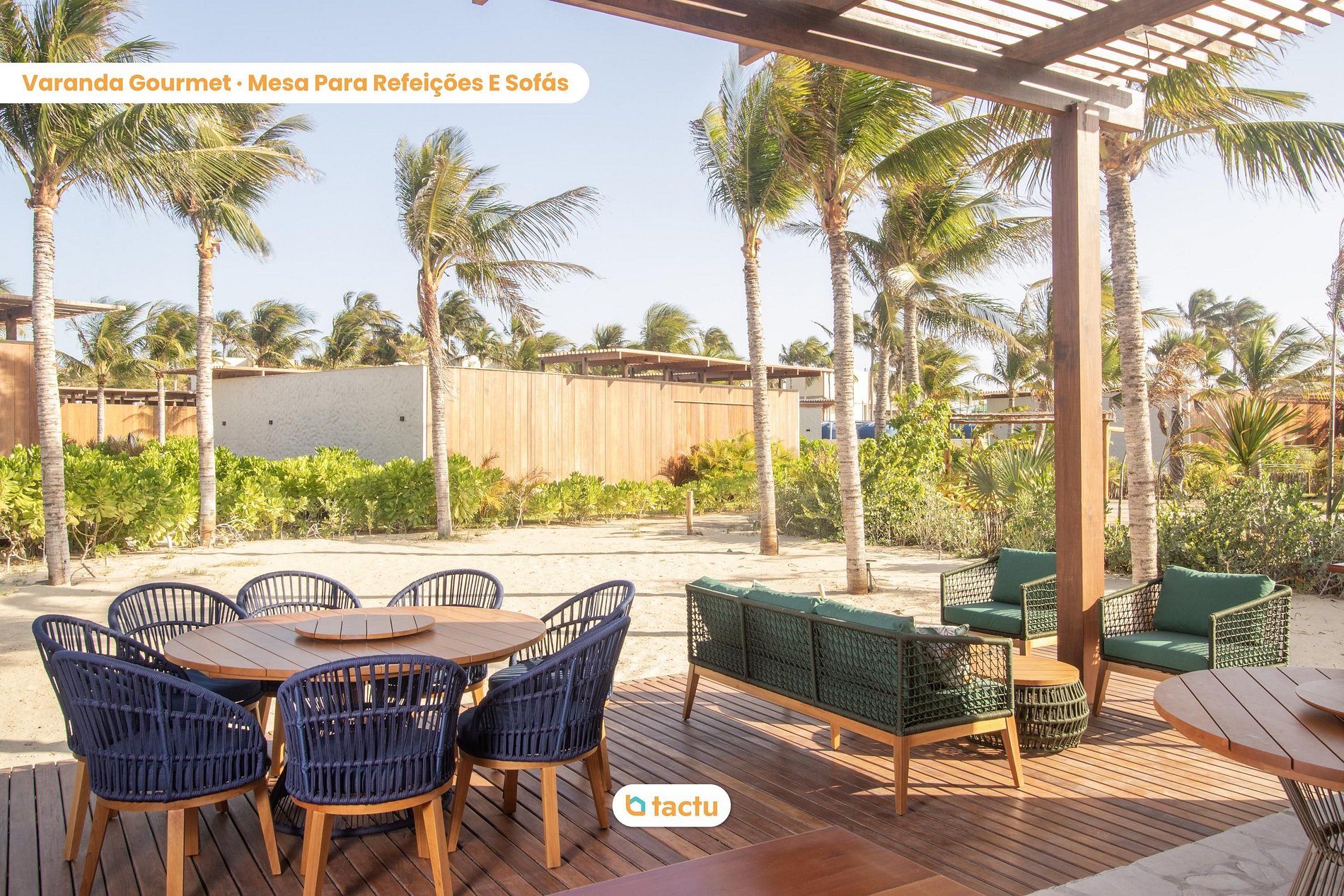 Outdoors, the highlight is the deck with a gourmet veranda, equipped with a dining table, sofas, and a charming view of the garden and beach, the perfect setting for moments of relaxation and connection.