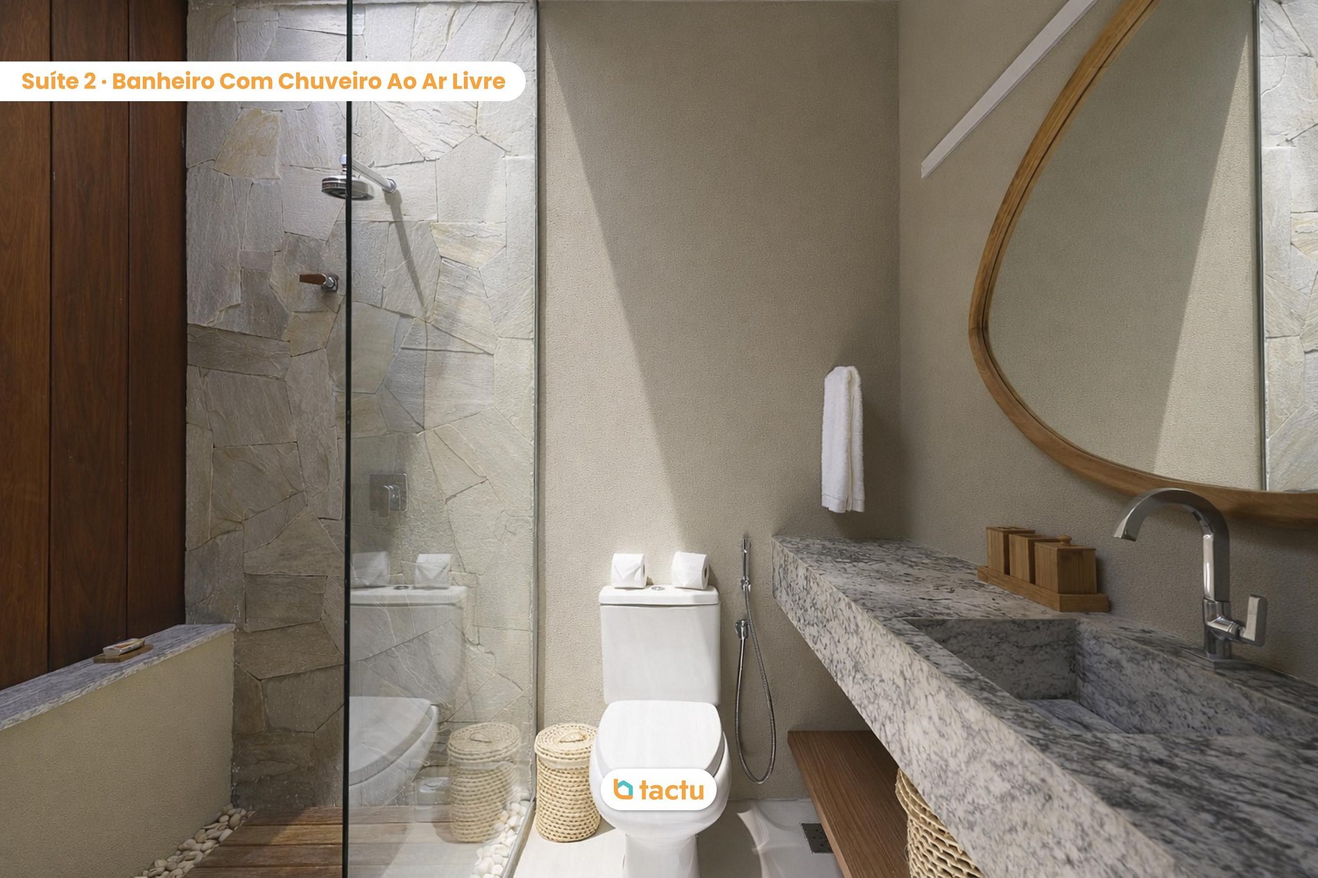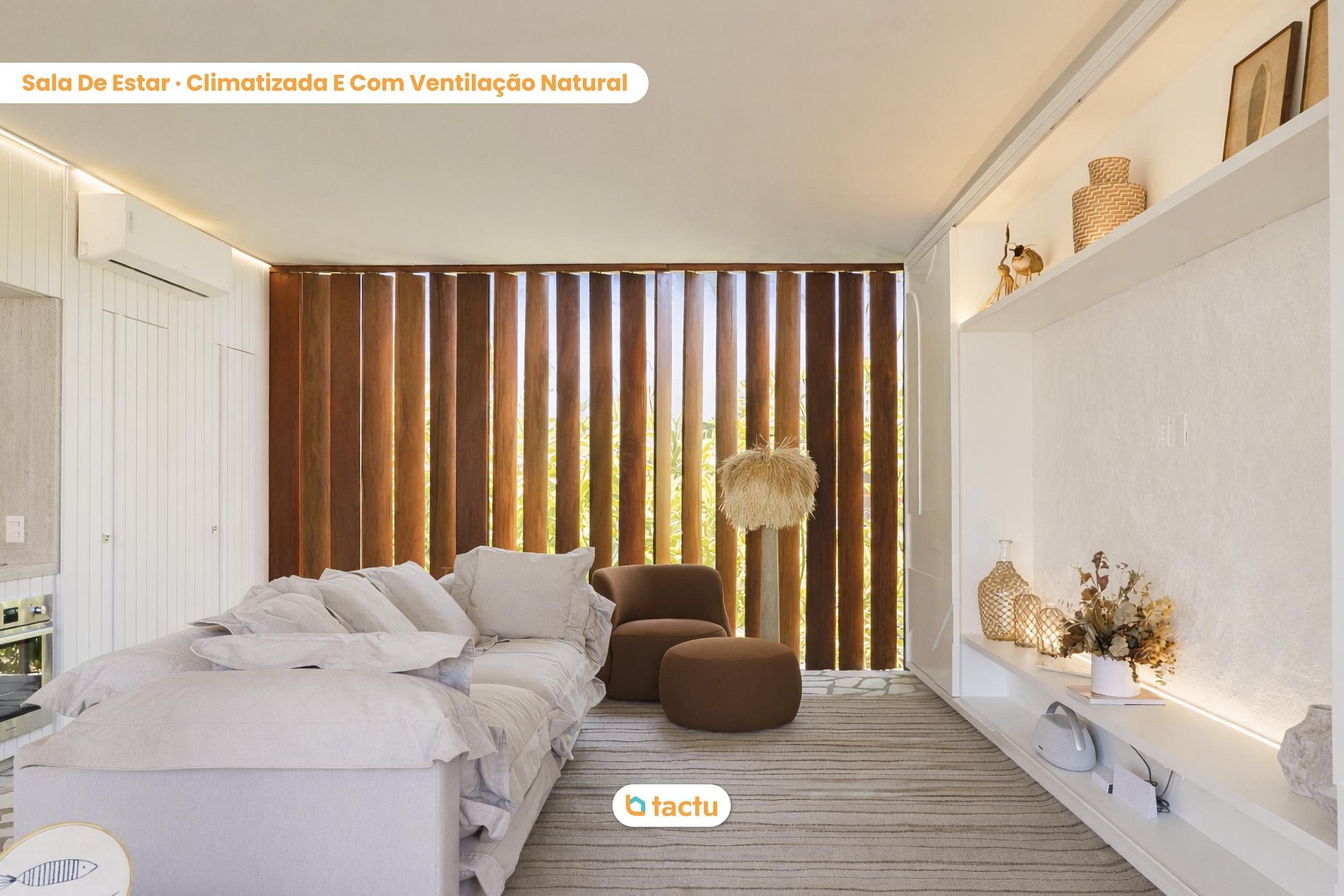 House 26 at Origem, in Fortim, is the perfect setting for days of rest with comfort and sophistication. Surrounded by palm trees and lush nature, it offers a private pool with a deck, two dining areas (one for 8 people with a sunshade and another main one for 10), an outdoor lounge with a sofa and armchairs, four sun loungers, two futons, and a wooden playground with a playhouse and slide—ideal for families seeking leisure and exclusivity.