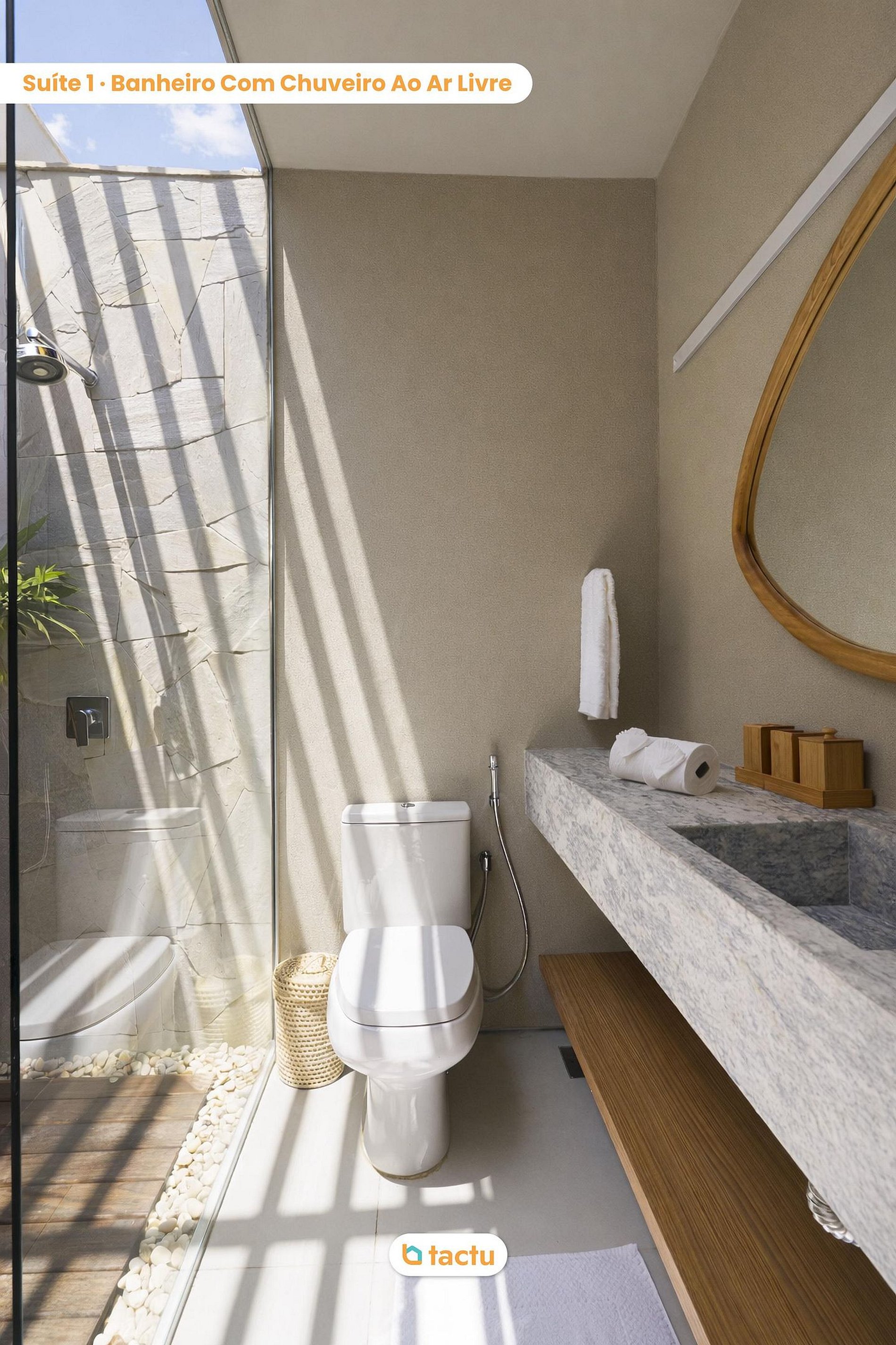 Casa 26 at Origem, in Fortim, is the perfect setting for days of relaxation with comfort and sophistication. Surrounded by palm trees and lush nature, it features a private pool with deck, two dining areas (one for 7 guests with a sun umbrella and a main table for 10), an outdoor lounge with sofa and armchairs, four sun loungers, two futons, and a wooden playground with a playhouse and slide — ideal for families seeking leisure and exclusivity.