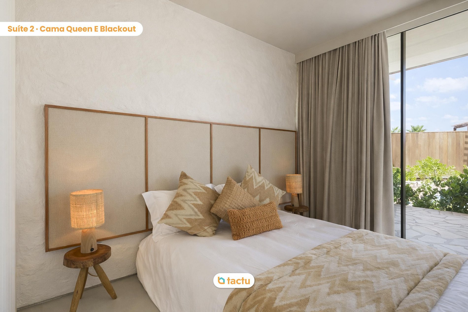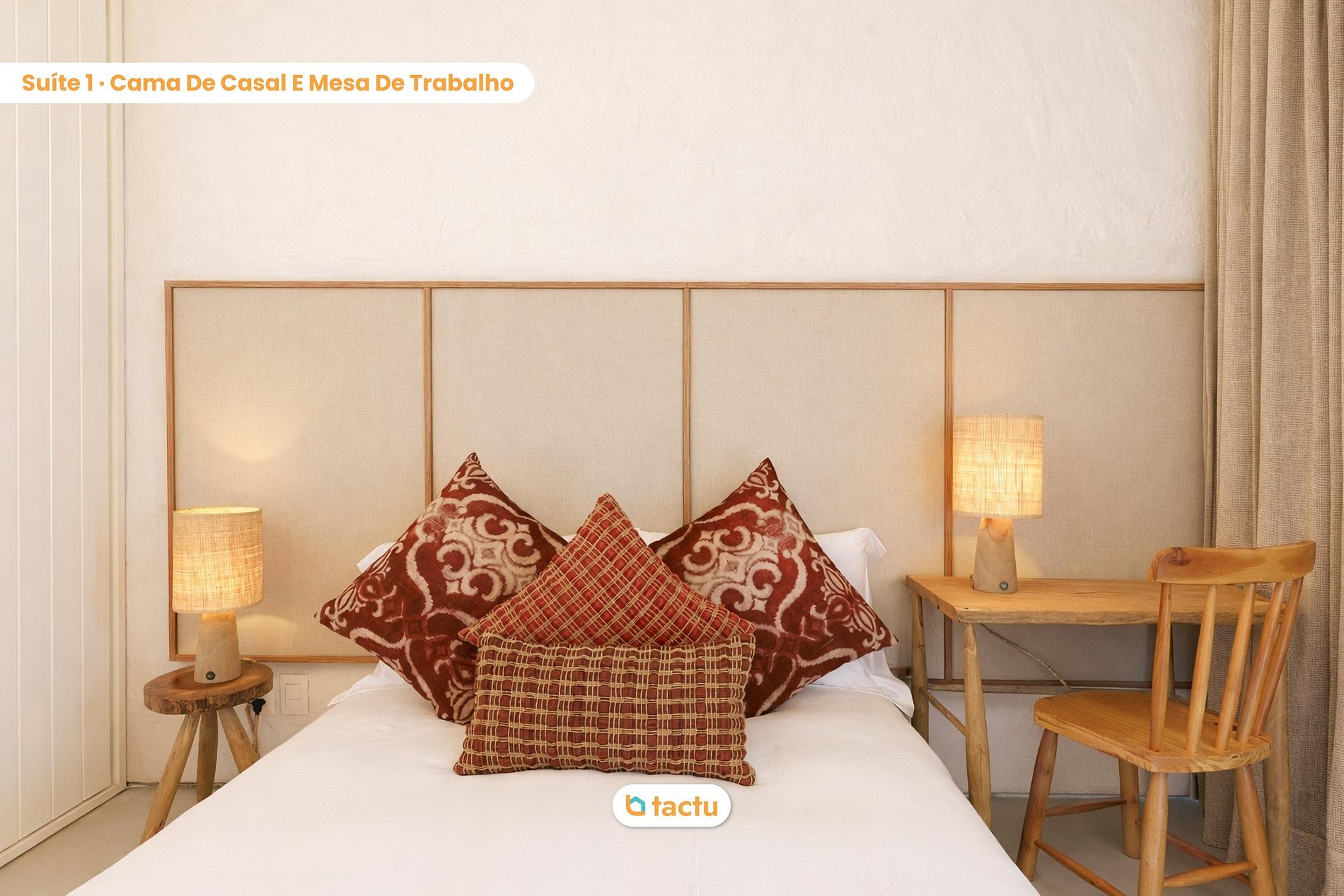 The house offers 4 air-conditioned suites, all with blackout curtains to ensure restful nights. Suite 1 has a king-size bed; Suites 2 and 4 feature queen-size beds; and Suite 3 offers a standard double bed and a desk suitable for studying or working. All suites include storage and bedside tables with lamps, combining comfort and functionality in every detail.