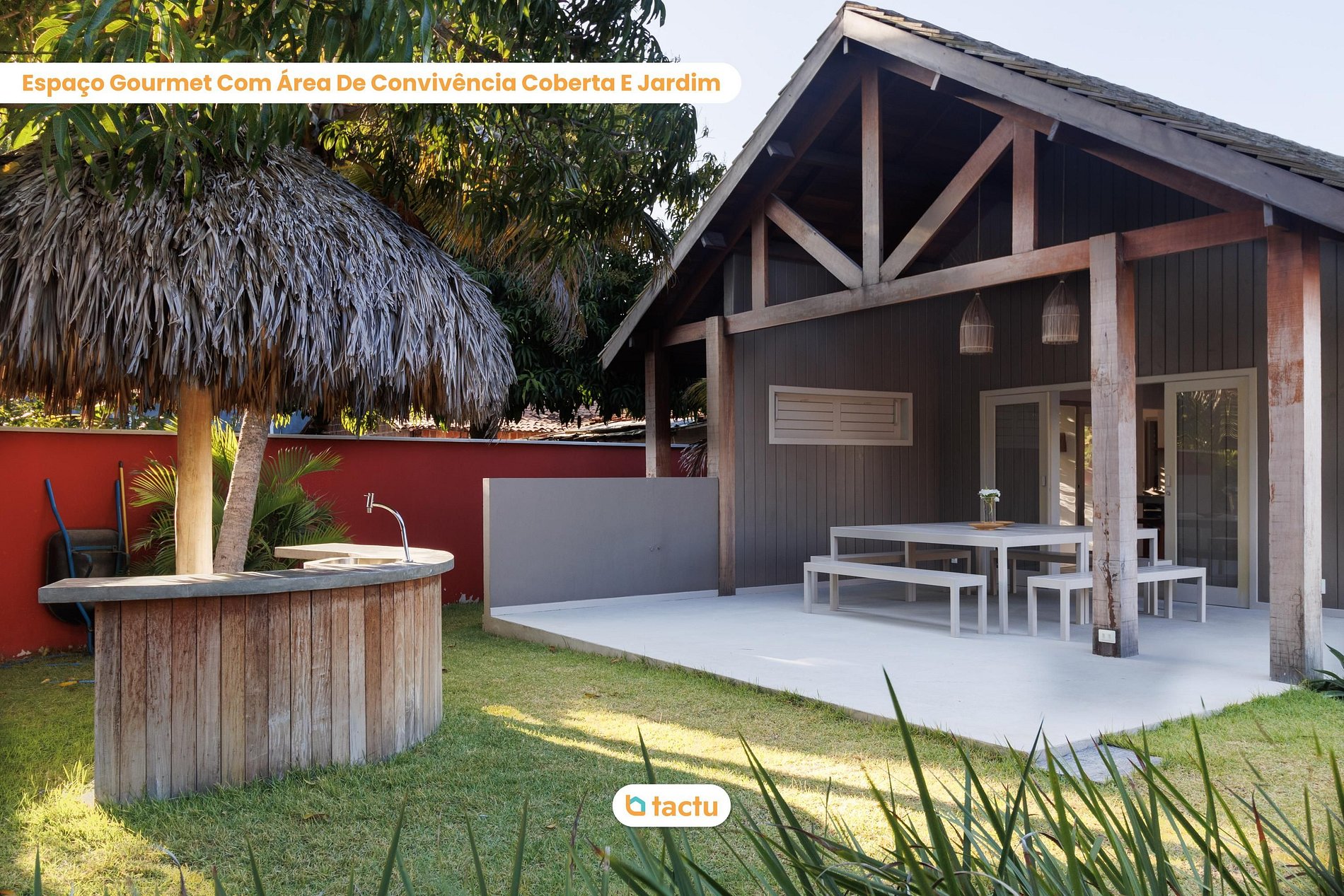 Another highlight is the outdoor living space, with a covered veranda, large table, and a charming thatch-roofed bar, perfect for moments of relaxation with friends and family. The decor blends rustic and modern elements, harmonizing comfort with the feeling of being immersed in nature.
