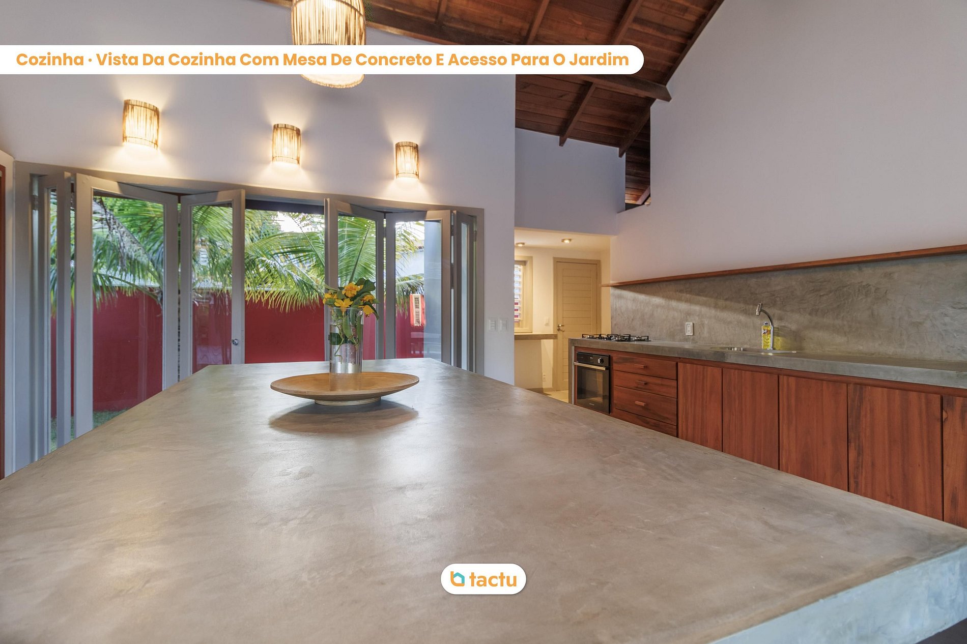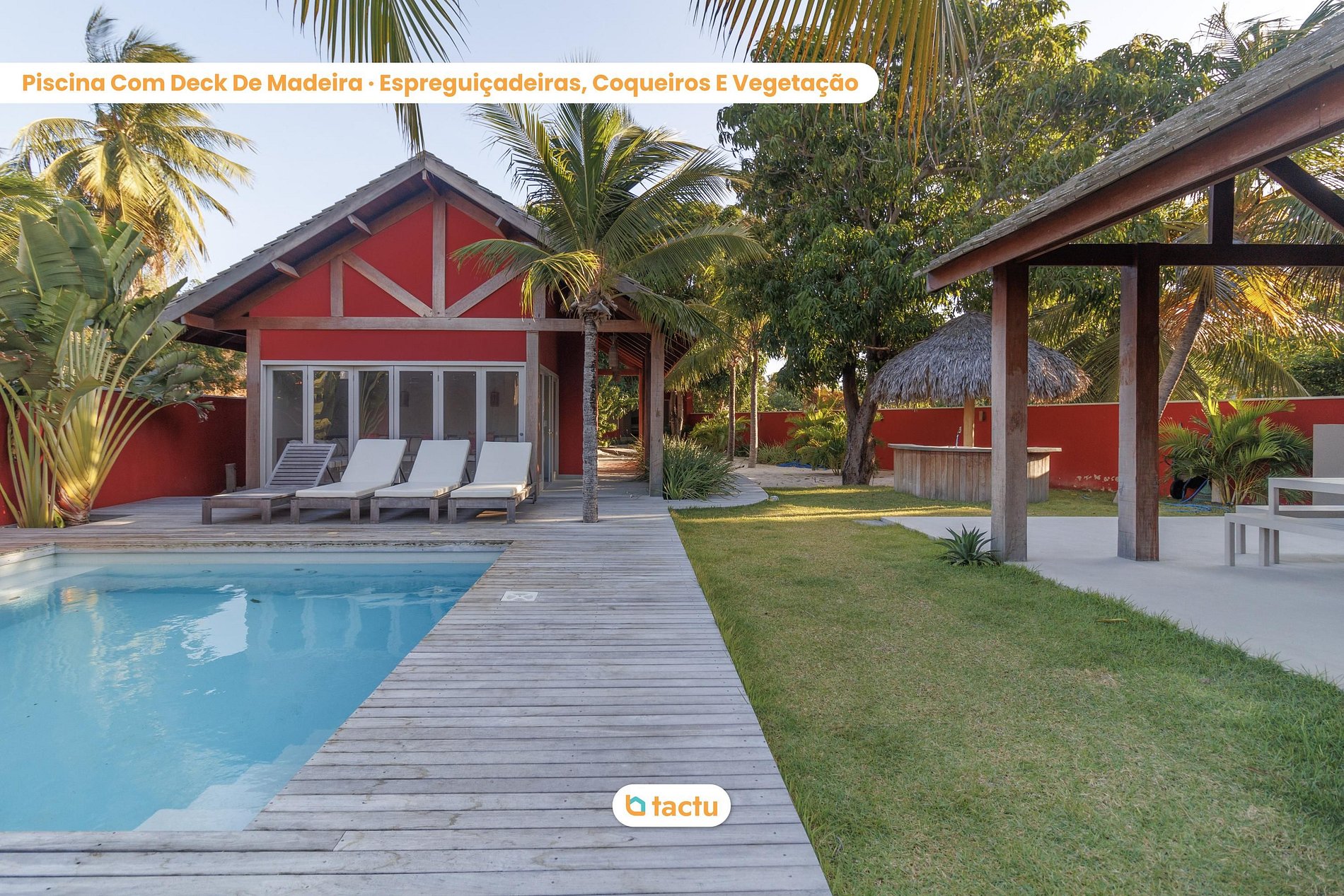 The fully equipped kitchen is perfect for preparing meals while enjoying the view of the lush garden. The outdoor area features a pool surrounded by palm trees and a wooden deck with lounge chairs, creating a relaxing environment ideal for soaking up the sun.