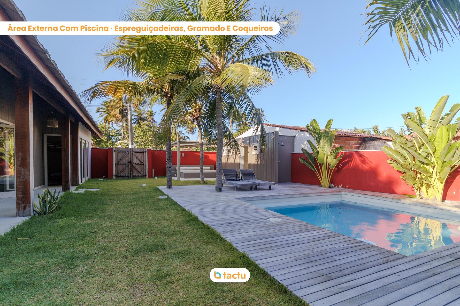 The fully equipped kitchen is perfect for preparing meals while enjoying the view of the lush garden. The outdoor area features a pool surrounded by palm trees and a wooden deck with lounge chairs, creating a relaxing environment ideal for soaking up the sun.