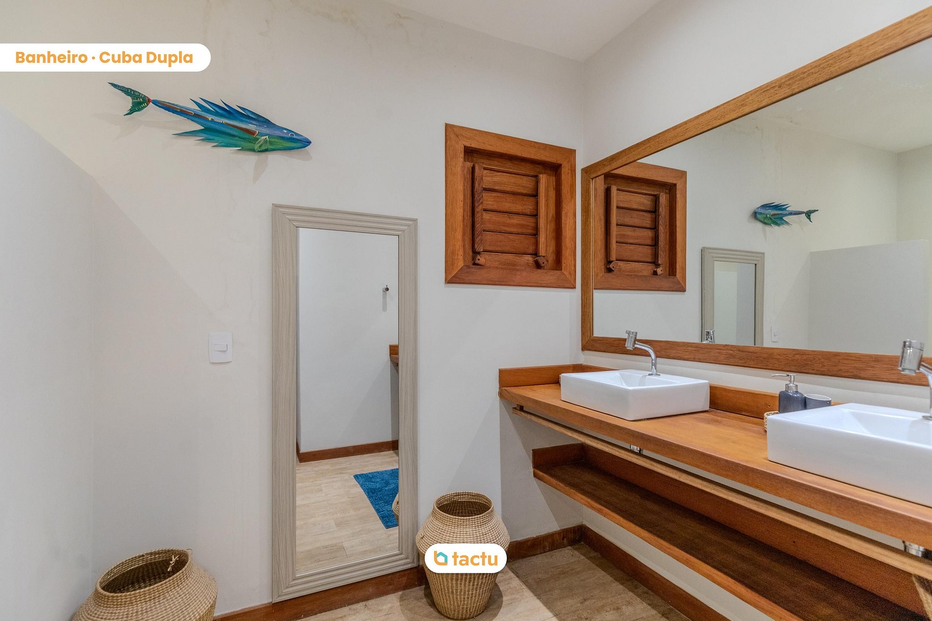 Inside the villa, the living room is sophisticated and welcoming, decorated with niches showcasing elements of nature and the sea. The furniture was chosen to combine comfort and style, creating a space conducive to relaxation and socializing. With natural lighting and good air circulation, the living room is the perfect place to unwind after a day at the beach.