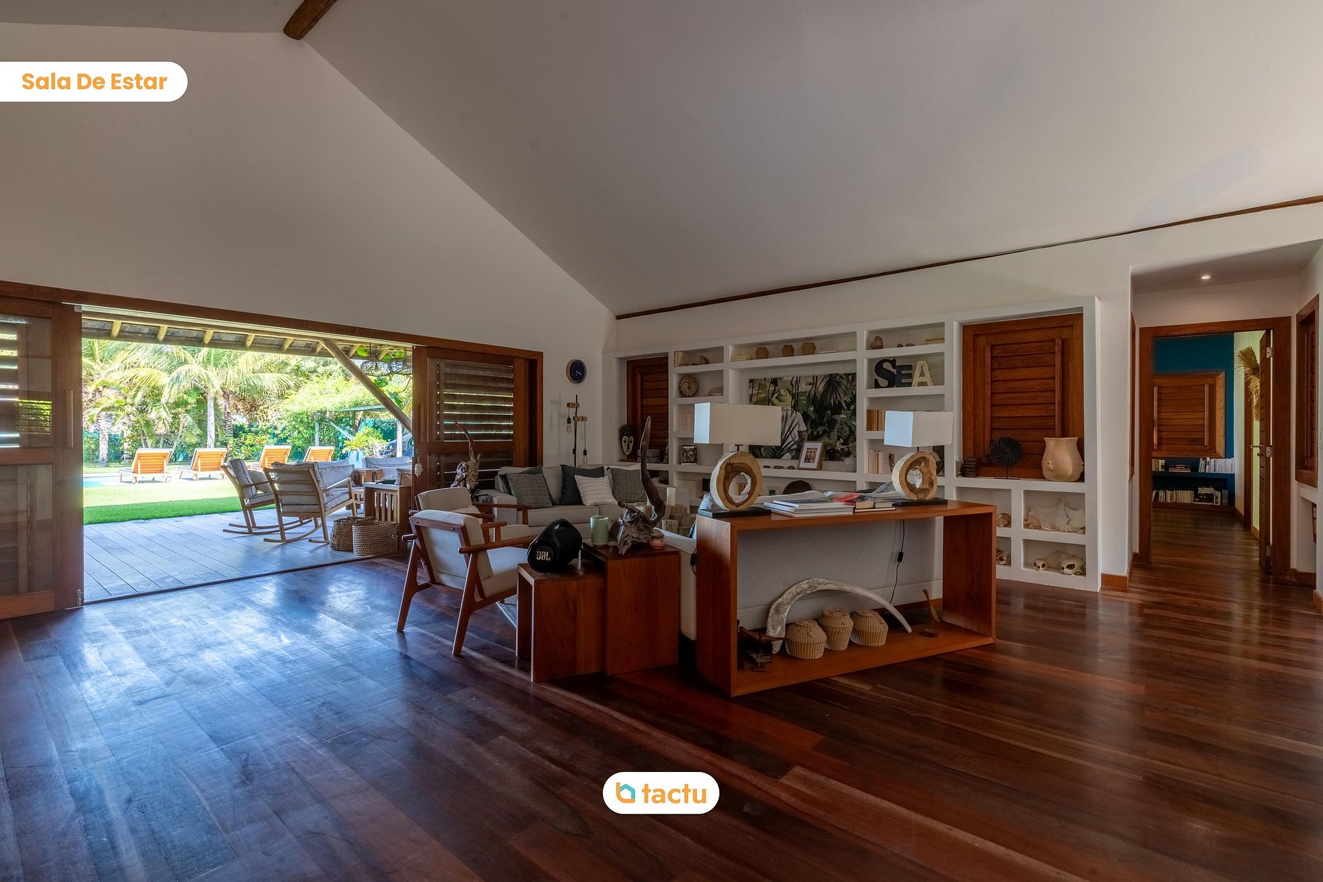 Inside the villa, the living room is sophisticated and welcoming, decorated with niches showcasing elements of nature and the sea. The furniture was chosen to combine comfort and style, creating a space conducive to relaxation and socializing. With natural lighting and good air circulation, the living room is the perfect place to unwind after a day at the beach.