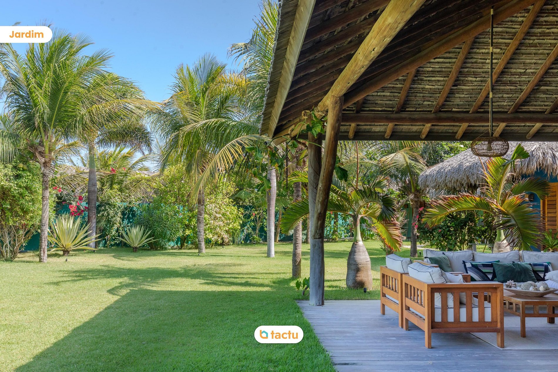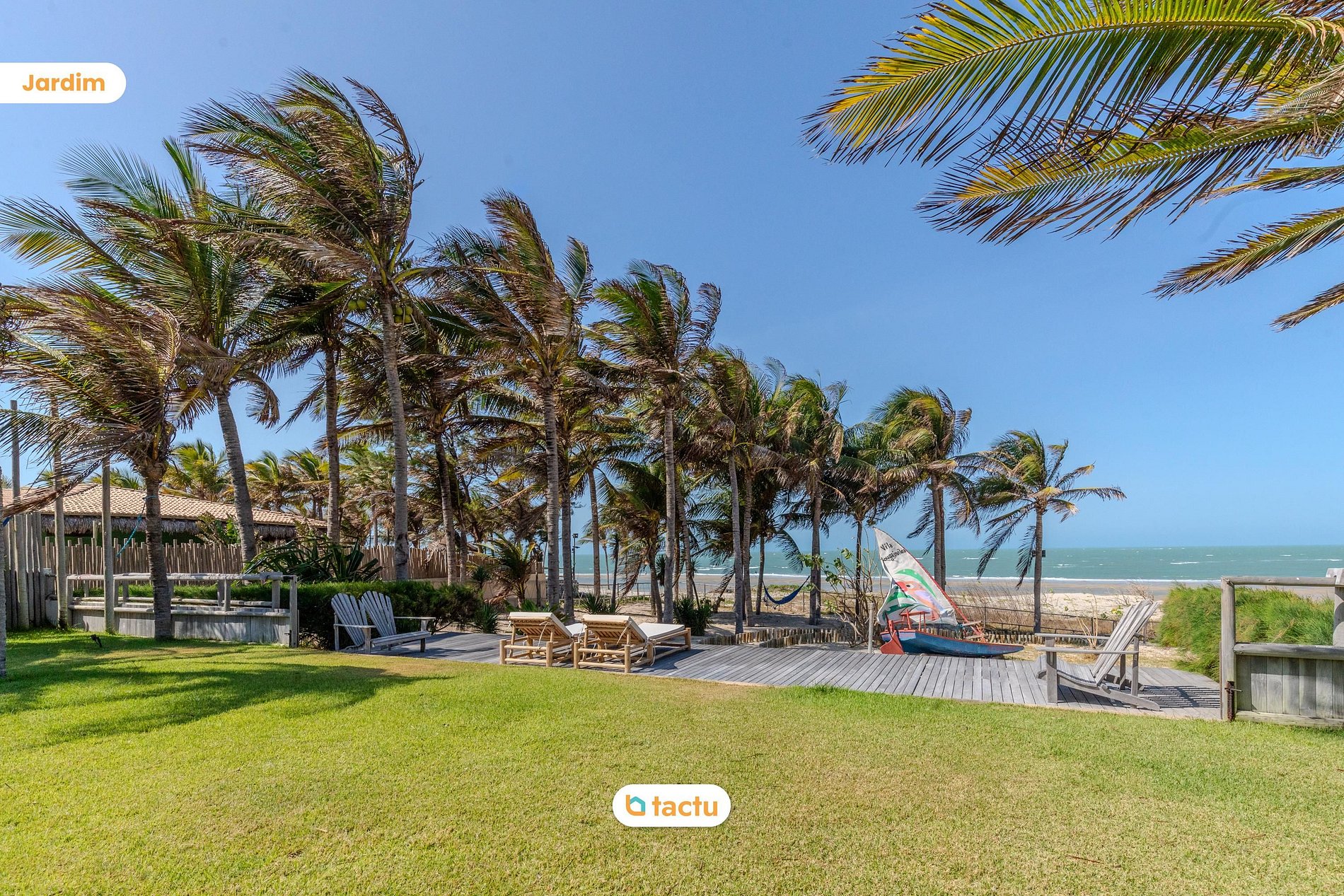 The spacious garden, filled with coconut trees and tropical plants, creates an atmosphere of peace and privacy. Just steps from the sea, the villa offers a stunning, uninterrupted view of the ocean and private beach access, ensuring an exclusive and tranquil experience. Rest areas, including hammocks and strategically placed chairs, allow guests to relax to the sound of the waves and enjoy the fresh breeze.