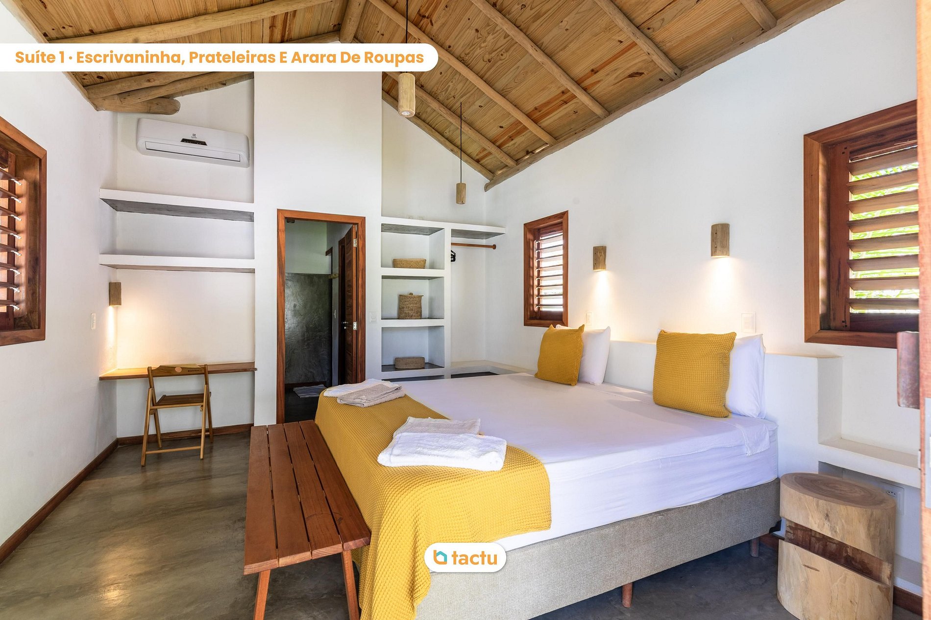The house offers four comfortable suites, all with independent access to the outside and equipped with air conditioning. Two of the suites are versatile and can be set up with a king-size bed or two single beds — perfect for families or groups of friends. They share a large and functional bathroom. The other two suites feature king-size beds and ensure total privacy and comfort.