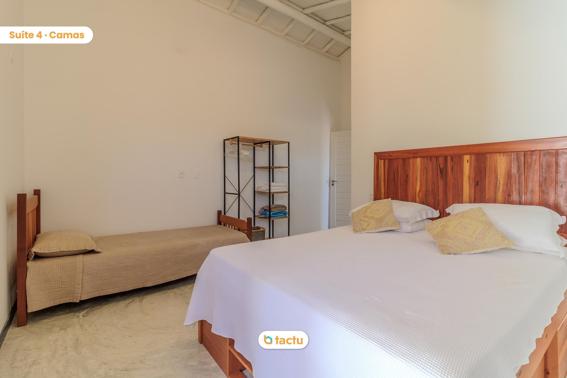Additionally, the house has 4 suites, all air-conditioned and well-decorated. The beds have special Queen mattresses that will provide you with excellent nights of sleep. Two of these suites are in the main house, and the other two are in separate chalets, which also have single beds in addition to the double beds. Each chalet has a mezzanine with rest areas facing the pool, perfect for catching the sea breeze. The main house also has a bedroom with two single beds, allowing for a comfortable stay for up to 10 people.