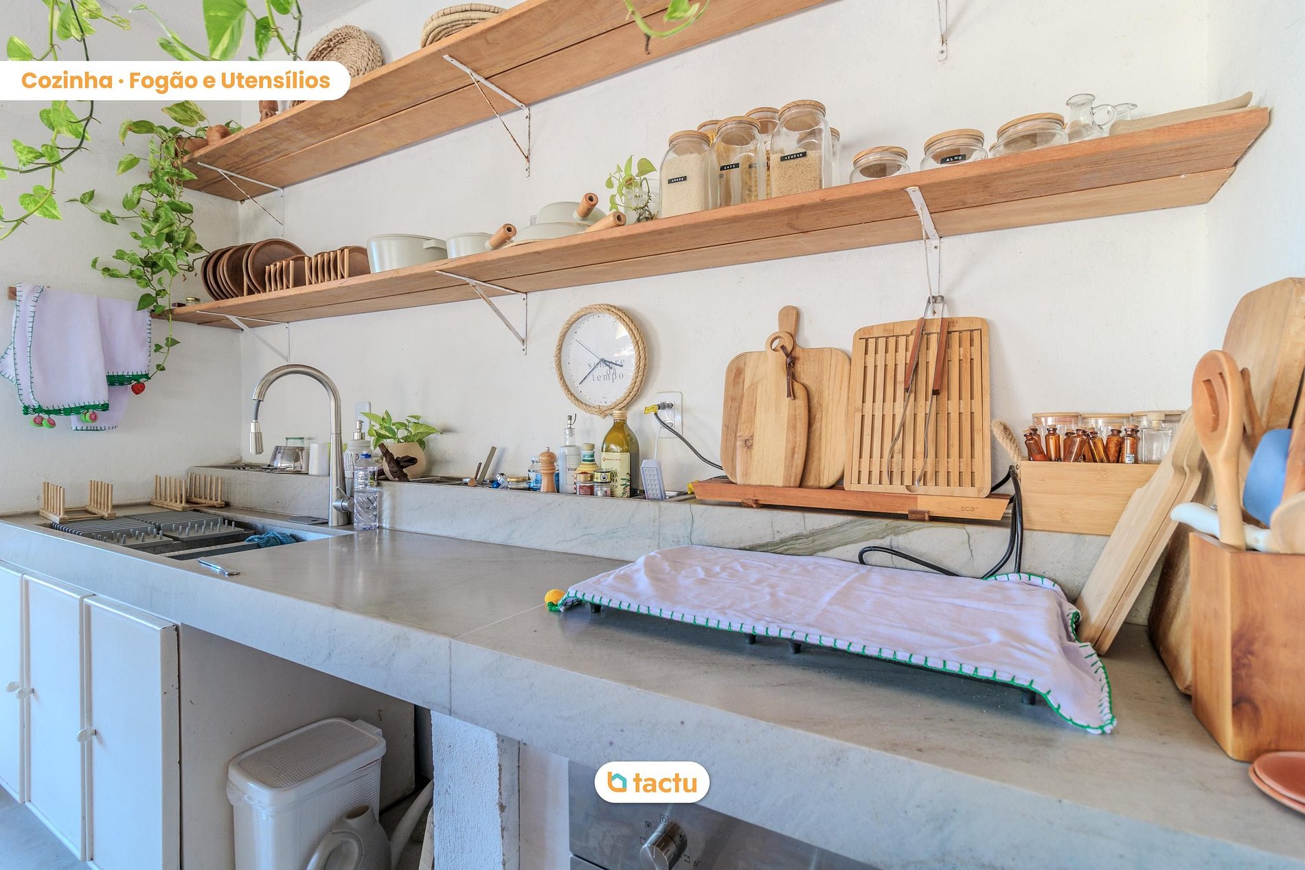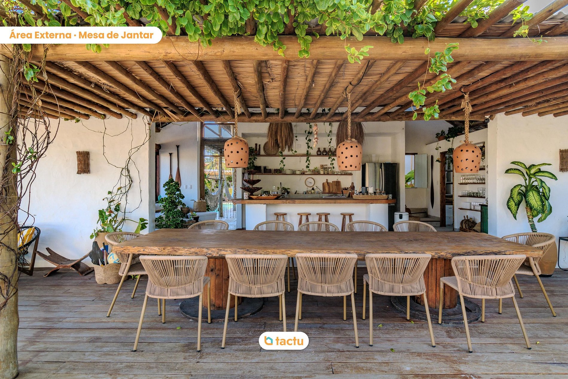 En el interior, los espacios son amplios e integrados. La cocina, el salón y el comedor se conectan en armonía con el jardín, formando un ambiente completo y funcional. La gran mesa de comedor recibe con comodidad a grupos grandes para compartir comidas, incluido el delicioso desayuno que ya está incluido en la reserva.