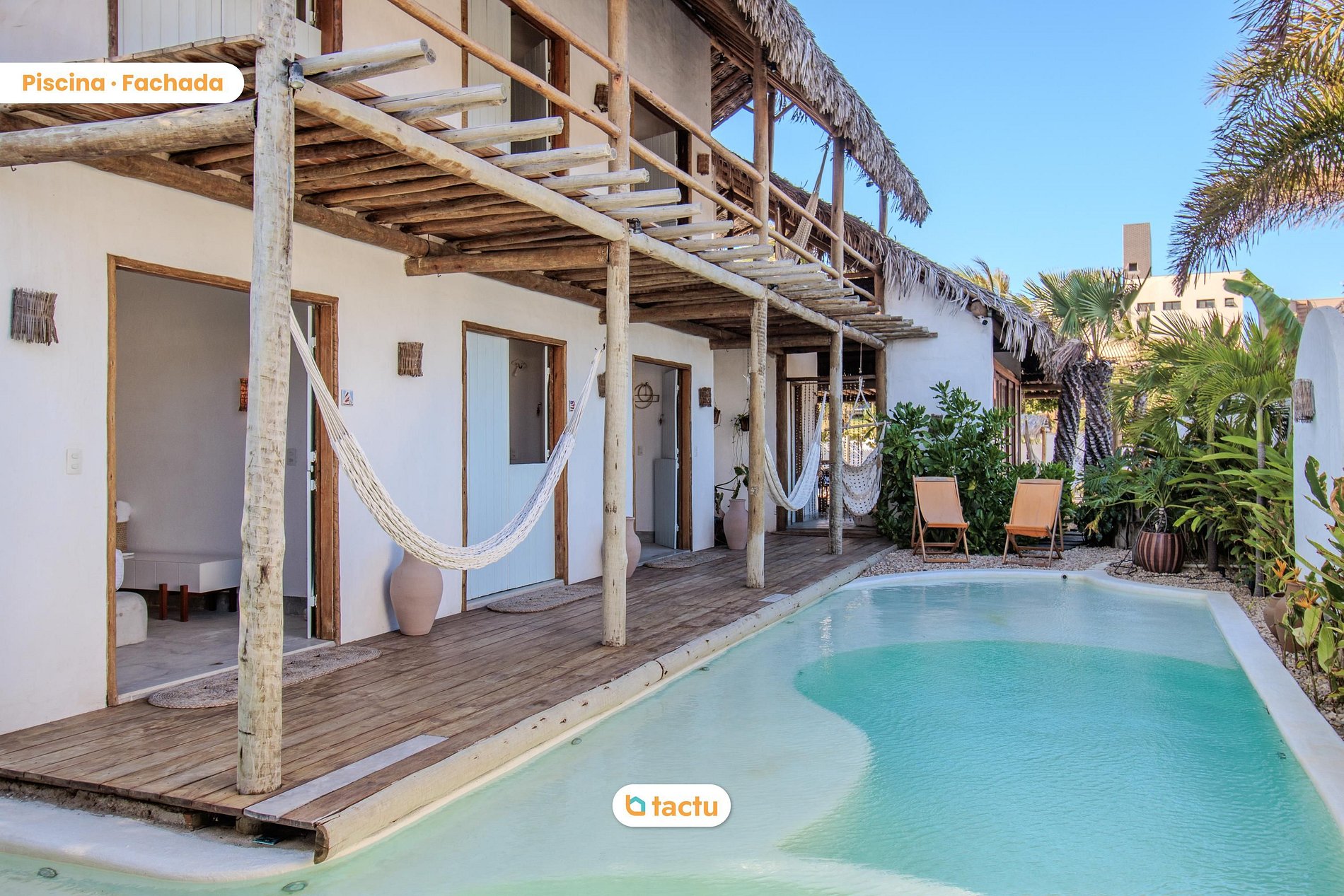 El área exterior invita al descanso: la piscina de formas orgánicas está rodeada de un hermoso jardín tropical, hamacas y sillas de playa que te permiten elegir entre sol y sombra al ritmo de la brisa. Al atardecer, la puesta de sol vista desde el jardín es un espectáculo aparte.