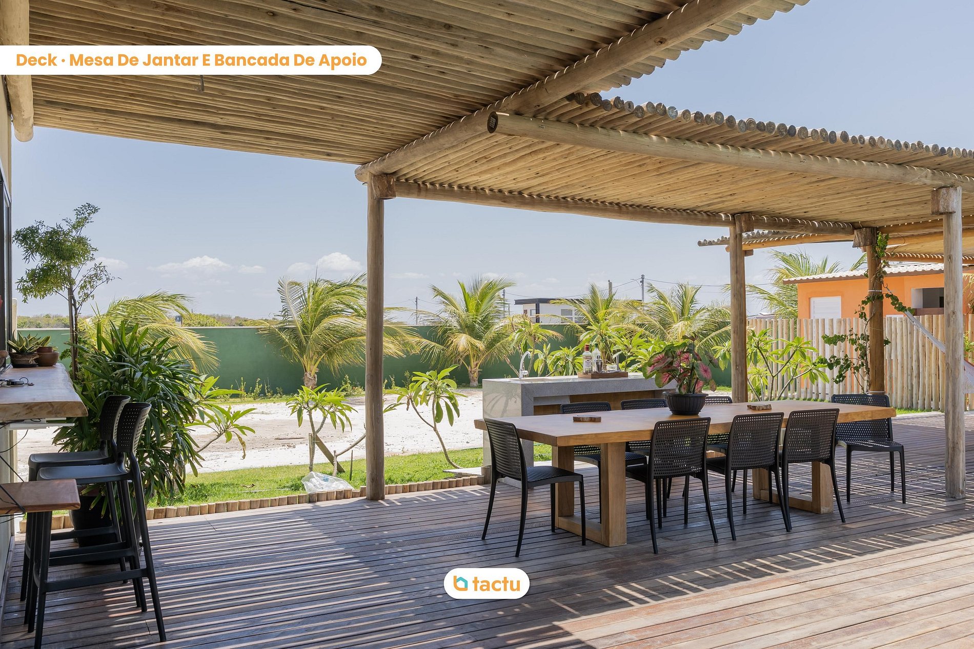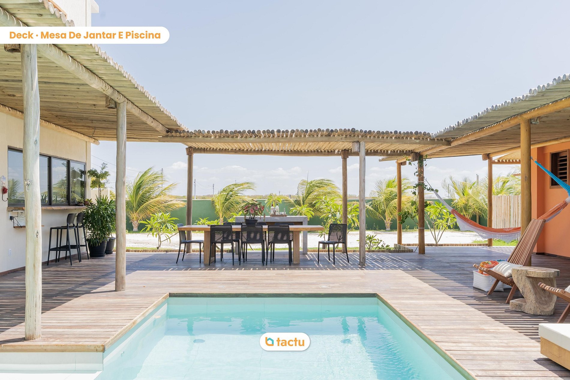 En el exterior, el deck de madera con piscina es el gran destaque, rodeado de hamacas y una mesa para disfrutar comidas al aire libre. El ambiente invita a relajarse bajo el sol y disfrutar de la brisa del litoral de Ceará.