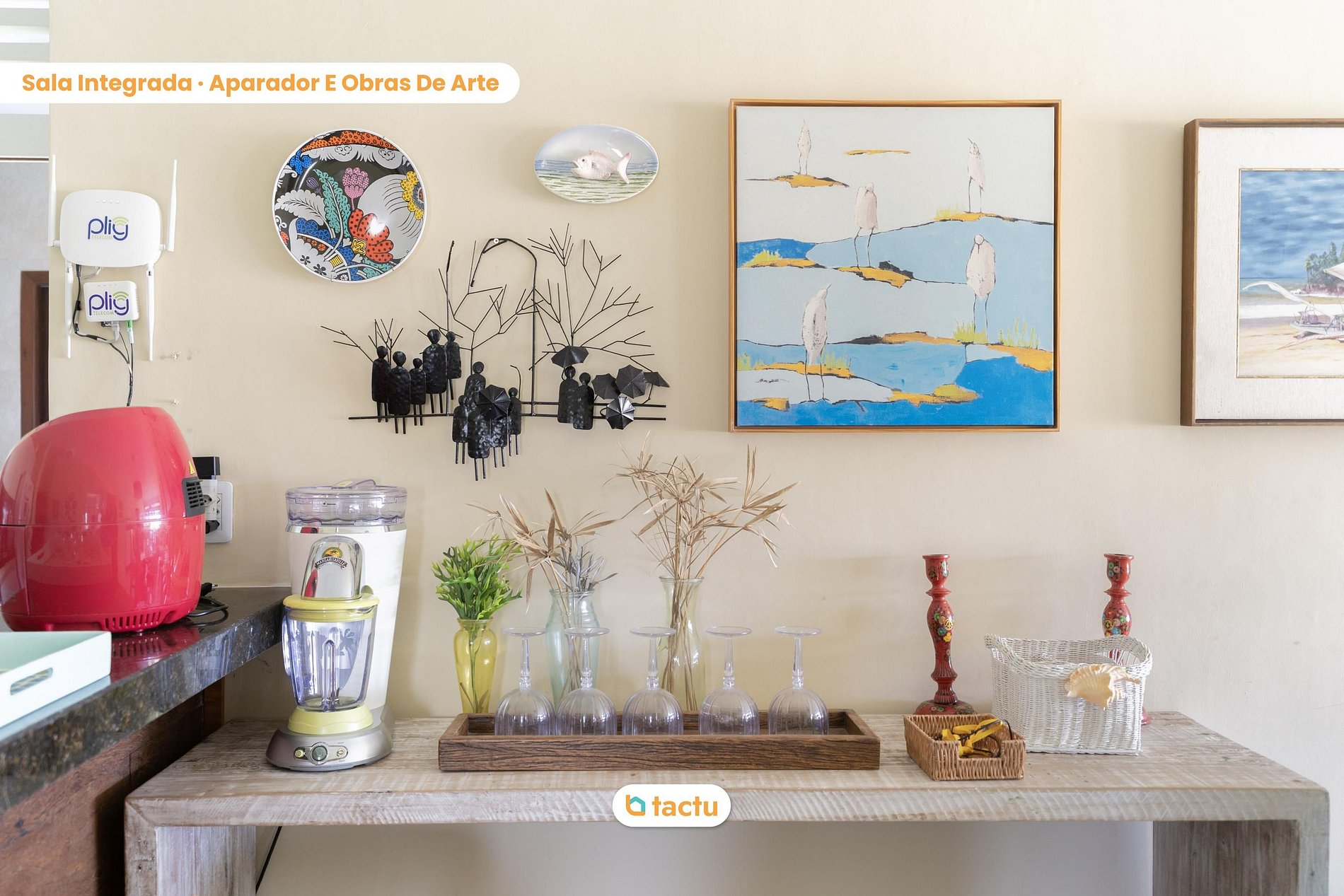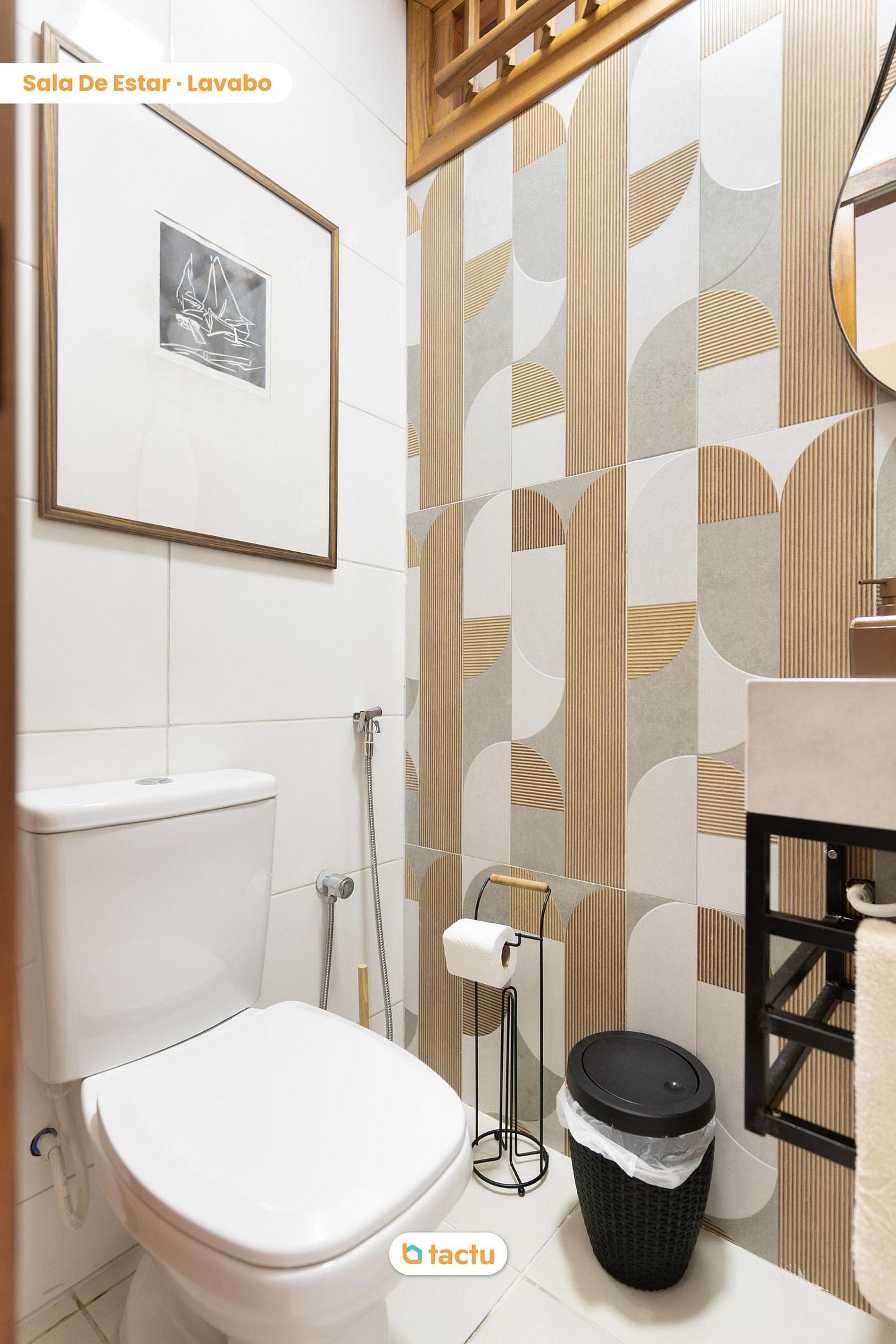 La sala de estar es acogedora y está equipada con sofá, sillón, mueble para TV, mesa de centro y TV de 40'', ofreciendo comodidad para momentos de ocio. Integrado a ella, el comedor cuenta con mesa para 5 personas y una barra con 3 taburetes que conecta con la cocina, permitiendo comidas prácticas y casuales. El área de bar y buffet permanece reservada al personal, manteniendo el espacio organizado.