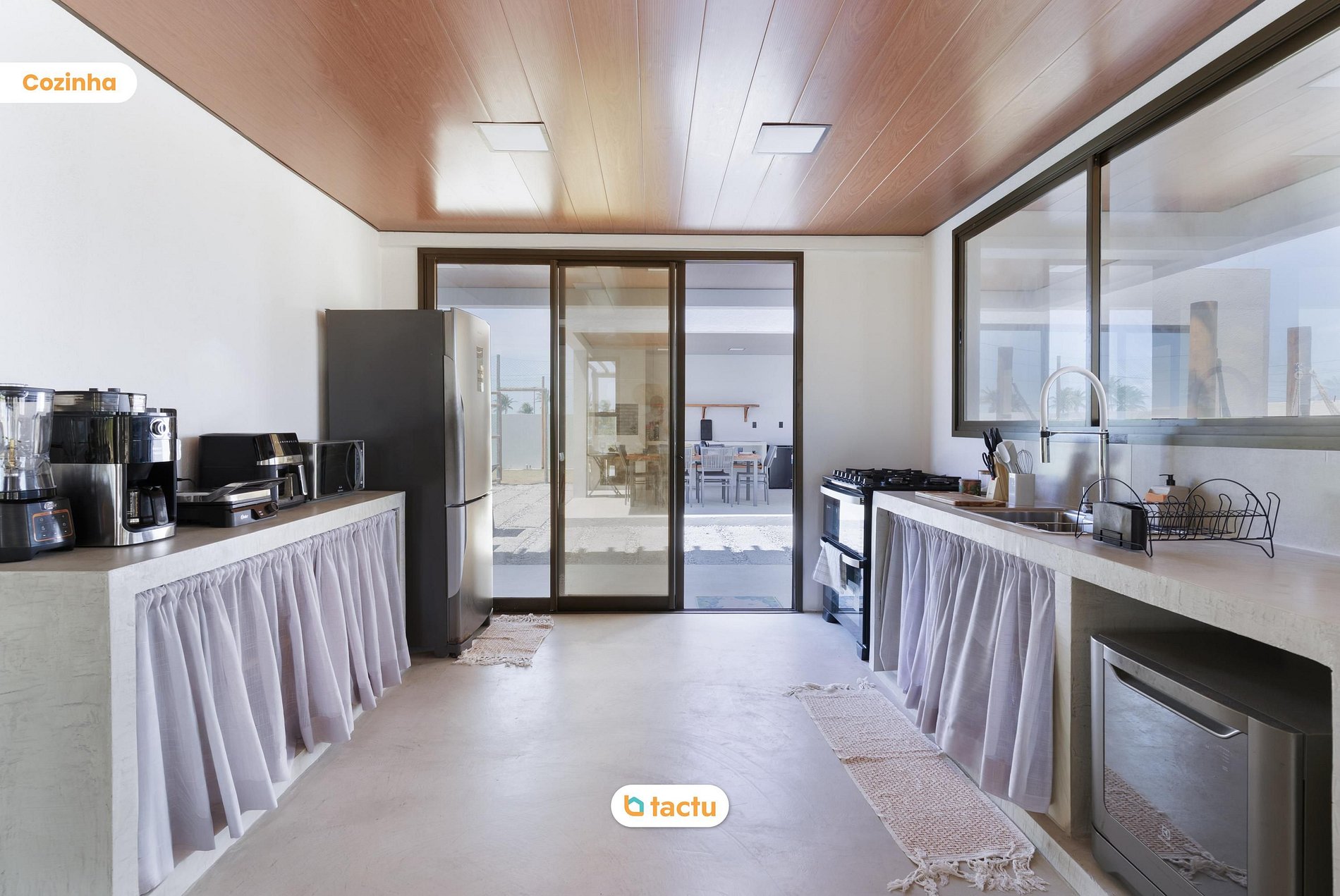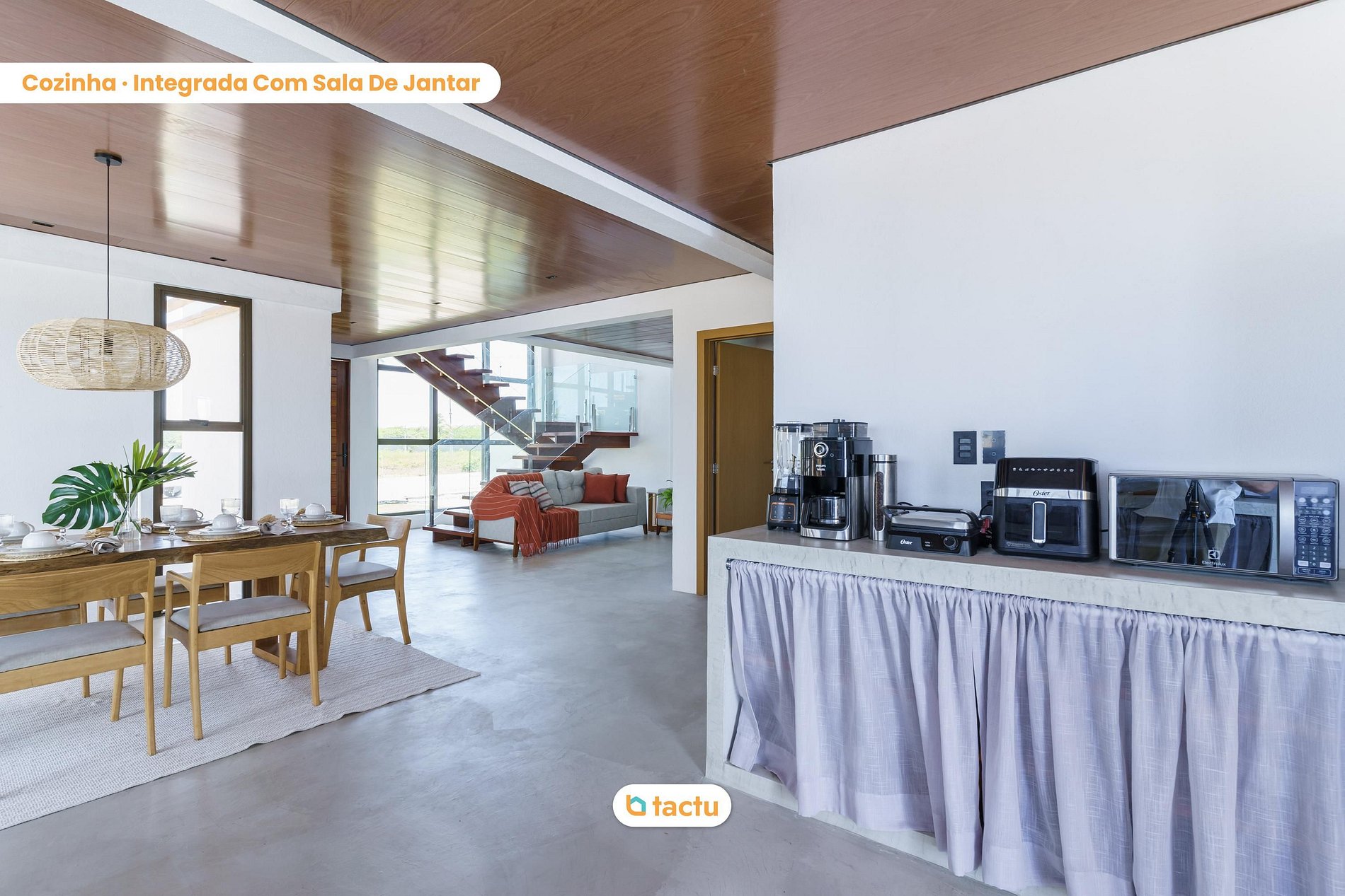 En el interior, la casa presenta un diseño limpio, con tonos claros, madera y mucha luz natural. La sala amplia se integra con la cocina equipada y el área gourmet, creando un ambiente fluido para la convivencia. Los muebles, acabados y detalles fueron elegidos para transmitir confort y sofisticación, manteniendo la sensación de una moderna casa de playa acogedora.