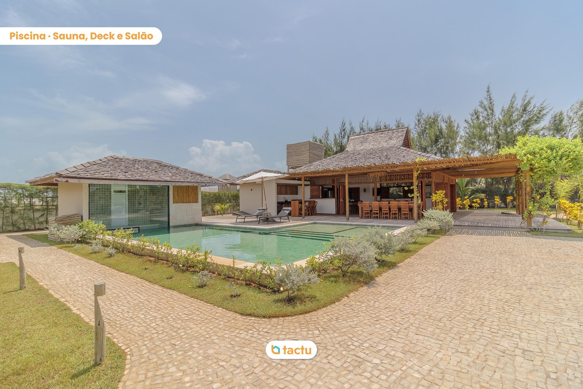 La casa fue diseñada íntegramente pensando en el descanso, la comodidad y la diversión. Ven a darte un chapuzón en nuestra increíble piscina, con deck, tumbonas, sombrillas y ducha, además de una increíble iluminación programada para los periodos nocturnos. ¡Aprovecha también para tomar una relajante sauna al final de la tarde!