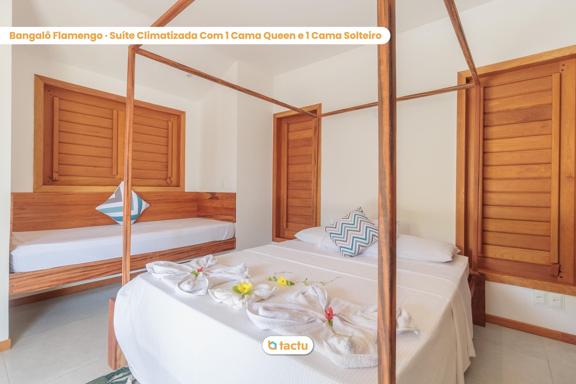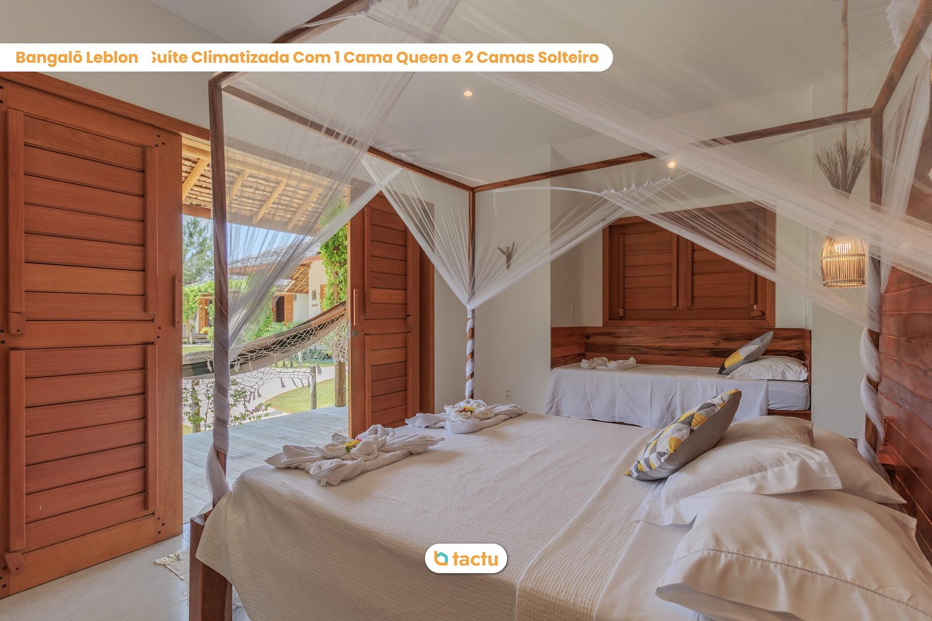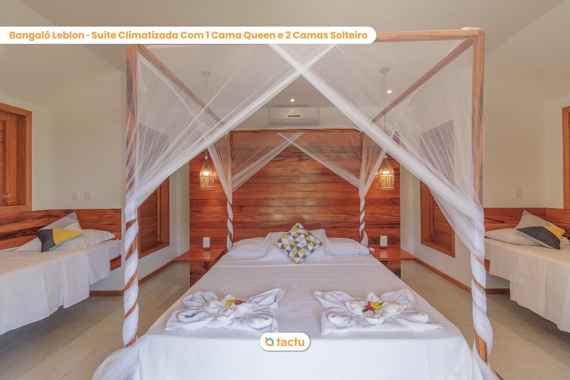 En los bungalows Leblon e Ipanema encontrarás una cómoda cama doble y UNA cama individual. En los bungalows Leme, Flamengo, Copacabana y Barra encontrará una cómoda cama doble y DOS camas individuales. Todas las camas tienen ropa de cama nueva y de alta calidad.
