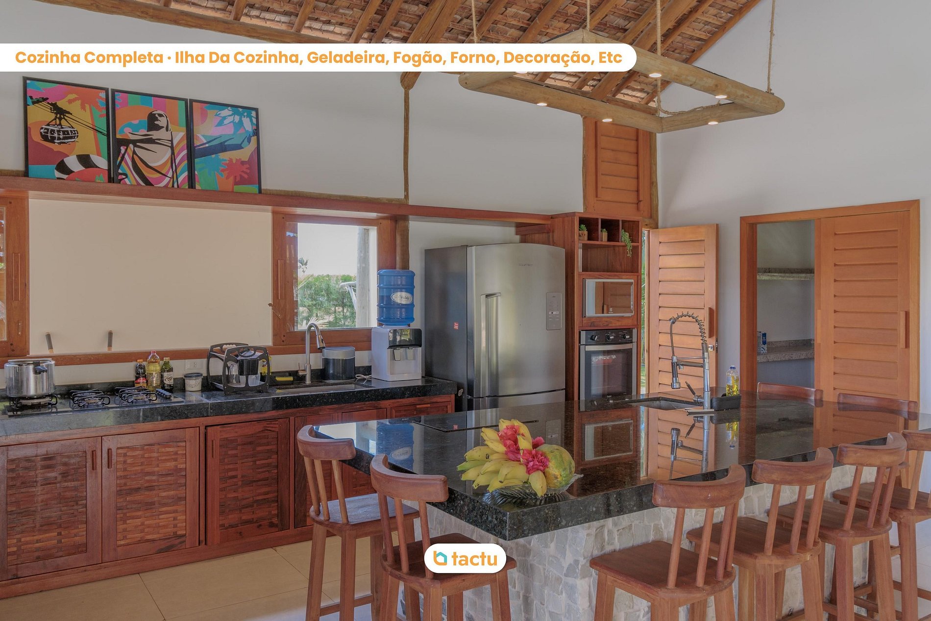 Junto a la piscina, tendrás un hermoso deck de madera integrado al gran salón, que se completa con cocina, gran Smart TV, parlante y mesas de comedor. La cocina es completa, con isla gourmet, asador y estufa industrial integrada a un sobre de granito, además de una barra para momentos de diversión.