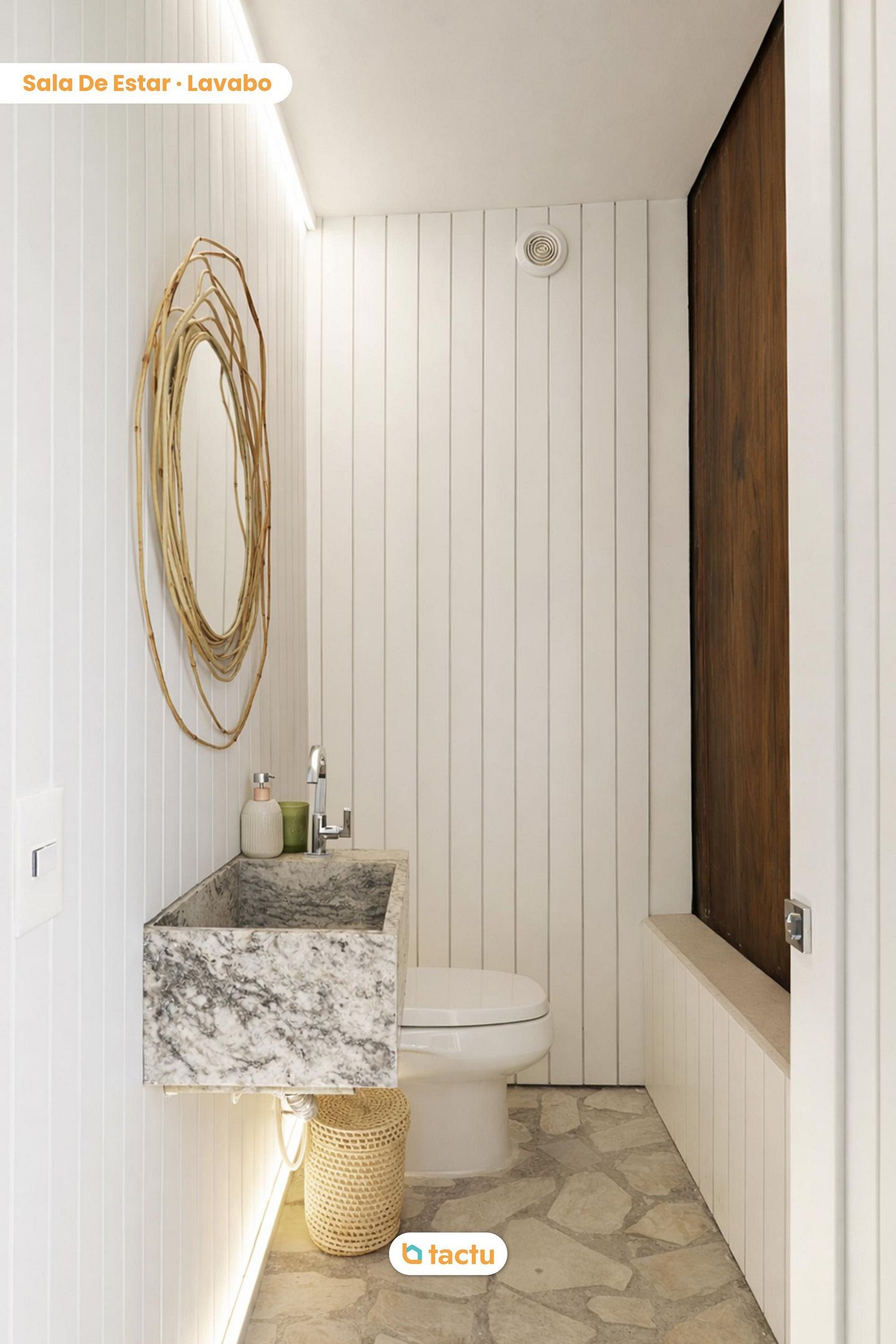 En el interior, la sala amplia y acogedora ofrece sofá espacioso, sillón, mesa lateral con cafetera de cápsulas, TV de 75’’ y pared decorativa con estanterías que funcionan como mueble de TV. También cuenta con 1 aseo para mayor comodidad.