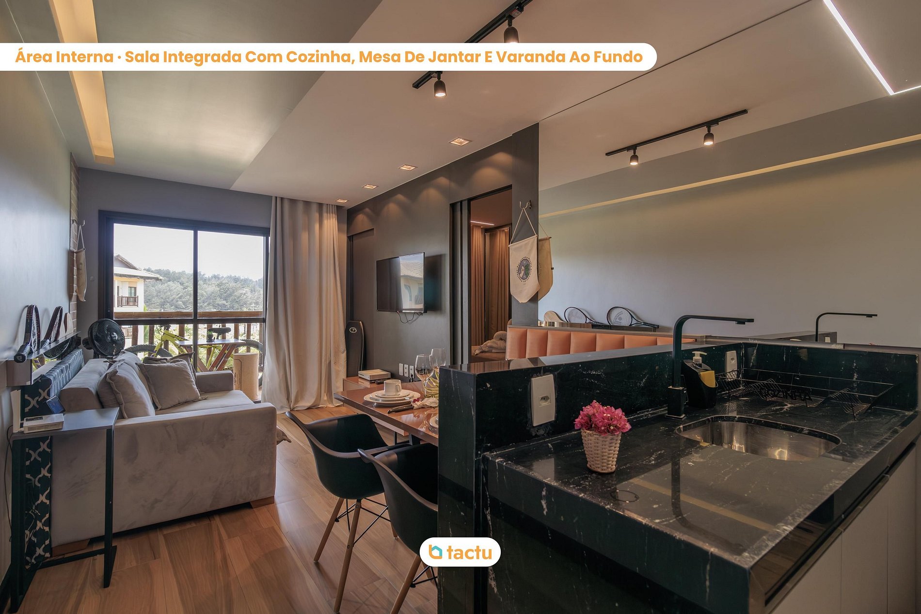 El balcón es un espectáculo, con una vista increíble del condominio. Todo está preparado para hacer el ambiente lo más cómodo posible para ti, con un estilo industrial que utiliza madera y piedras oscuras en la decoración.