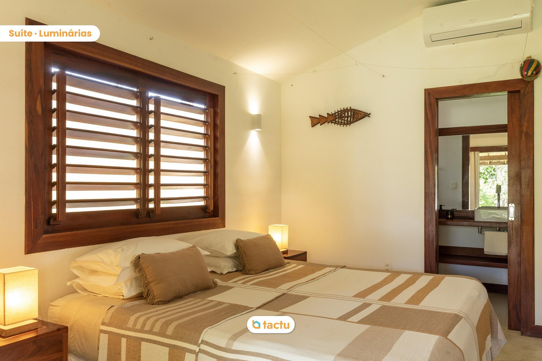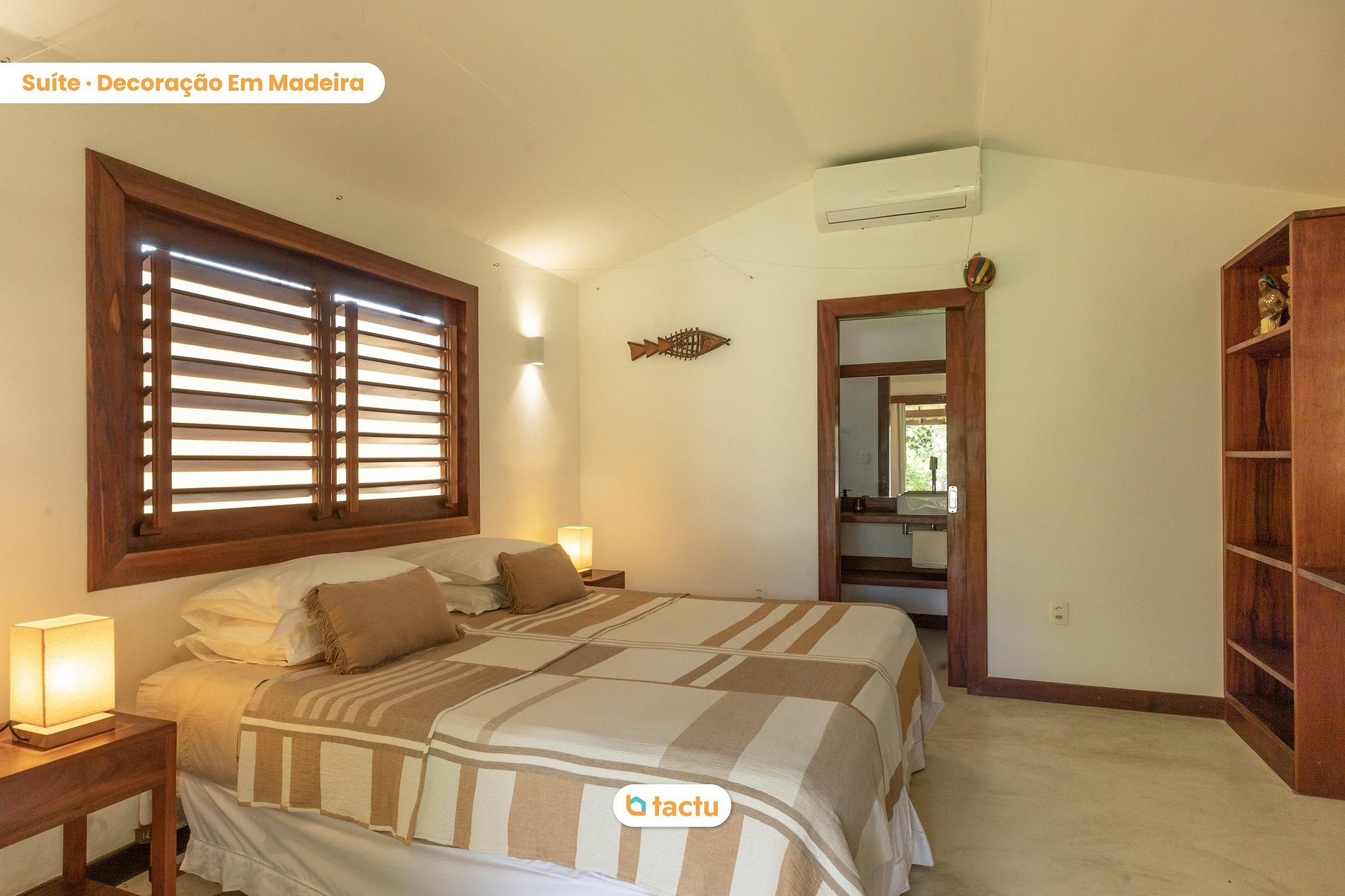 Casa Atlântica acomoda cómodamente hasta 8 personas, rodeada de un hermoso jardín con piscina y gazebo. La casa principal cuenta con tres suites, una cocina completamente equipada, sala de estar, baño compartido y un altillo. La amplia terraza con vista al mar ofrece un área de comedor, muebles de exterior, hamacas y cómodos asientos.