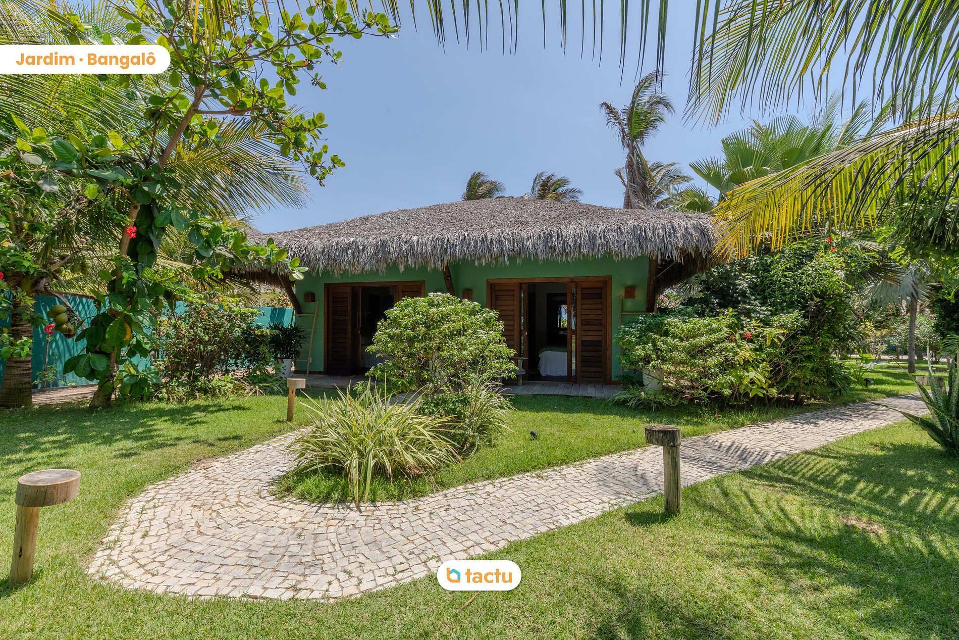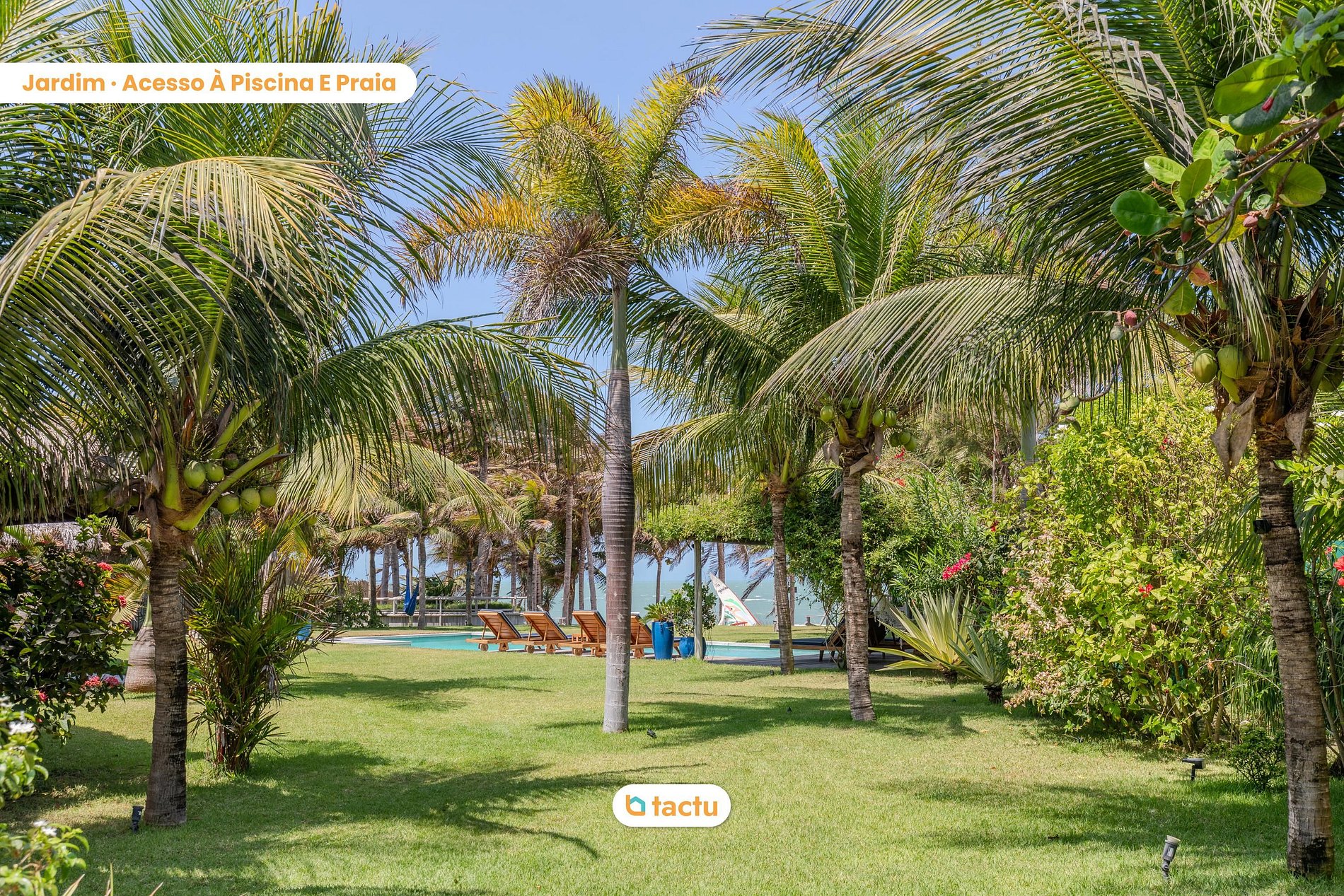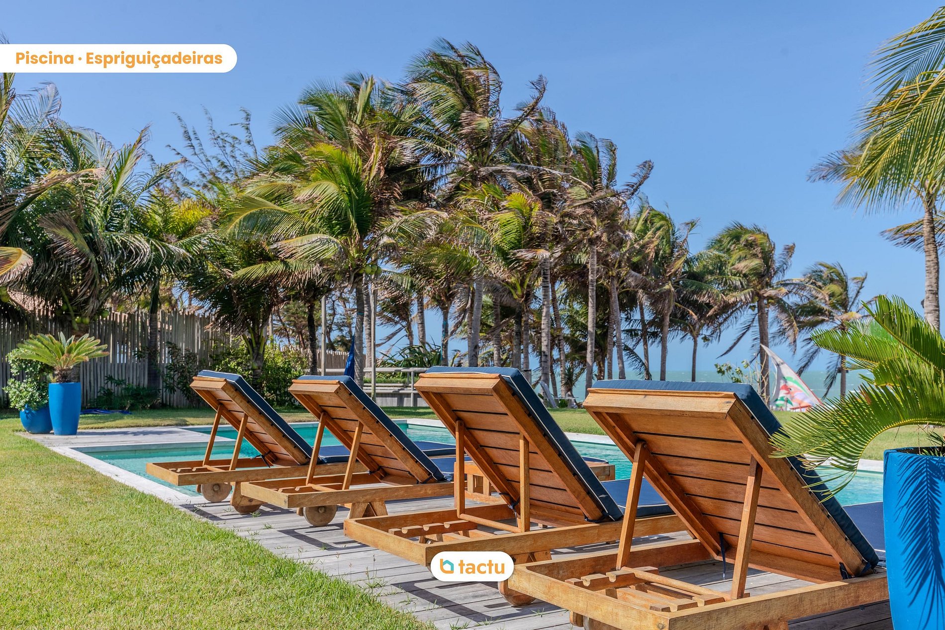 La piscina al aire libre, rodeada de tumbonas, invita a los huéspedes a momentos de relajación bajo el sol cearense, mientras disfrutan de la vista al jardín tropical y al océano. La terraza junto a la piscina es el lugar perfecto para tomar el sol y relajarse, apreciando la belleza natural del entorno.