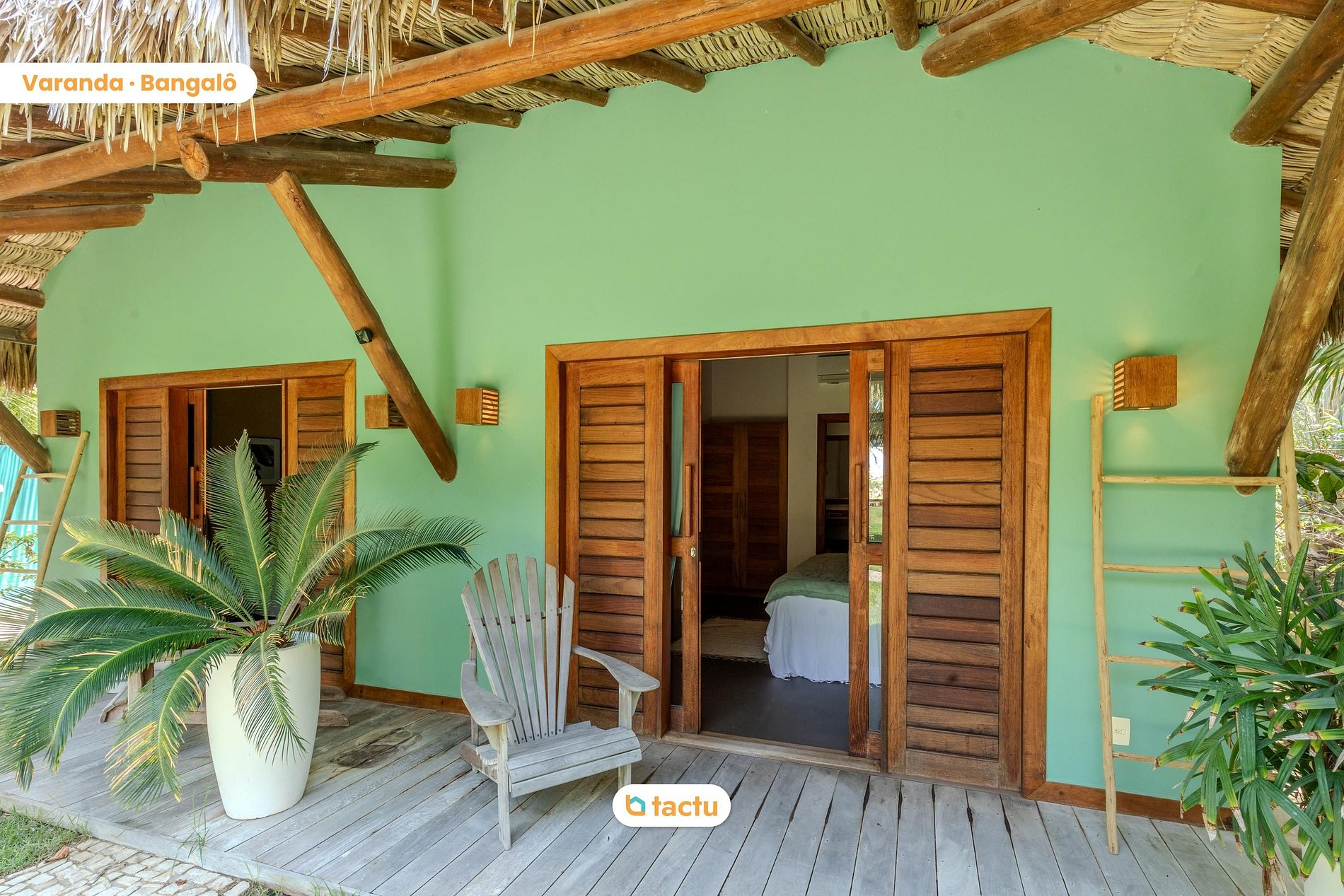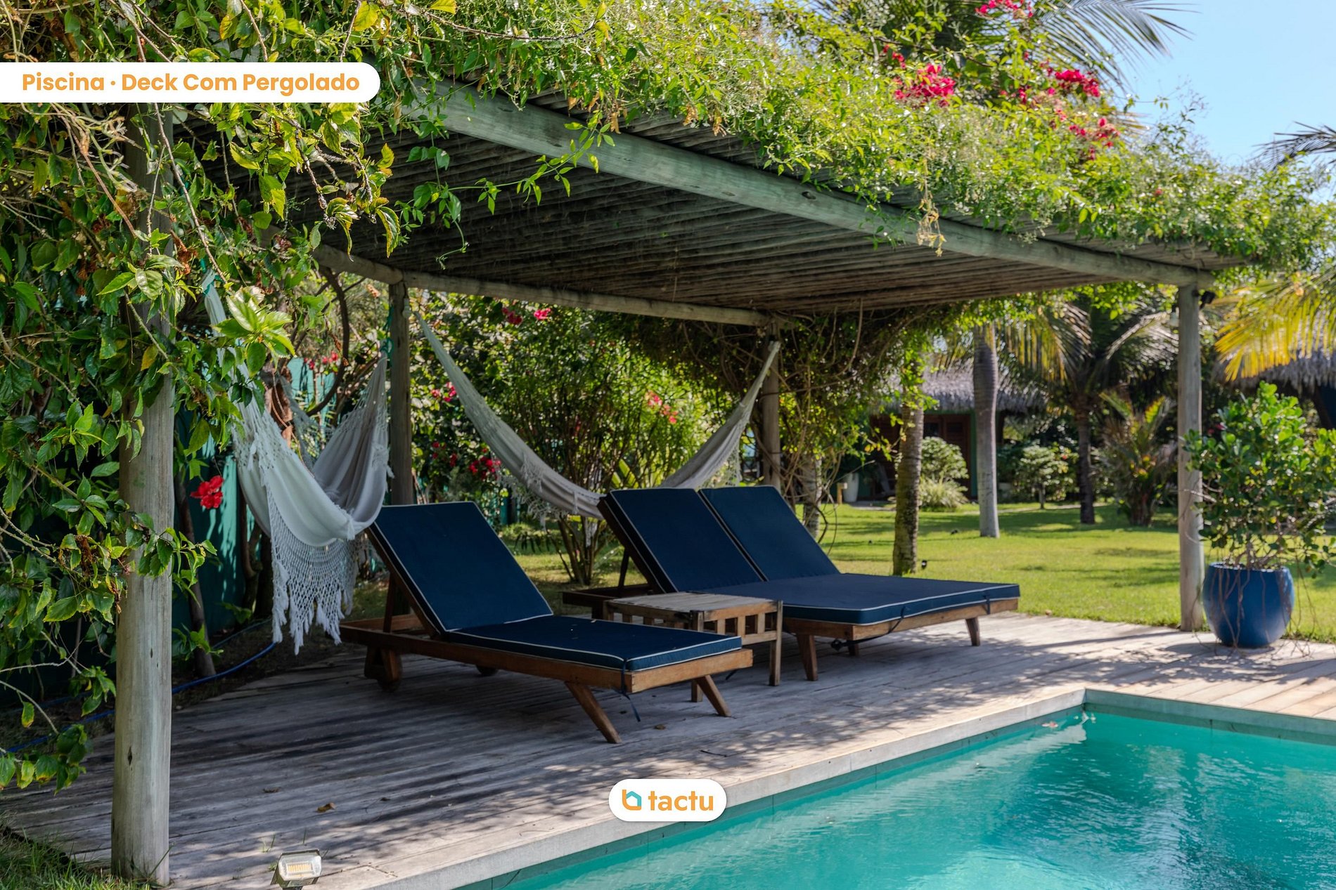 La piscina al aire libre, rodeada de tumbonas, invita a los huéspedes a momentos de relajación bajo el sol cearense, mientras disfrutan de la vista al jardín tropical y al océano. La terraza junto a la piscina es el lugar perfecto para tomar el sol y relajarse, apreciando la belleza natural del entorno.