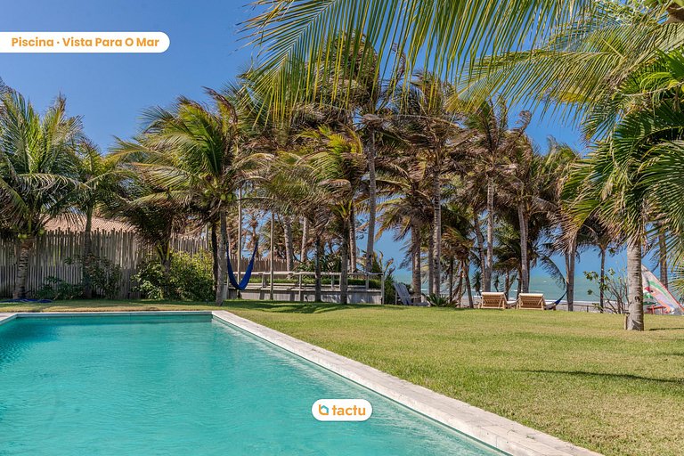 La piscina al aire libre, rodeada de tumbonas, invita a los huéspedes a momentos de relajación bajo el sol cearense, mientras disfrutan de la vista al jardín tropical y al océano. La terraza junto a la piscina es el lugar perfecto para tomar el sol y relajarse, apreciando la belleza natural del entorno.