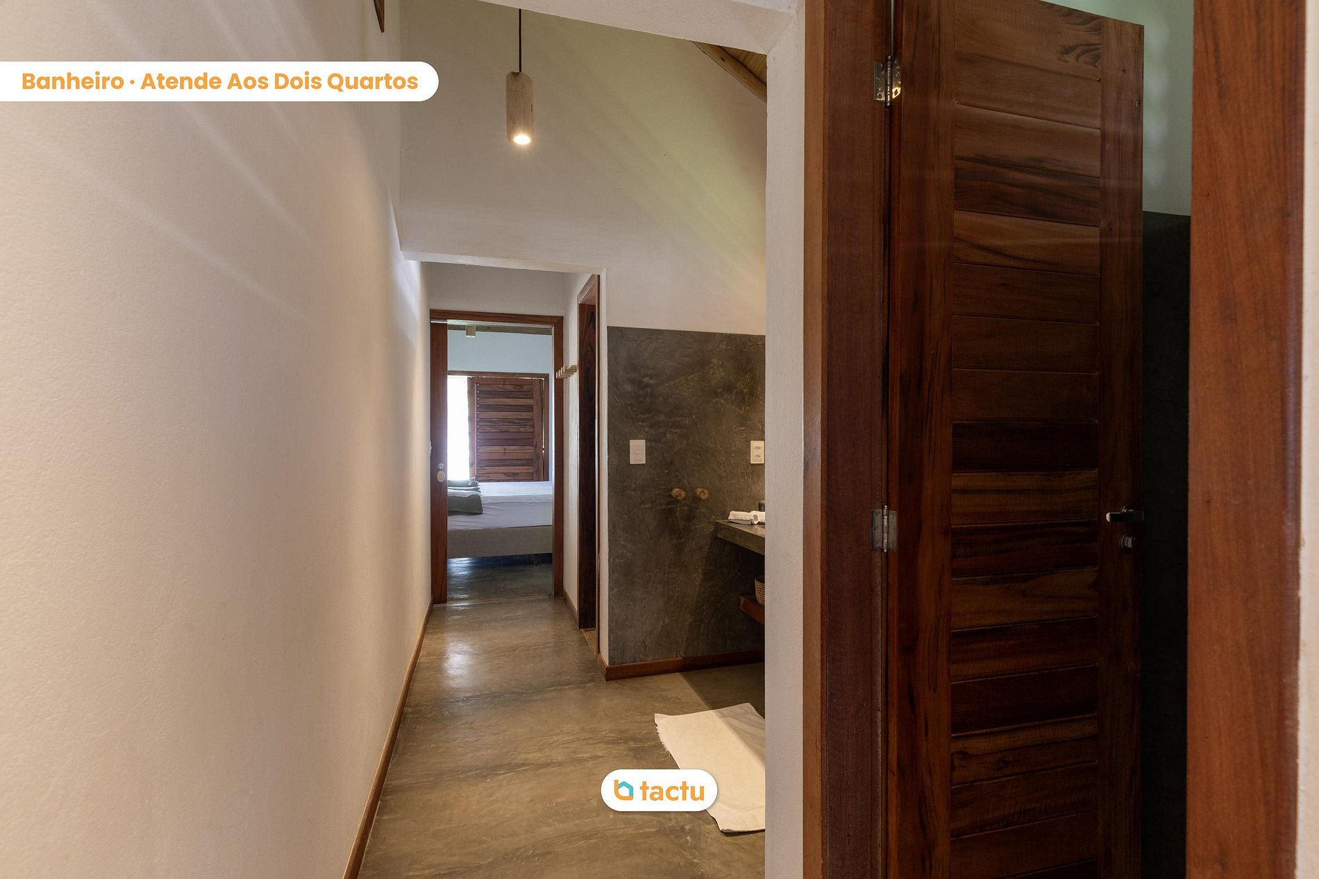 La casa cuenta con cuatro cómodas suites, todas con acceso independiente al exterior y equipadas con aire acondicionado. Dos de ellas son versátiles, pudiendo prepararse con cama king o dos camas individuales — perfectas para familias o grupos de amigos. Comparten un baño amplio y funcional. Las otras dos suites están equipadas con cama king size y ofrecen total privacidad y confort.