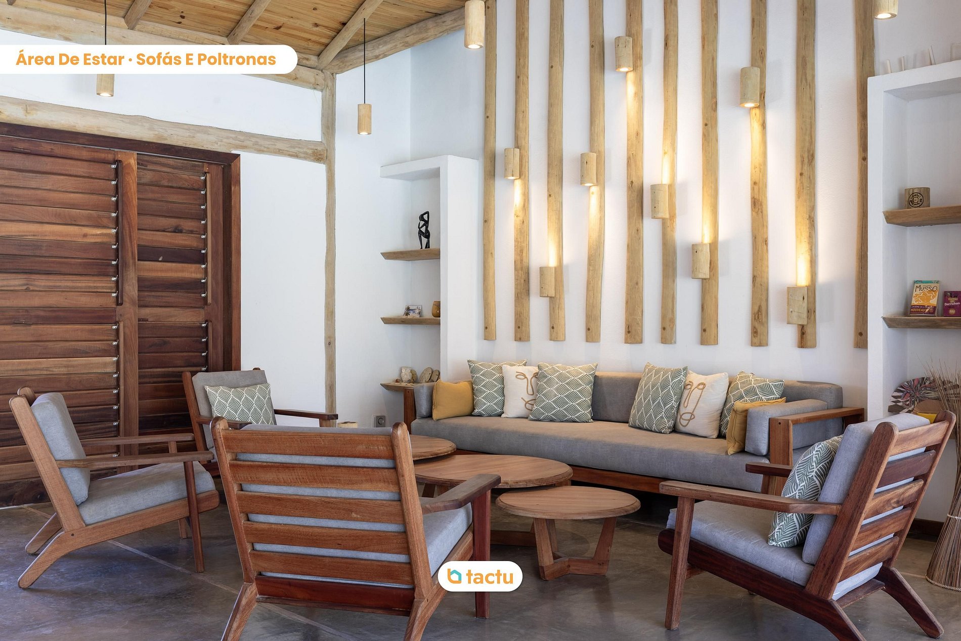 Afuera, el área de ocio es el gran destaque: piscina privada con deck de madera, tumbonas y un ambiente perfecto para relajarse al sol. La terraza cubierta invita al descanso, con hamacas, sillones y una mesa para comer al aire libre.