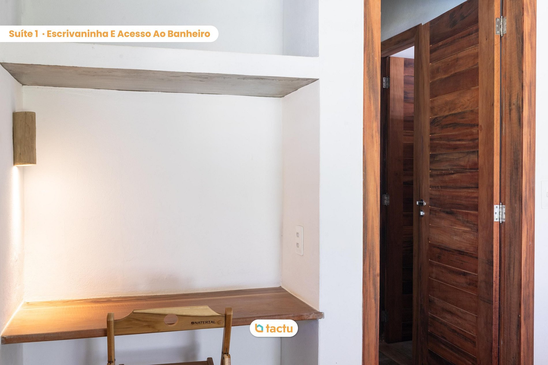 La casa cuenta con cuatro cómodas suites, todas con acceso independiente al exterior y equipadas con aire acondicionado. Dos de ellas son versátiles, pudiendo prepararse con cama king o dos camas individuales — perfectas para familias o grupos de amigos. Comparten un baño amplio y funcional. Las otras dos suites están equipadas con cama king size y ofrecen total privacidad y confort.