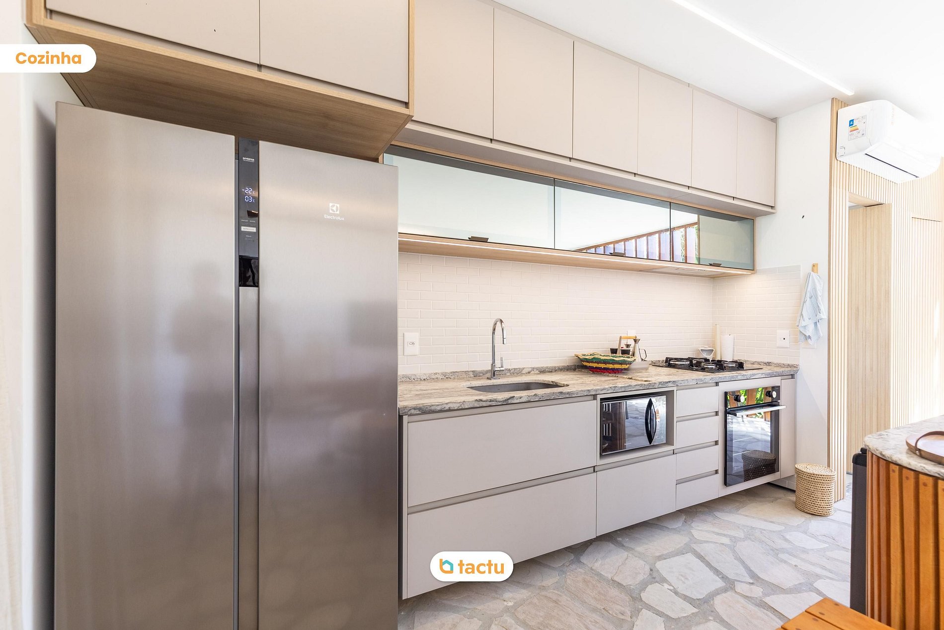 – Cocina completa con nevera side-by-side, cocina, horno y utensilios