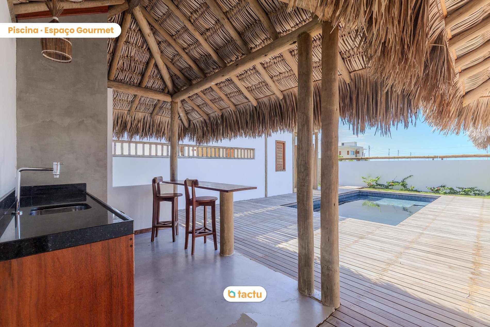 El área exterior ofrece una piscina privada perfecta para relajarse al sol. Además, los huéspedes tienen acceso al club del condominio, que incluye piscina de entrenamiento, sauna, campo de fútbol y cancha polideportiva — opciones para todas las edades.