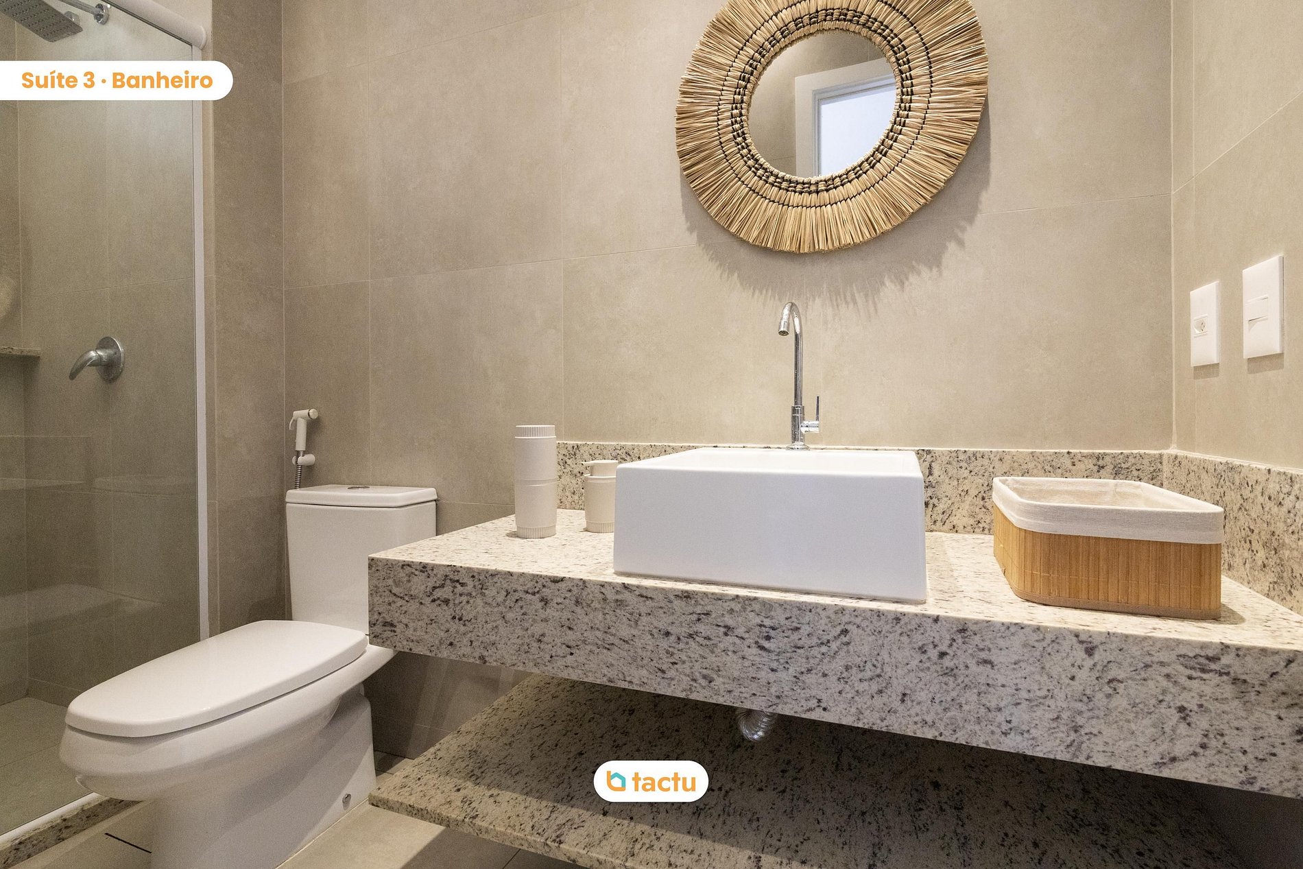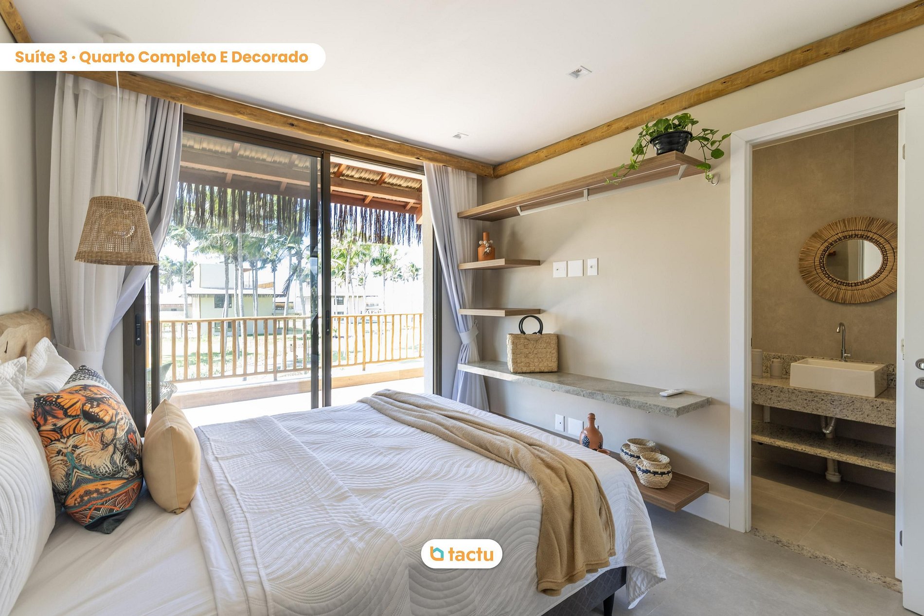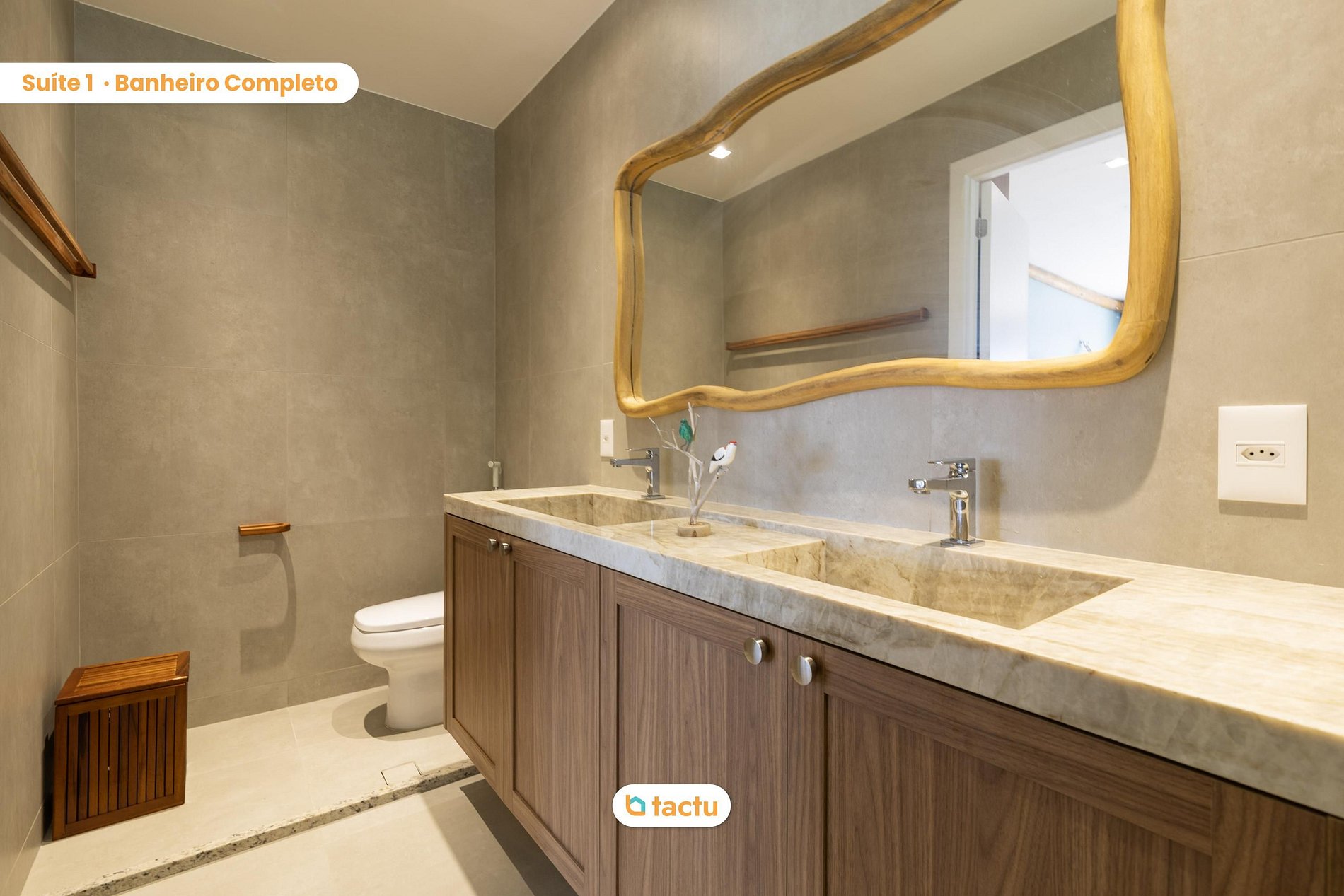 En la planta baja, el área exterior es una invitación a la convivencia y al ocio: piscina privada, mesa de comedor al aire libre para ocho personas, tumbonas, un salón con sofá y hamaca, además de una terraza equipada con isla de apoyo, fregadero, armarios y barbacoa eléctrica. Es el escenario perfecto para momentos relajados con la familia o amigos. Al entrar en la casa, encontrará una amplia sala climatizada con aire acondicionado central y televisión de 75 pulgadas. Integrada a ella, está el comedor con mesa redonda para ocho personas y una isla con cuatro asientos adicionales orientada hacia la cocina. Este espacio también cuenta con una vitrina, bodega y enfriador de cerveza, creando un ambiente elegante y funcional. La cocina está completamente equipada: placa de inducción, horno empotrado, microondas, refrigerador frost free, amplios armarios, además de un área de servicio con fregadero, tendedero, lavadora y lavavajillas. En el mismo piso, también hay un aseo y una suite con dos camas individuales con camas nido, aire acondicionado y armario auxiliar.