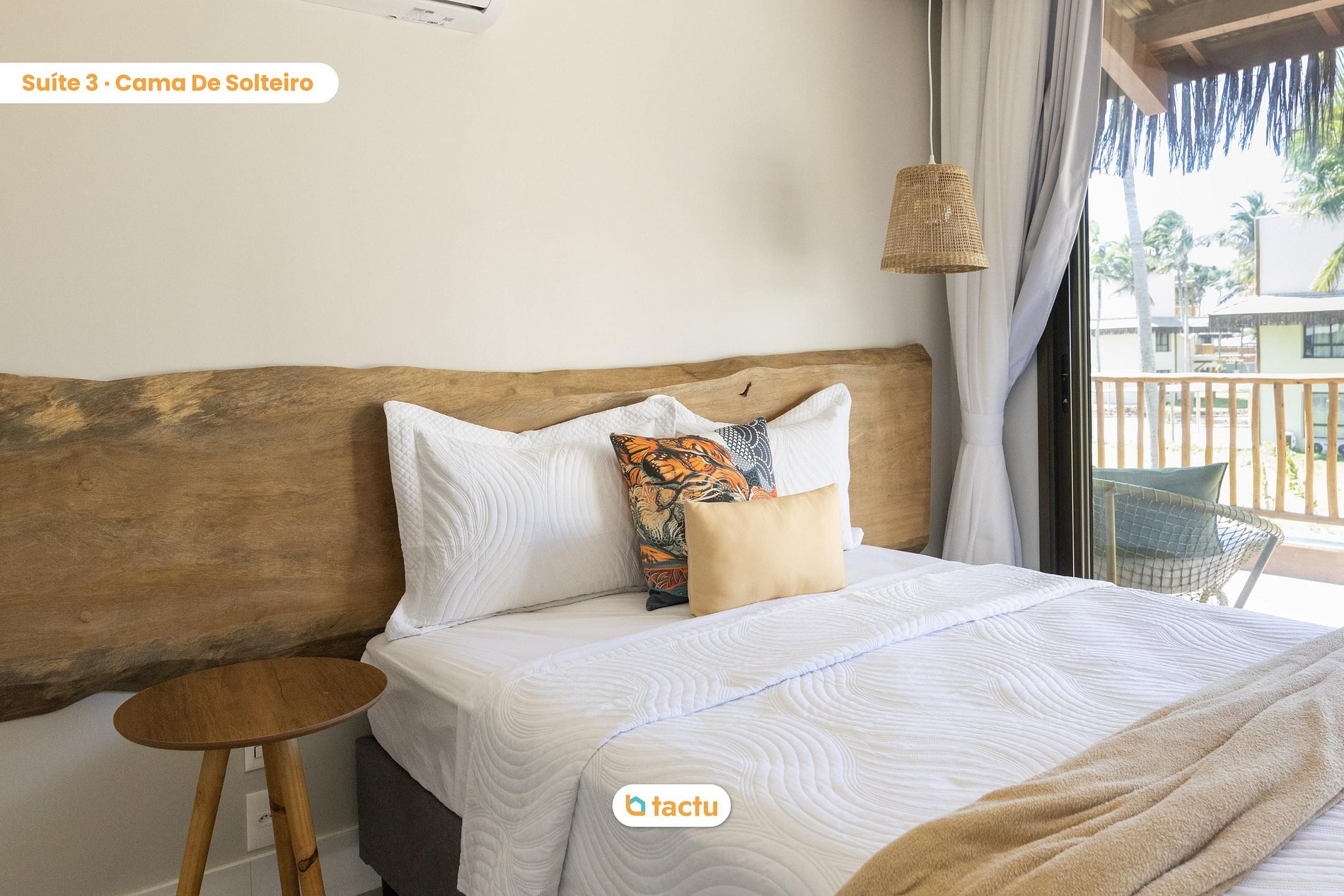 En la primera planta se encuentran tres cómodas y bien decoradas suites con aire acondicionado. La suite principal cuenta con cama king size, televisor de 55 pulgadas, armario abierto con estantes y perchero, hamaca, balcón con chaise longue y una vista relajante del condominio. La segunda suite ofrece una cama queen size, armario abierto con estantes y perchero y balcón compartido con la suite principal. La tercera suite tiene una cama queen size y una cama individual adicional con cama nido, armario y armario abierto, ideal para familias con niños.