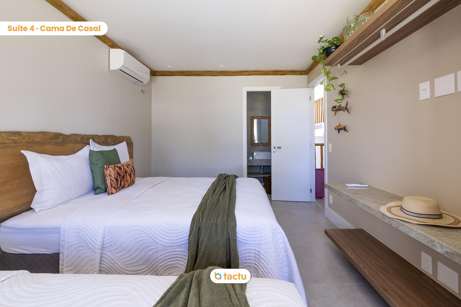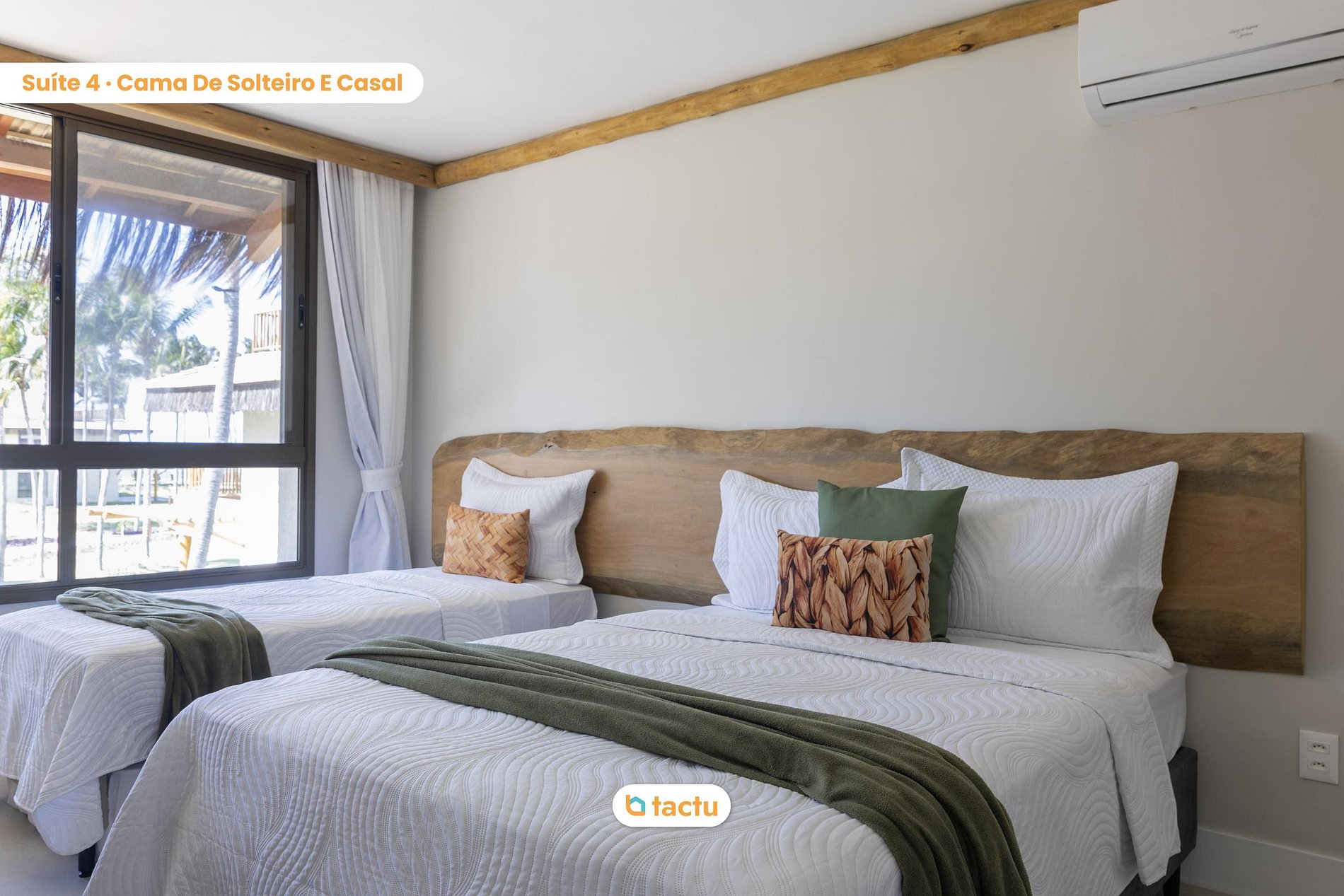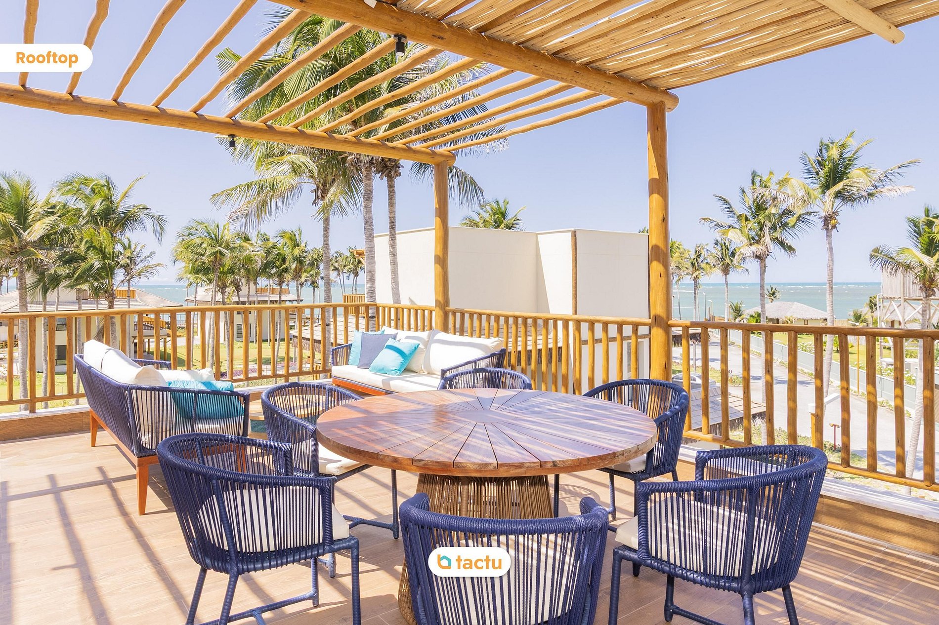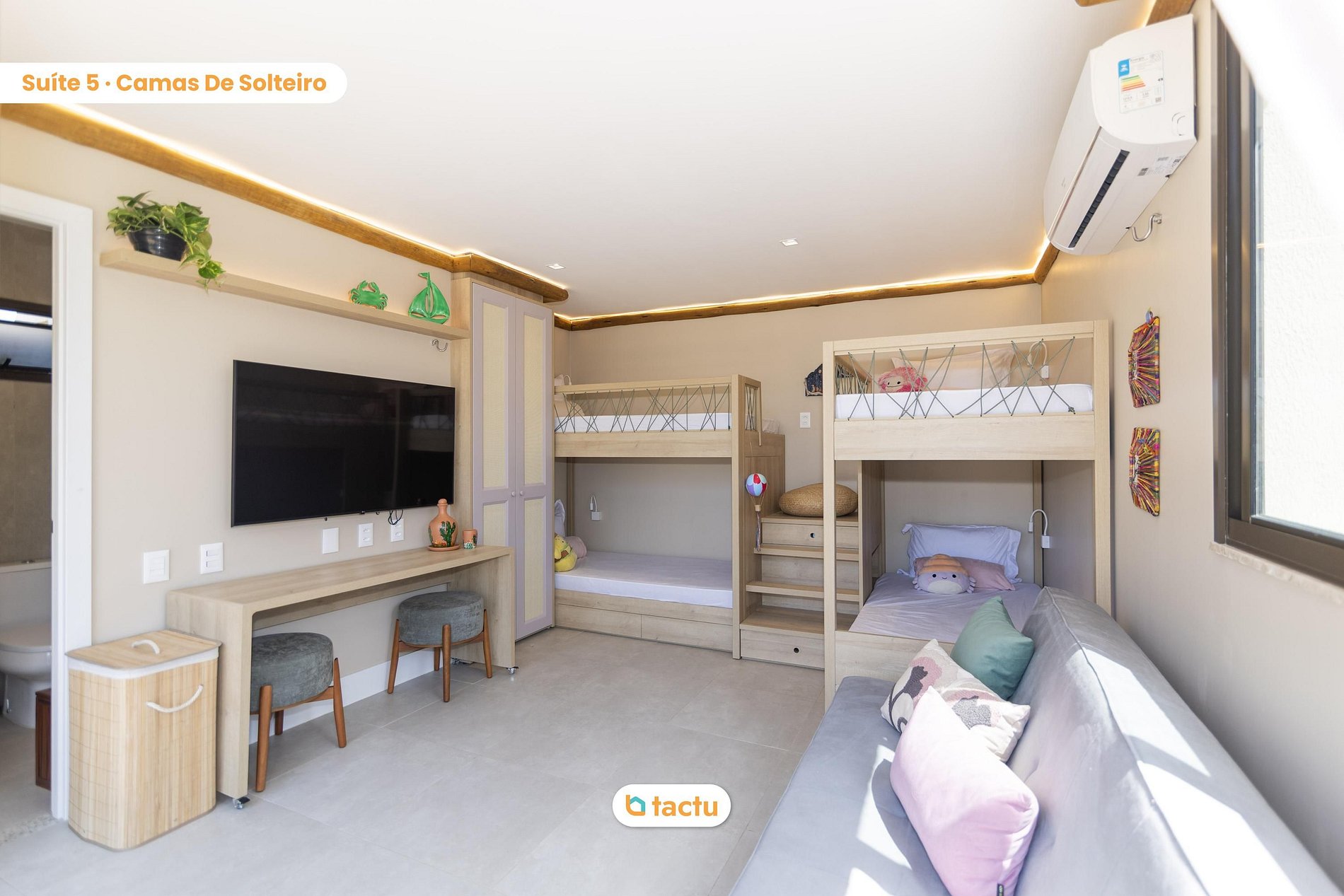 En la última planta, la casa sorprende con una azotea completa. La quinta suite acomoda cómodamente a niños o jóvenes, con dos literas hechas a medida con colchones individuales grandes, sofá cama, escritorio, televisor de 55 pulgadas, aire acondicionado y balcón. La azotea, uno de los puntos más destacados de la casa, cuenta con dos amplios sofás, mesa redonda para seis personas, fregadero de apoyo y una increíble vista de la zona verde y el mar al fondo. Es el lugar ideal para ver la puesta de sol o simplemente relajarse con el sonido del viento y las olas.
