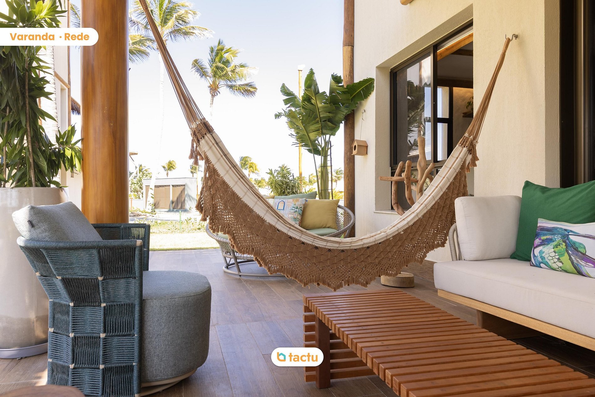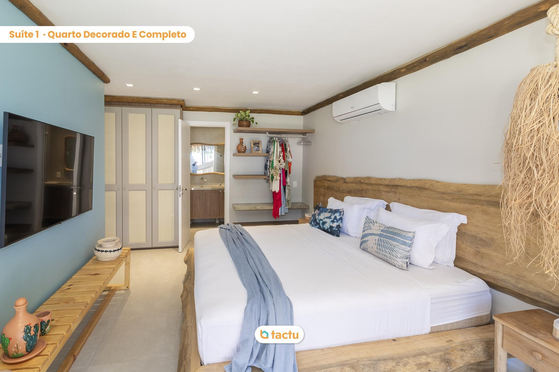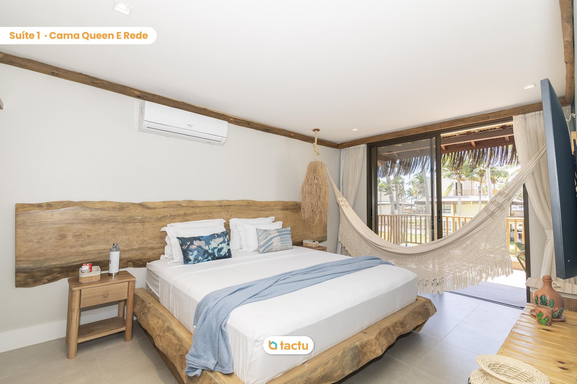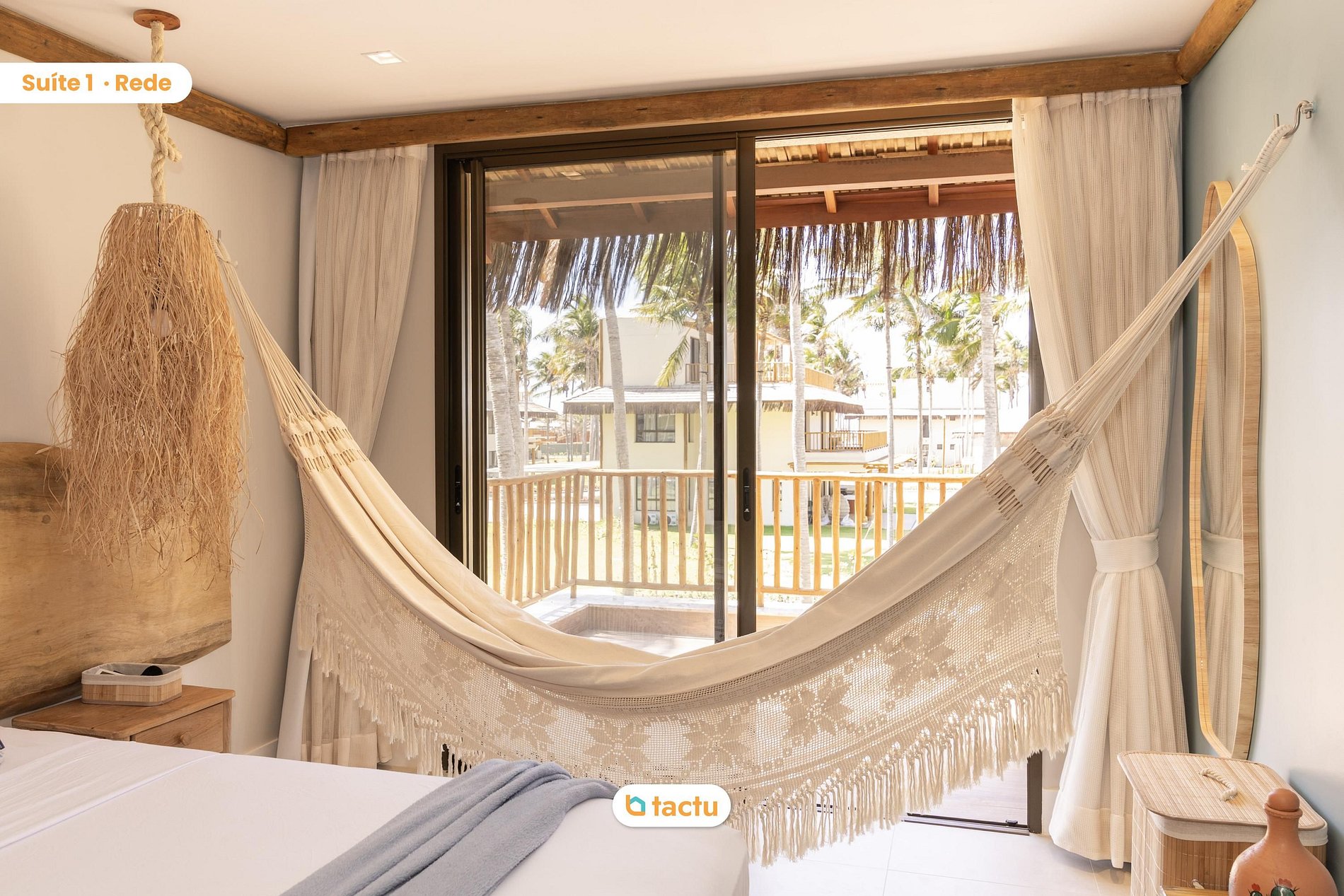 En la primera planta se encuentran tres cómodas y bien decoradas suites con aire acondicionado. La suite principal cuenta con cama king size, televisor de 55 pulgadas, armario abierto con estantes y perchero, hamaca, balcón con chaise longue y una vista relajante del condominio. La segunda suite ofrece una cama queen size, armario abierto con estantes y perchero y balcón compartido con la suite principal. La tercera suite tiene una cama queen size y una cama individual adicional con cama nido, armario y armario abierto, ideal para familias con niños.
