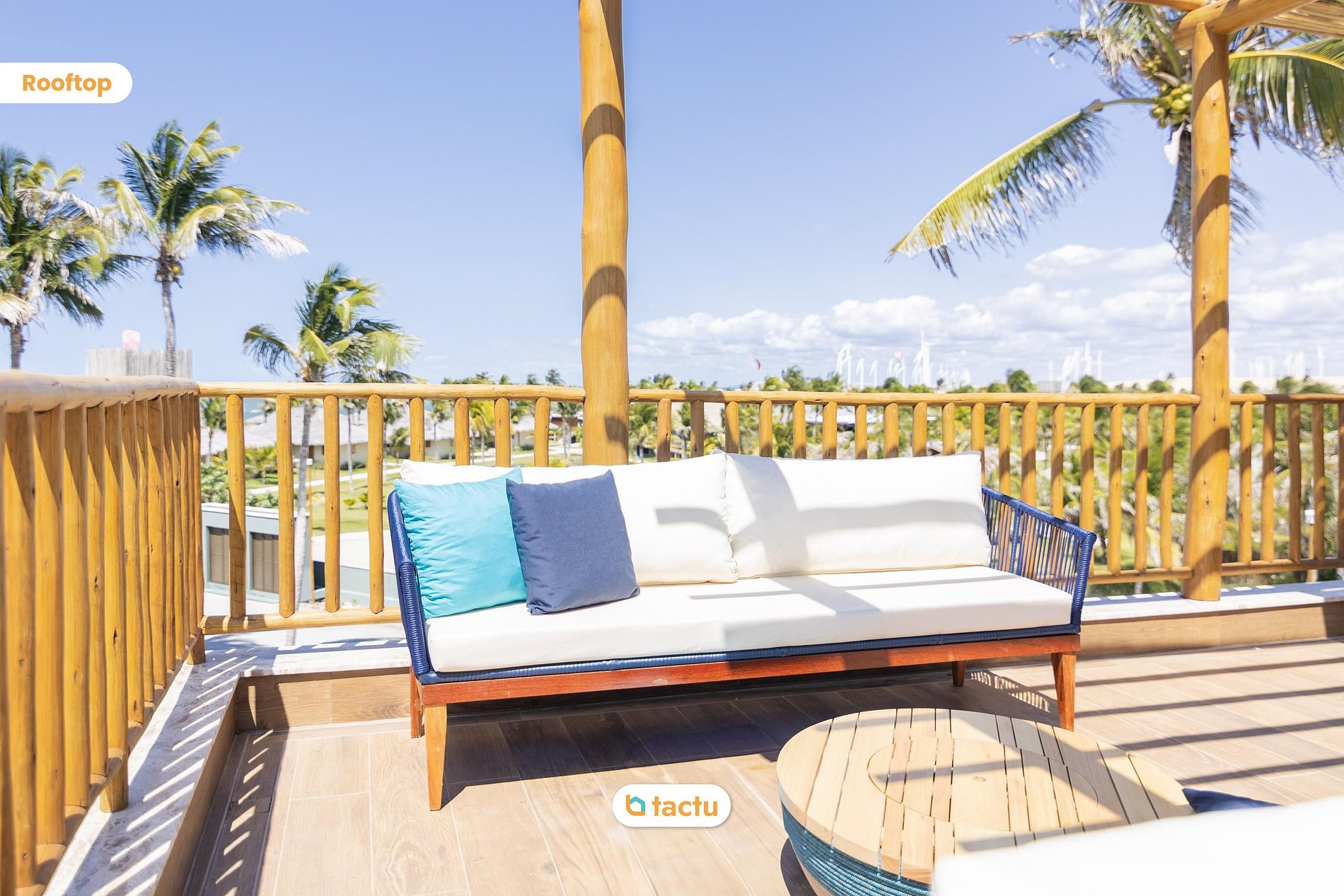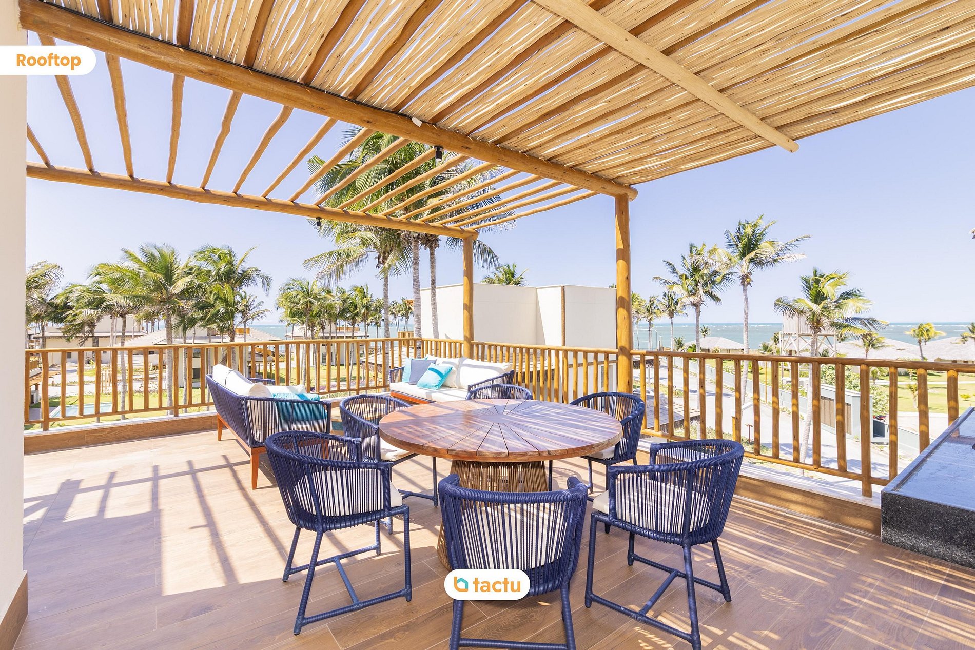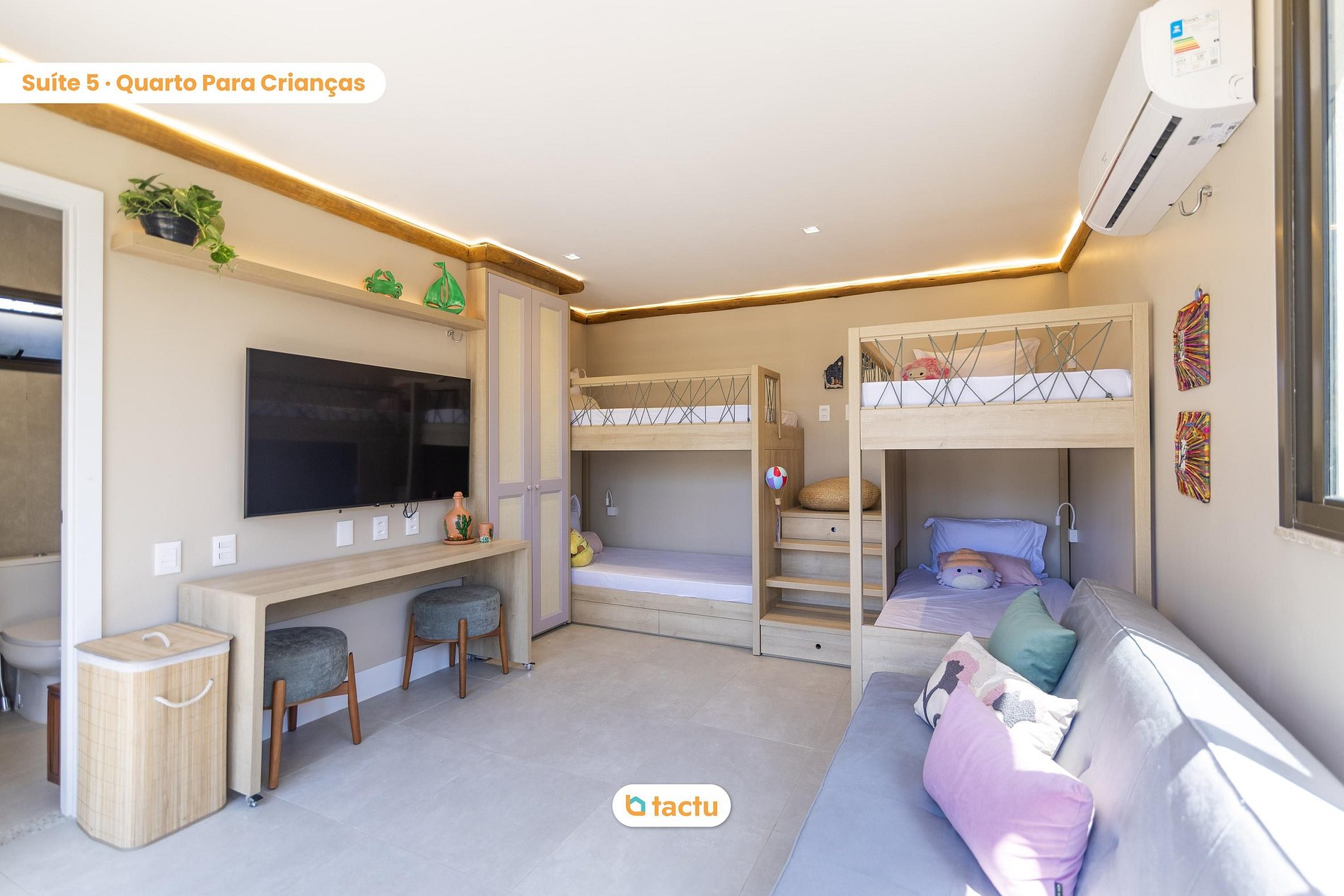 En la última planta, la casa sorprende con una azotea completa. La quinta suite acomoda cómodamente a niños o jóvenes, con dos literas hechas a medida con colchones individuales grandes, sofá cama, escritorio, televisor de 55 pulgadas, aire acondicionado y balcón. La azotea, uno de los puntos más destacados de la casa, cuenta con dos amplios sofás, mesa redonda para seis personas, fregadero de apoyo y una increíble vista de la zona verde y el mar al fondo. Es el lugar ideal para ver la puesta de sol o simplemente relajarse con el sonido del viento y las olas.