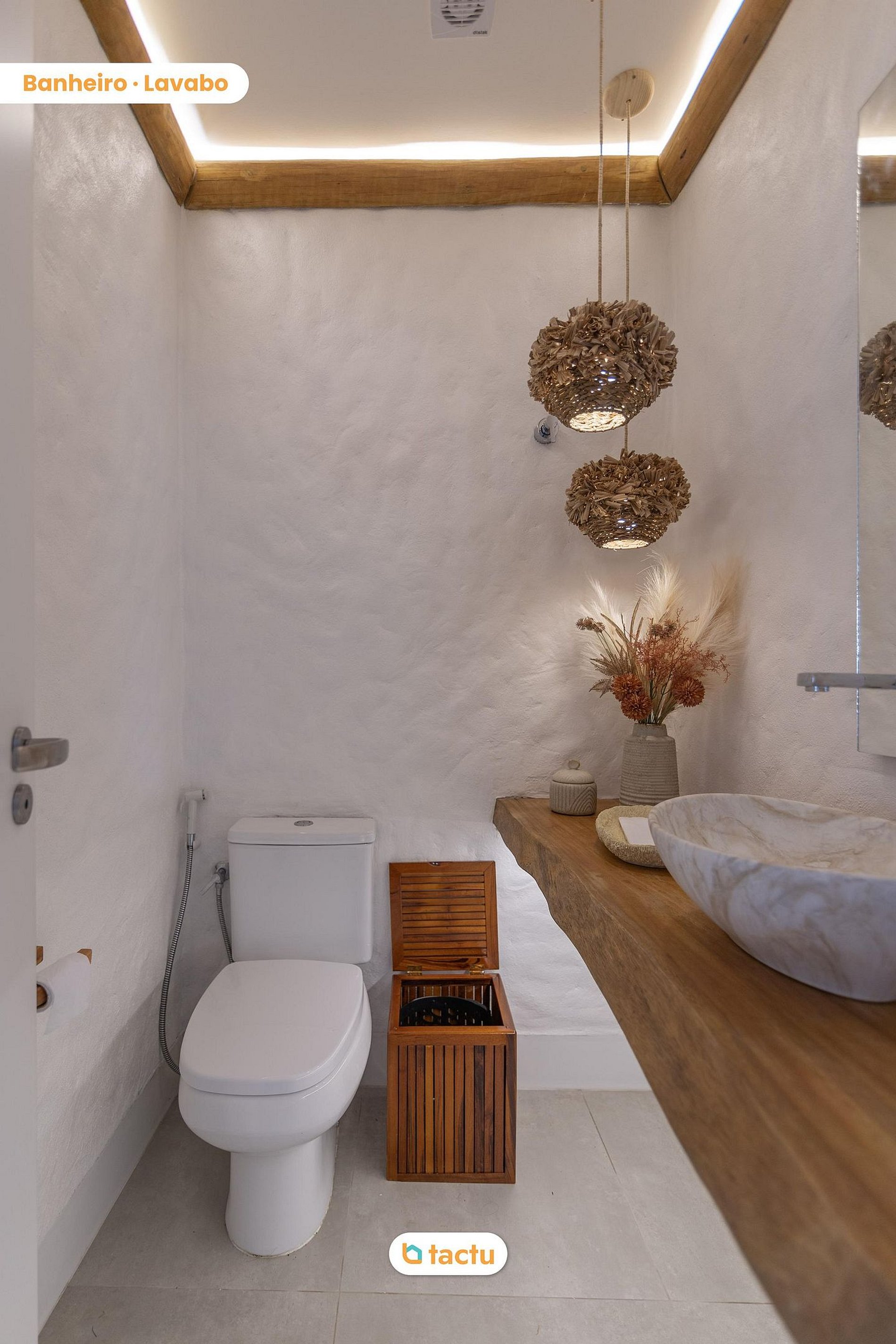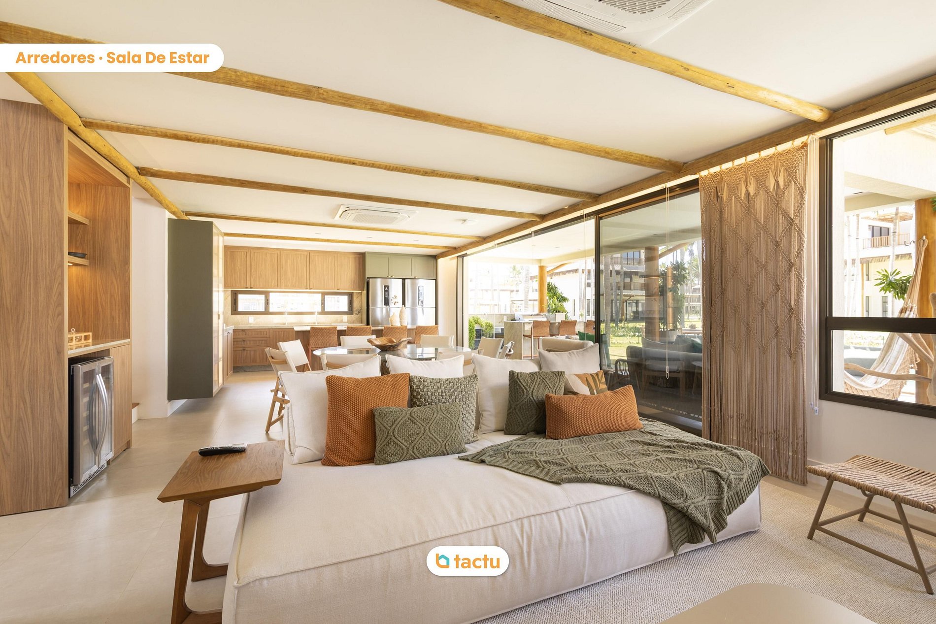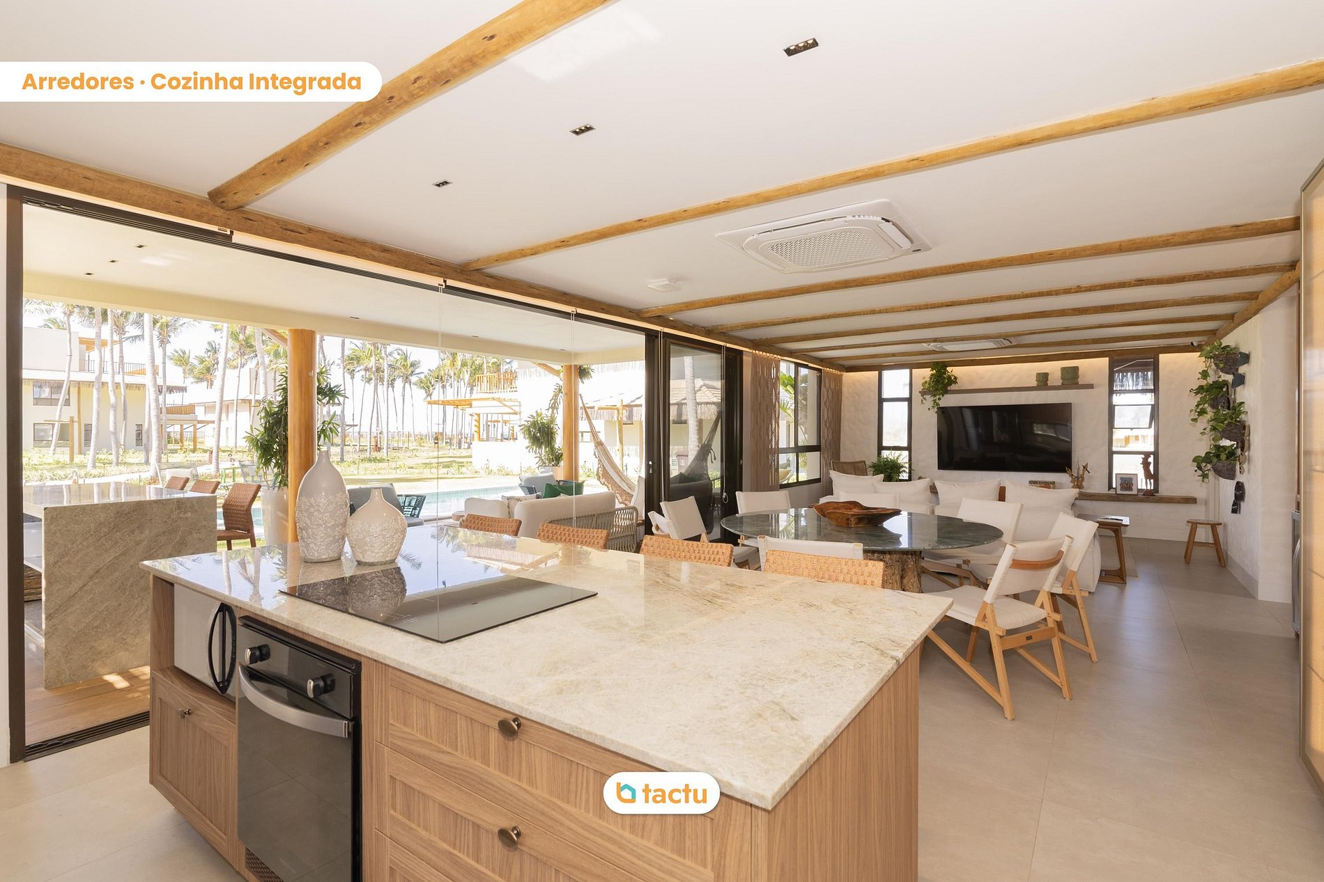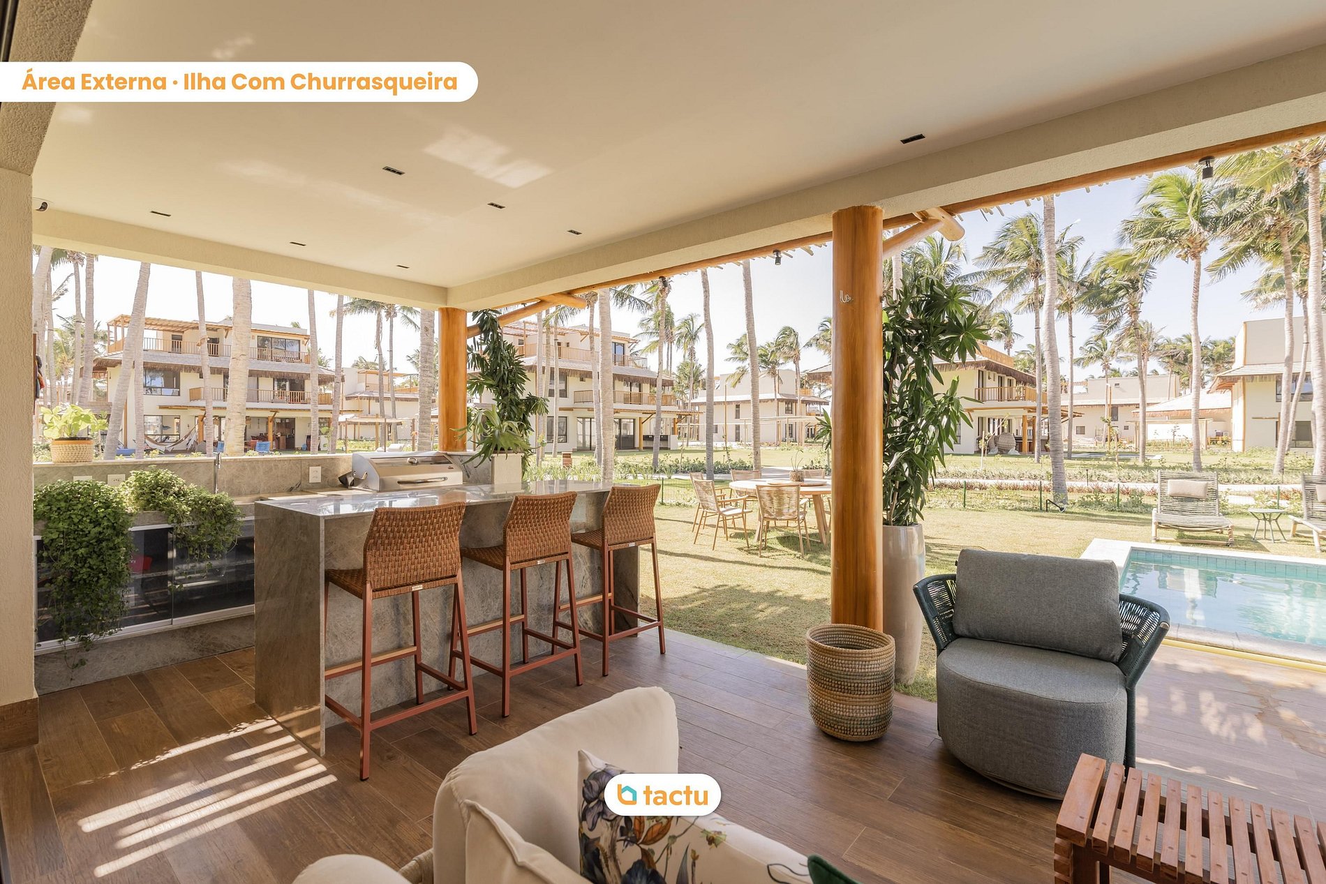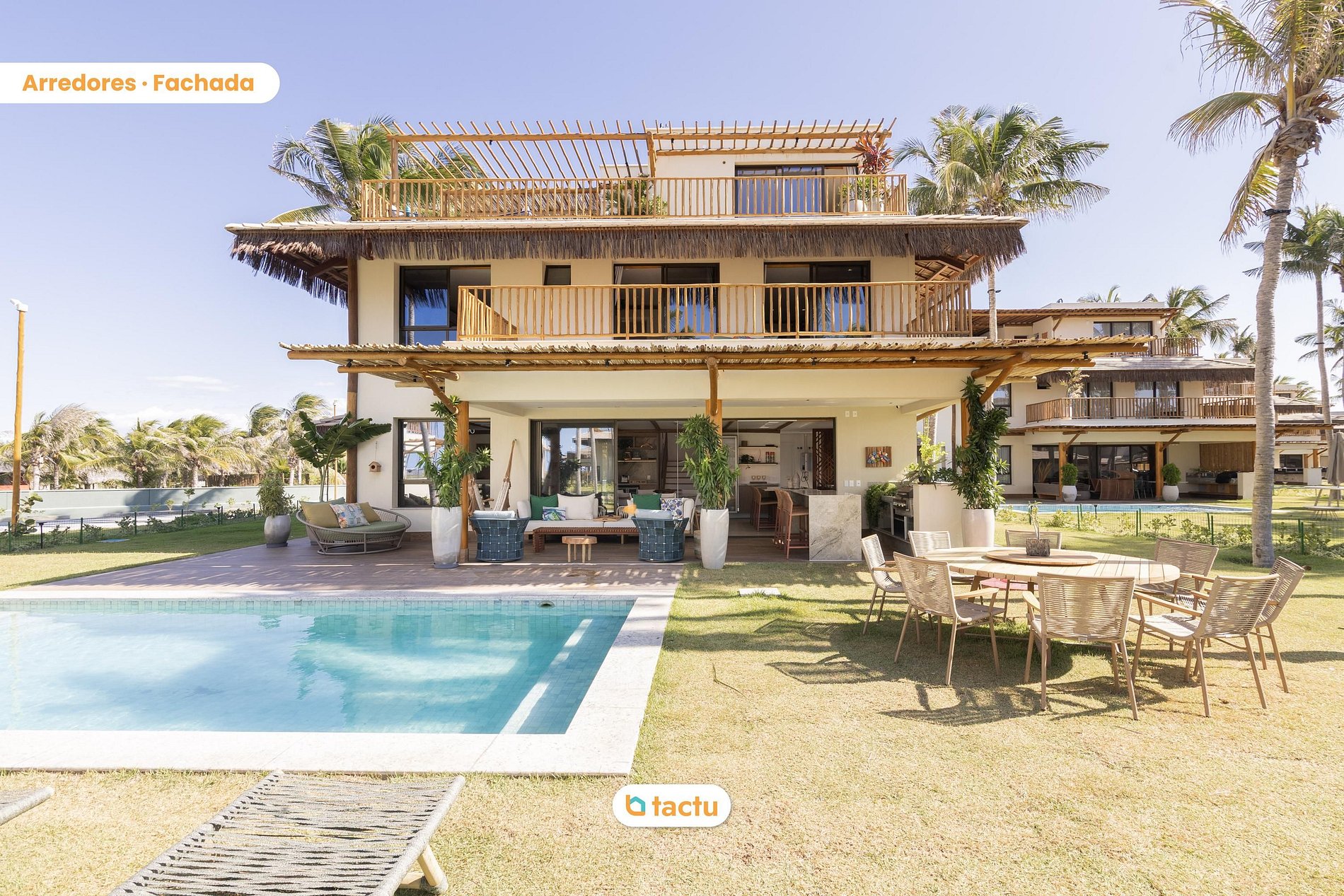 En la planta baja, el área exterior es una invitación a la convivencia y al ocio: piscina privada, mesa de comedor al aire libre para ocho personas, tumbonas, un salón con sofá y hamaca, además de una terraza equipada con isla de apoyo, fregadero, armarios y barbacoa eléctrica. Es el escenario perfecto para momentos relajados con la familia o amigos. Al entrar en la casa, encontrará una amplia sala climatizada con aire acondicionado central y televisión de 75 pulgadas. Integrada a ella, está el comedor con mesa redonda para ocho personas y una isla con cuatro asientos adicionales orientada hacia la cocina. Este espacio también cuenta con una vitrina, bodega y enfriador de cerveza, creando un ambiente elegante y funcional. La cocina está completamente equipada: placa de inducción, horno empotrado, microondas, refrigerador frost free, amplios armarios, además de un área de servicio con fregadero, tendedero, lavadora y lavavajillas. En el mismo piso, también hay un aseo y una suite con dos camas individuales con camas nido, aire acondicionado y armario auxiliar.