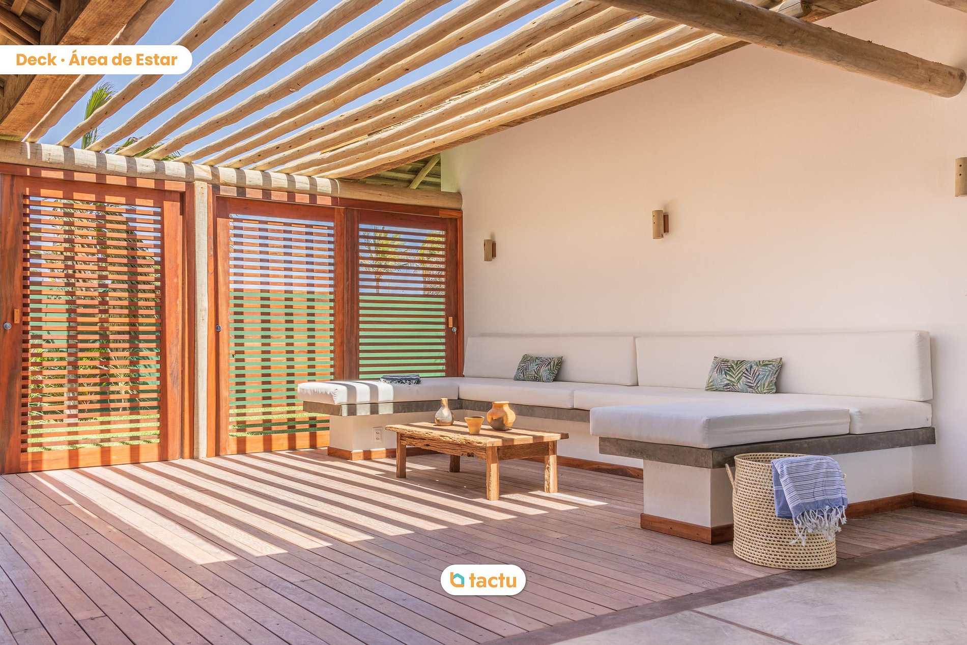 El área exterior es, por sí sola, un espectáculo. Un amplio deck con piscina frente al mar incluye parrilla a carbón, bar privado, gran mesa de comedor en madera maciza y una zona de estar techada con pérgola y sofás con cojines impermeables. El escenario perfecto para tardes soleadas o reuniones al atardecer con la brisa marina.
