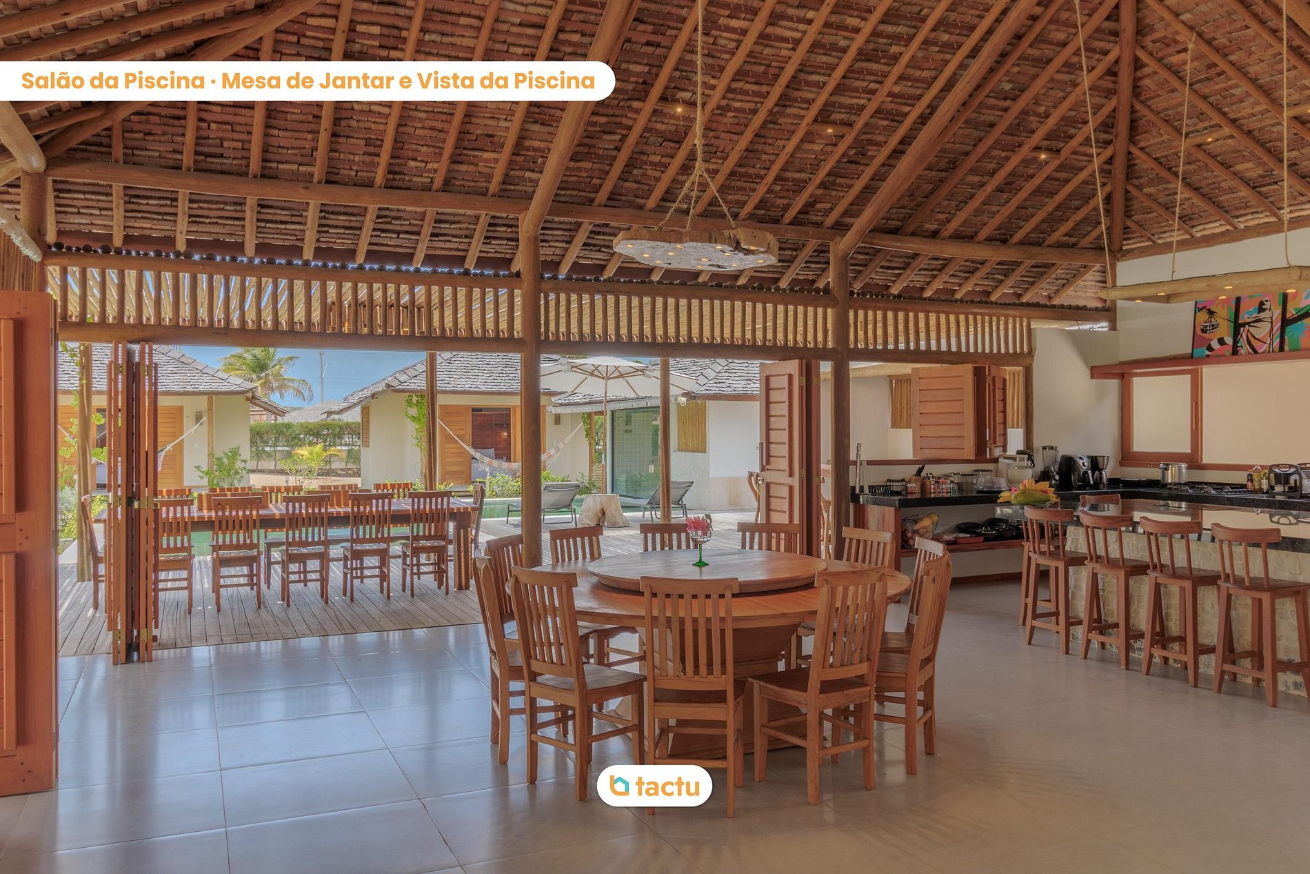 À côté de la piscine, vous disposerez d'une belle terrasse en bois intégrée au grand salon, qui comprend une cuisine, une grande Smart TV, une enceinte et des tables à manger. La cuisine est complète, avec un îlot gourmand, un barbecue et une cuisinière industrielle intégrés à un comptoir de granite, ainsi qu'un comptoir de bar pour des moments amusants.