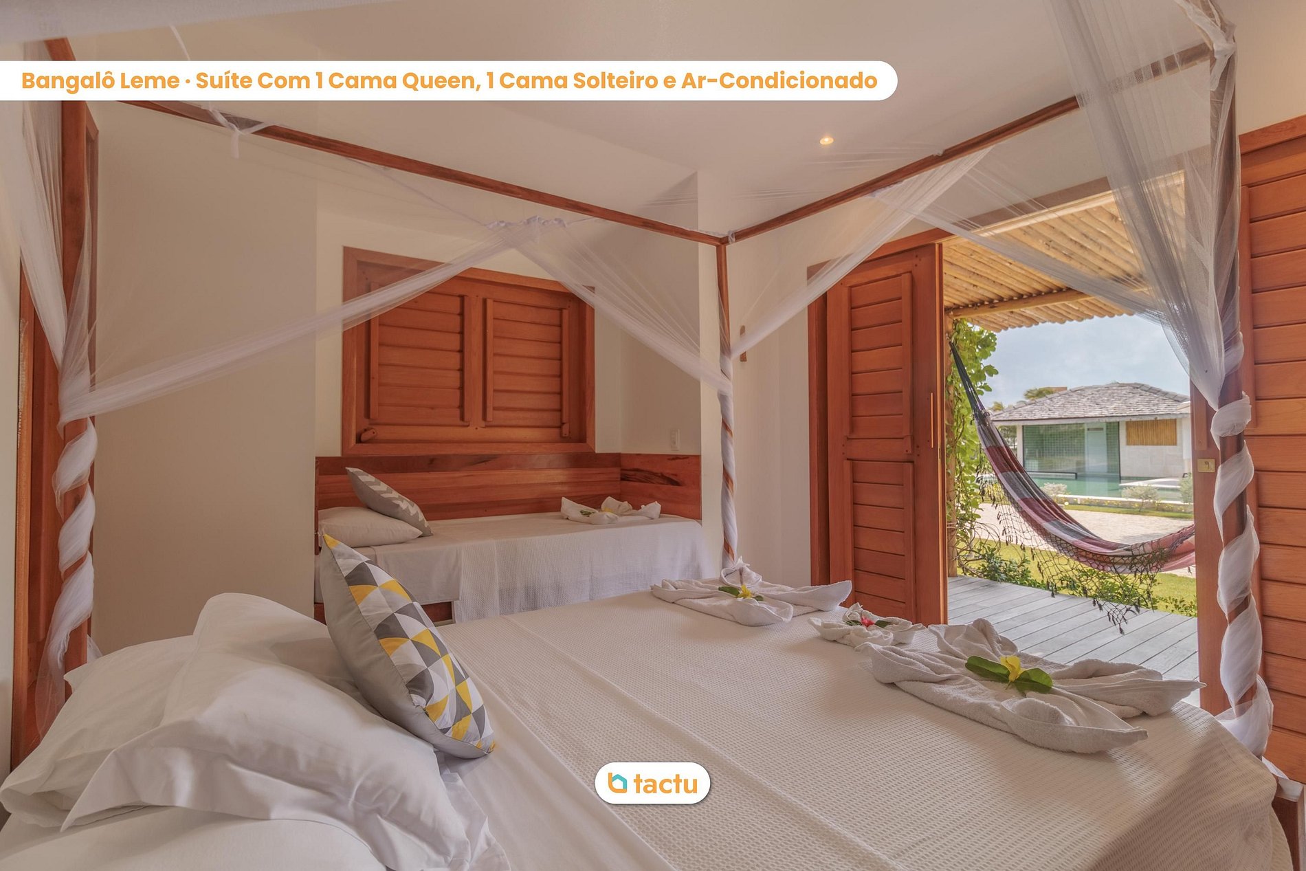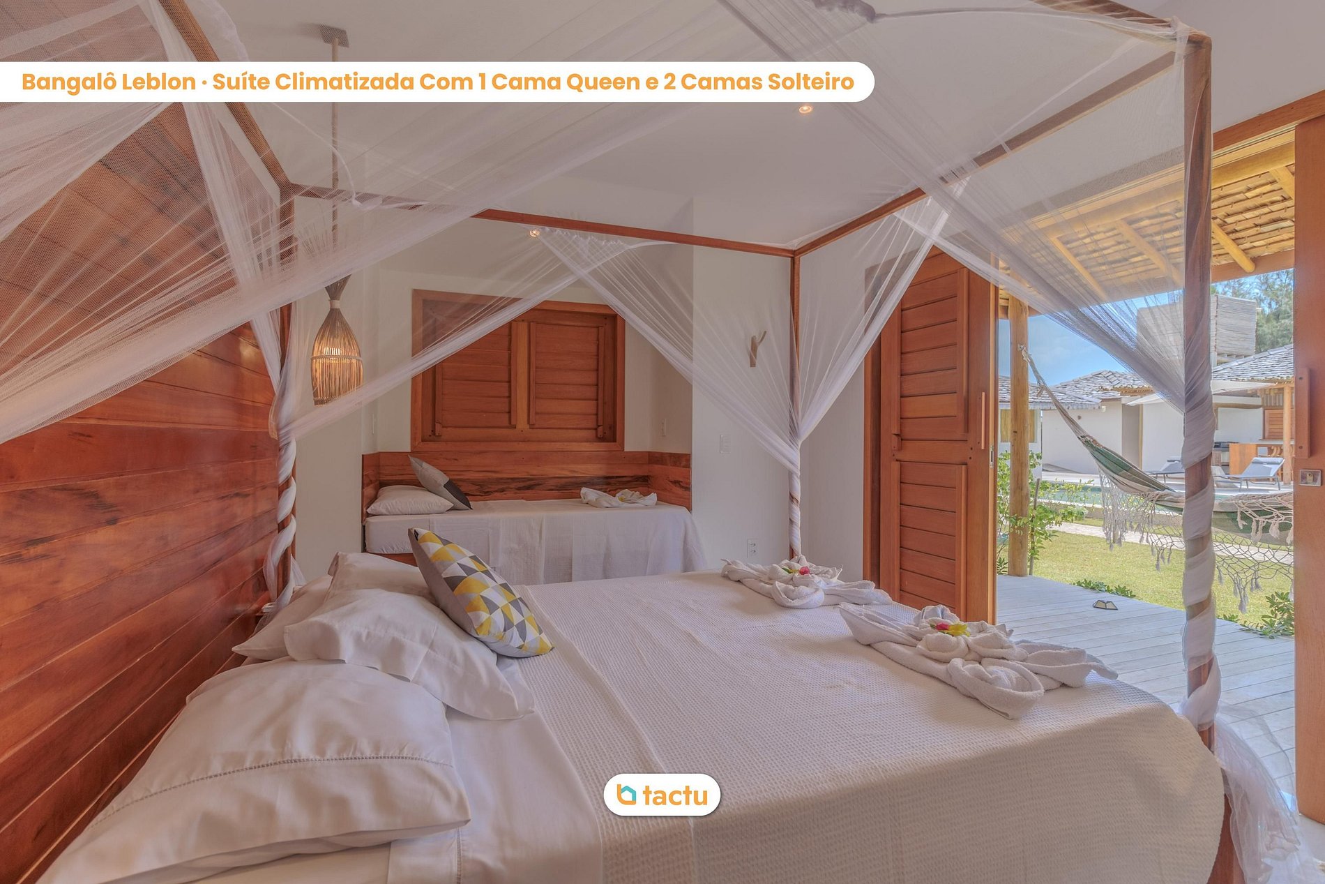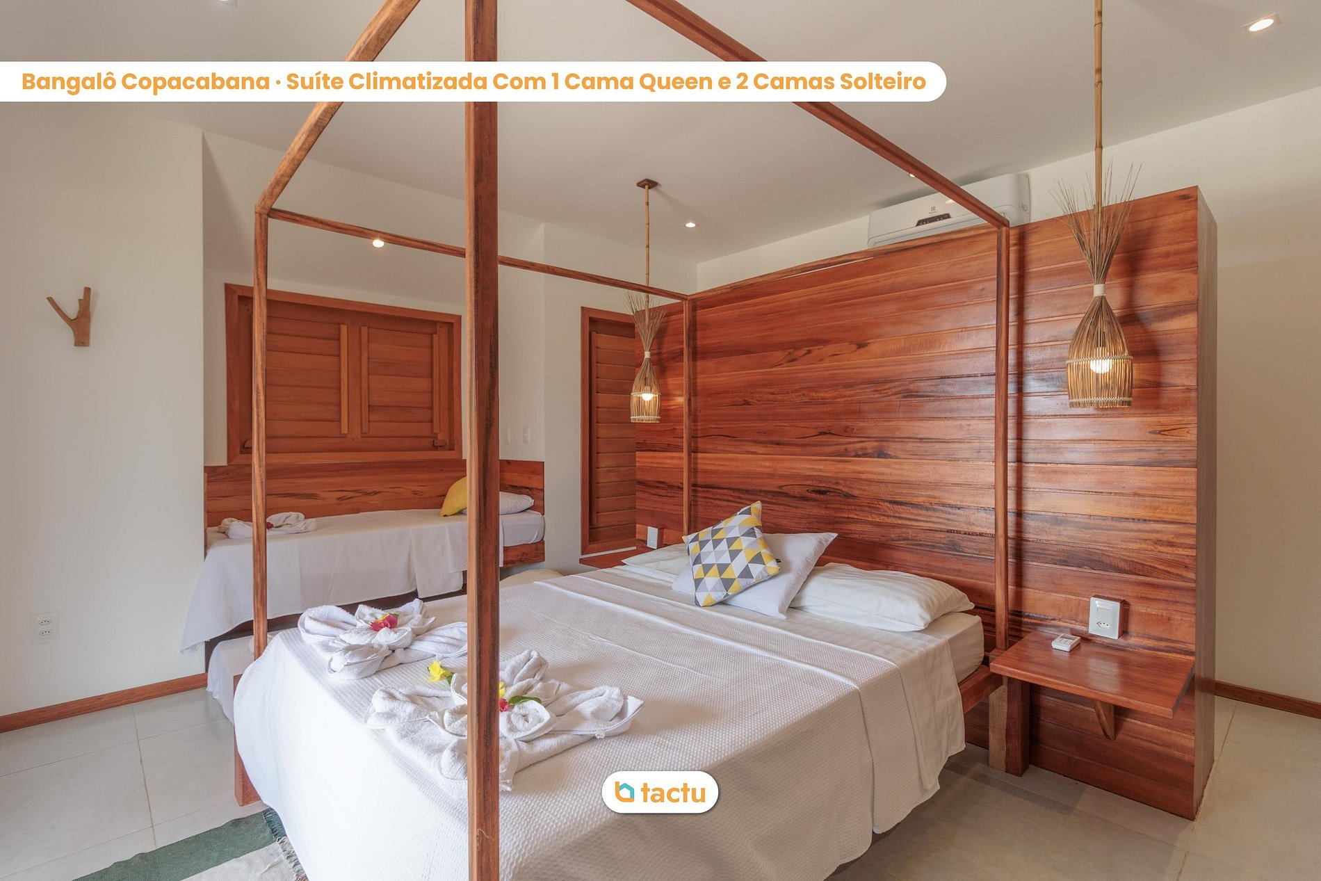 Dans les bungalows Leblon et Ipanema, vous trouverez un lit double confortable et UN lit simple. Dans les bungalows Leme, Flamengo, Copacabana et Barra, vous trouverez un lit double confortable et DEUX lits simples. Tous les lits disposent d'une literie neuve et de qualité.