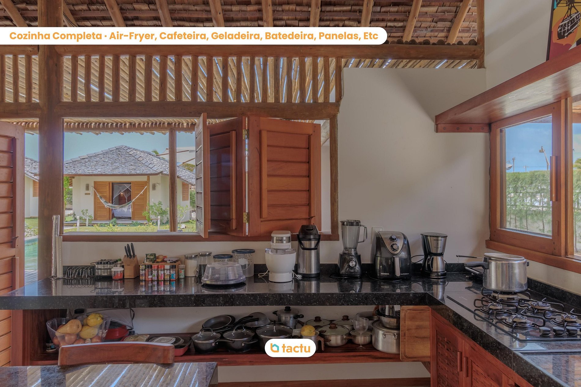 À côté de la piscine, vous disposerez d'une belle terrasse en bois intégrée au grand salon, qui comprend une cuisine, une grande Smart TV, une enceinte et des tables à manger. La cuisine est complète, avec un îlot gourmand, un barbecue et une cuisinière industrielle intégrés à un comptoir de granite, ainsi qu'un comptoir de bar pour des moments amusants.