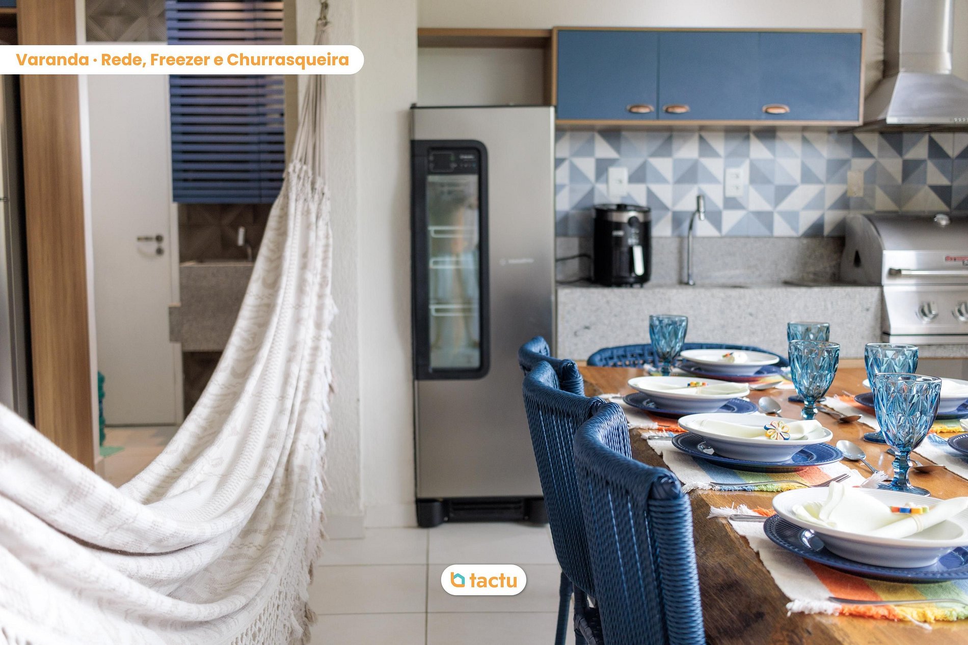 La terrasse gourmet est un vrai atout, avec un barbecue électrique avec hotte, un grand minibar, une grande friteuse à air et une grande table à manger avec vaisselle complète. Elle est intégrée à la cuisine et au salon, avec un aménagement intérieur pensé pour des espaces ouverts et connectés.
