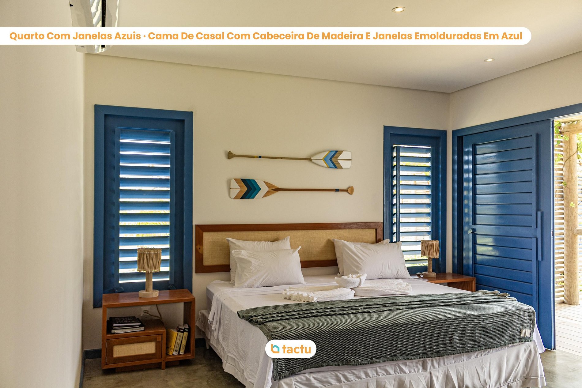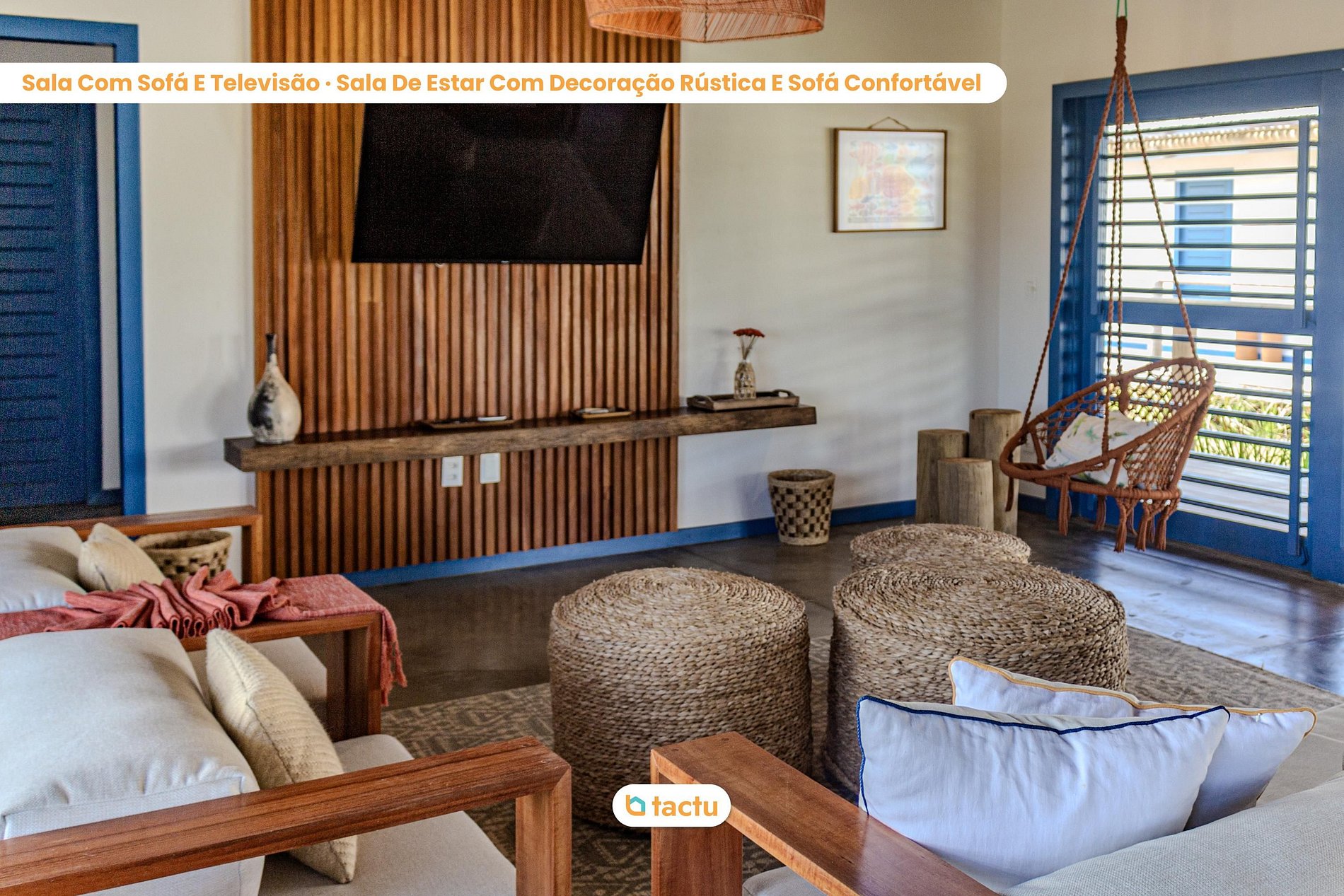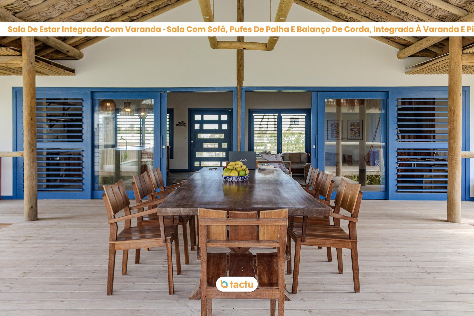 Située dans le luxueux condominium Jaguaribe Villas à Fortim, Casa Pipa est un véritable joyau architectural qui allie charme rustique et design moderne, offrant un maximum de confort et d'élégance. La façade, avec son toit de chaume et ses détails bleu marine, dégage une simplicité charmante qui contraste parfaitement avec le ciel clair et le vaste jardin.