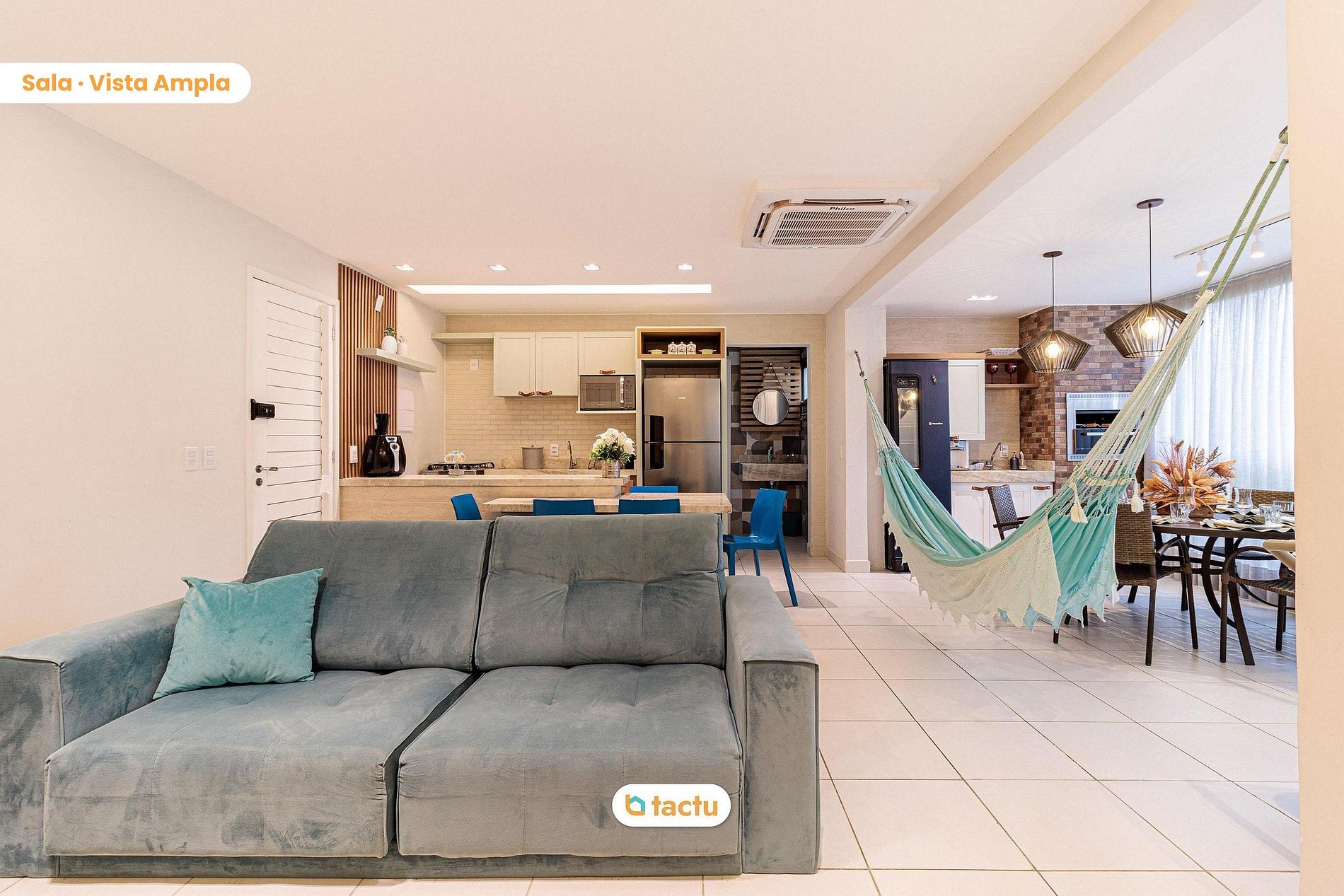 La cuisine est entièrement équipée, avec tout le nécessaire pour cuisiner facilement : cuisinière, four, grand réfrigérateur, micro-ondes et même une grande friteuse à air. Elle dispose aussi d’un comptoir pour le petit déjeuner ou le thé. Le salon est meublé avec du mobilier sur mesure de qualité, dispose d’un hamac près de la terrasse et d’un canapé-lit confortable, ainsi qu’une énorme TV connectée, parfaite pour une soirée cinéma en famille ou entre amis.