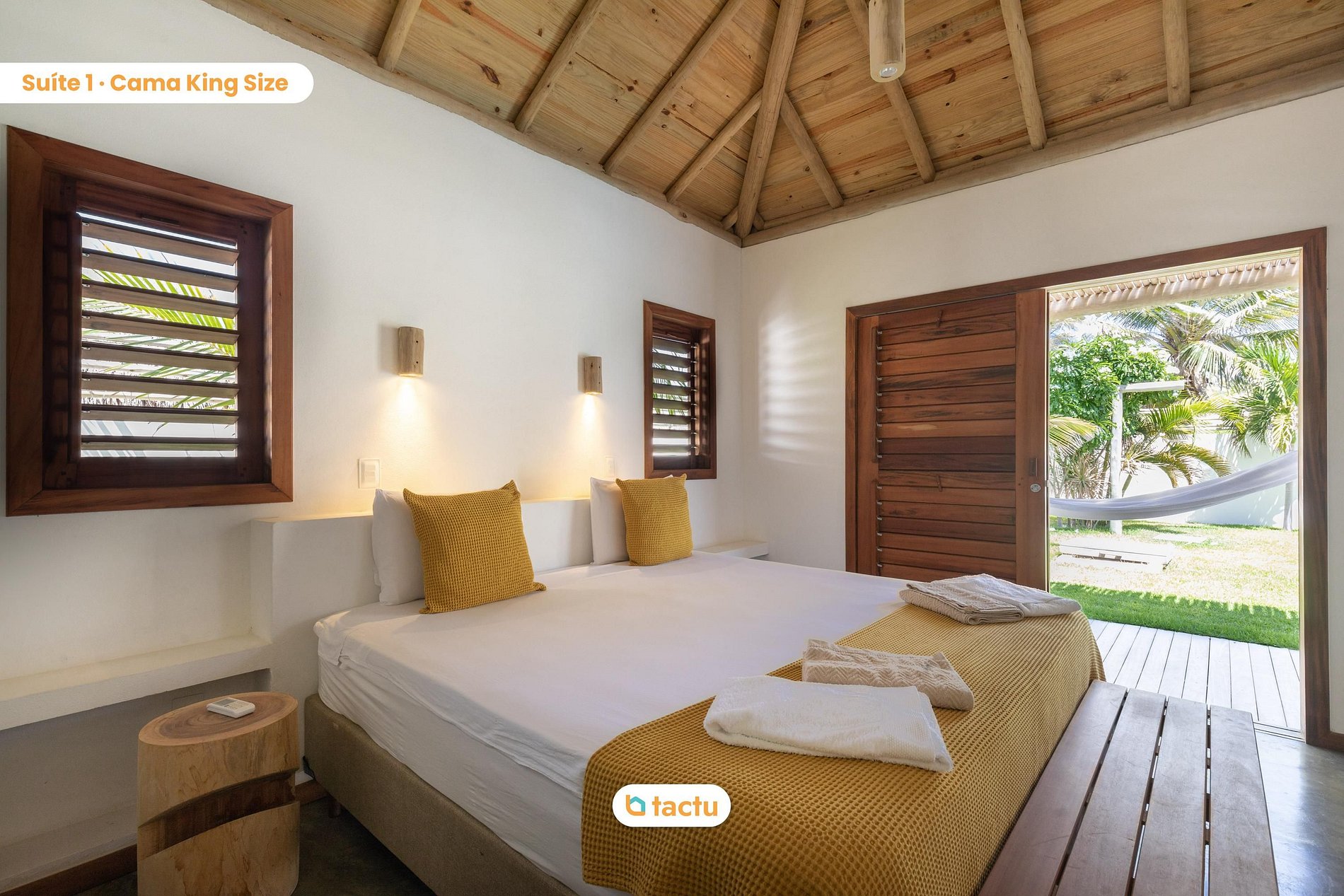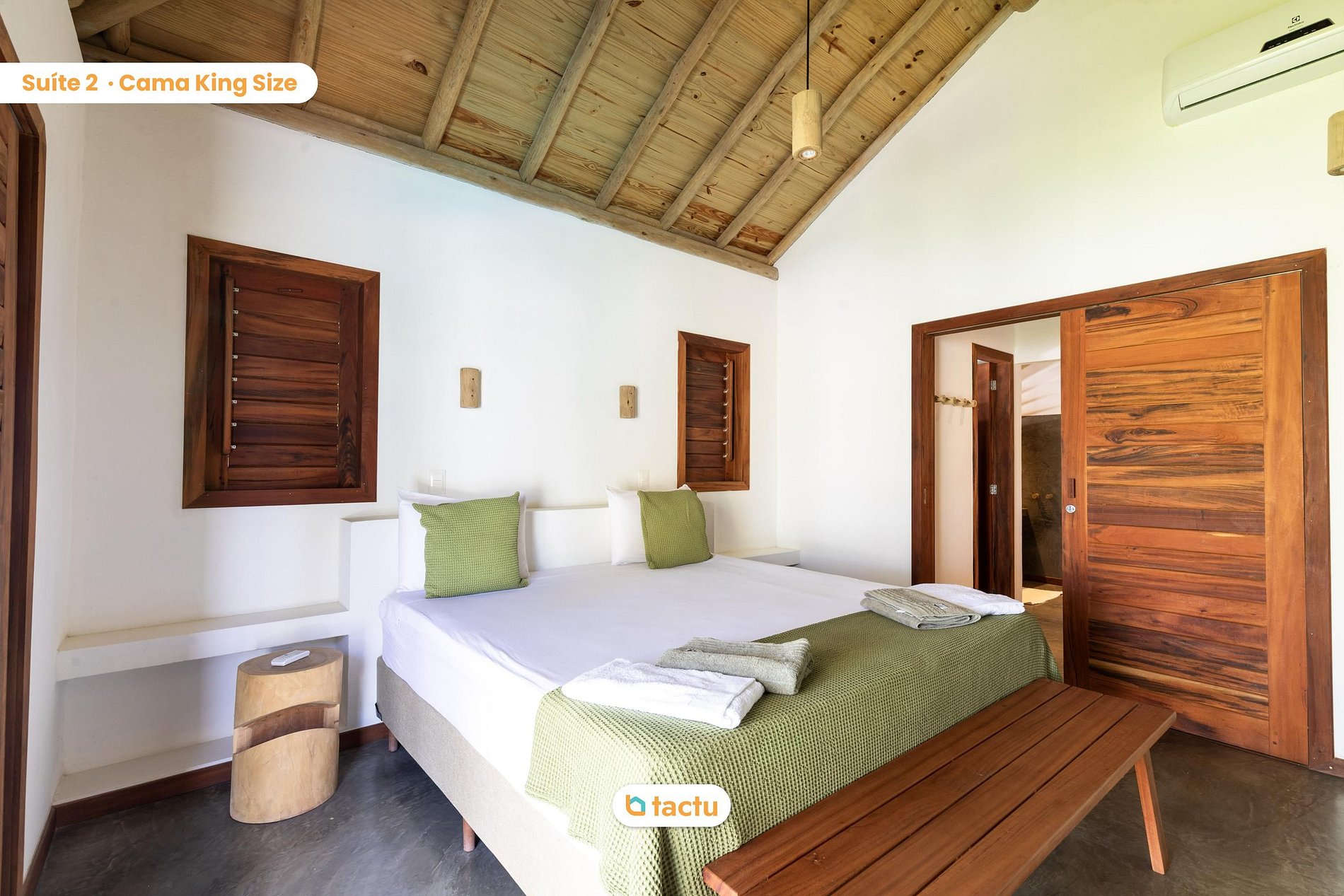 La maison dispose de quatre suites confortables, toutes avec entrée indépendante depuis l’extérieur et climatisées. Deux d’entre elles sont modulables et peuvent être préparées avec un lit king-size ou deux lits simples — idéales pour les familles ou groupes d’amis. Elles partagent une grande salle de bain fonctionnelle. Les deux autres suites sont équipées d’un lit king-size et offrent une intimité et un confort total.