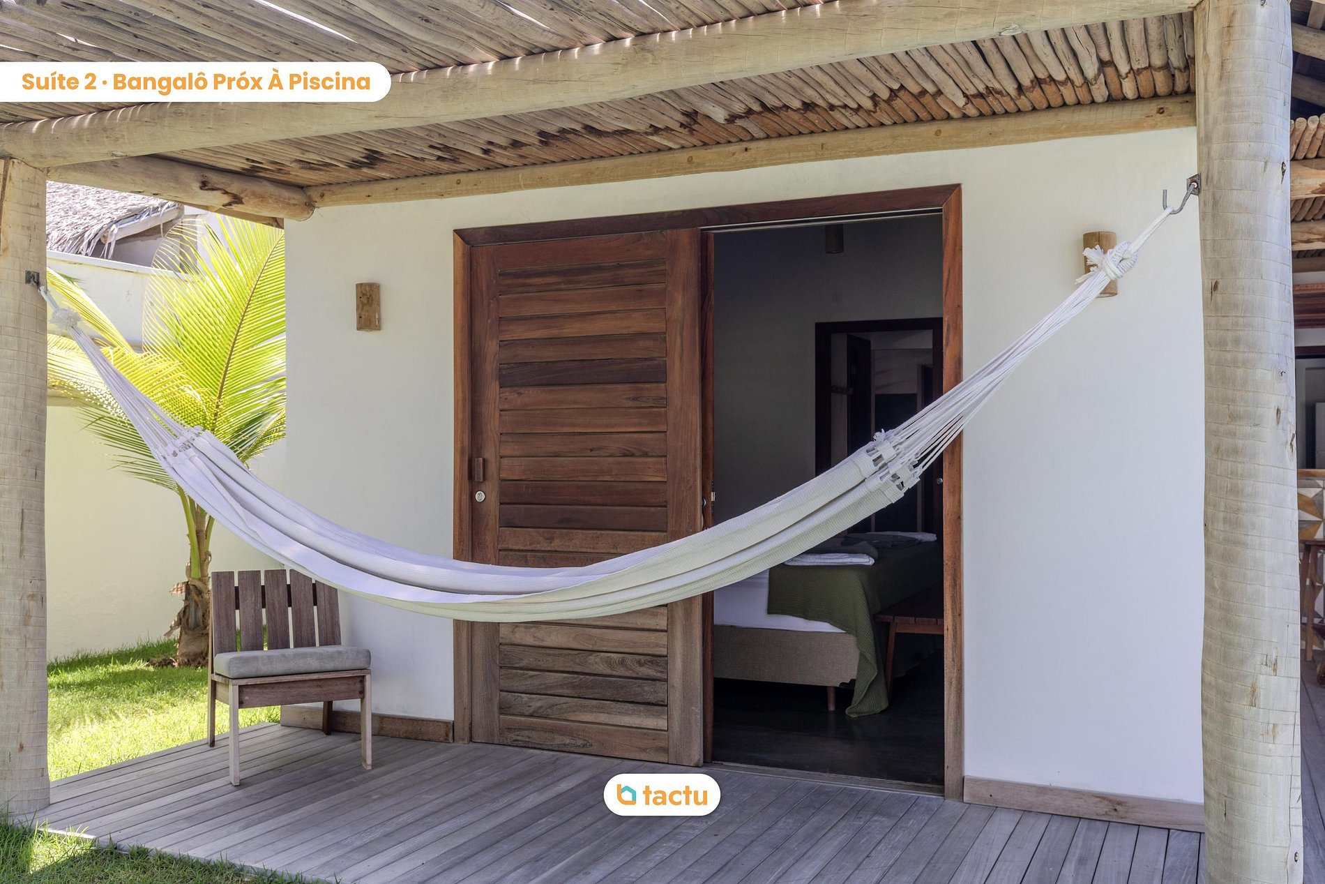 À l’extérieur, l’espace détente est le point fort : une piscine privée avec terrasse en bois, transats et un cadre parfait pour profiter du soleil. La terrasse couverte est une invitation au repos, avec hamacs, fauteuils et table pour les repas en plein air.