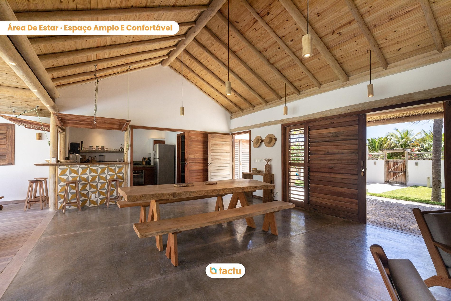 Dès l’entrée, vous serez accueilli par un salon spacieux et aéré, avec un plafond haut, des canapés confortables, une Smart TV et une intégration totale avec la terrasse et l’extérieur. La cuisine américaine attenante est entièrement équipée : réfrigérateur double, cuisinière, micro-ondes, four électrique, cafetière, filtre à eau et tous les ustensiles nécessaires pour votre séjour.